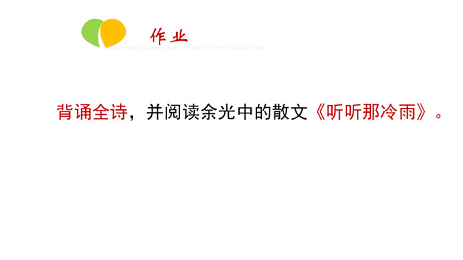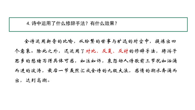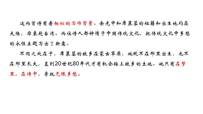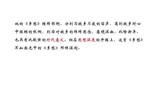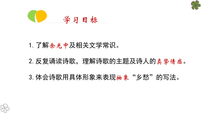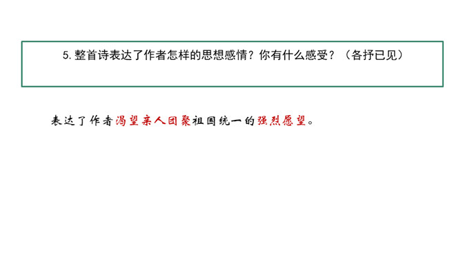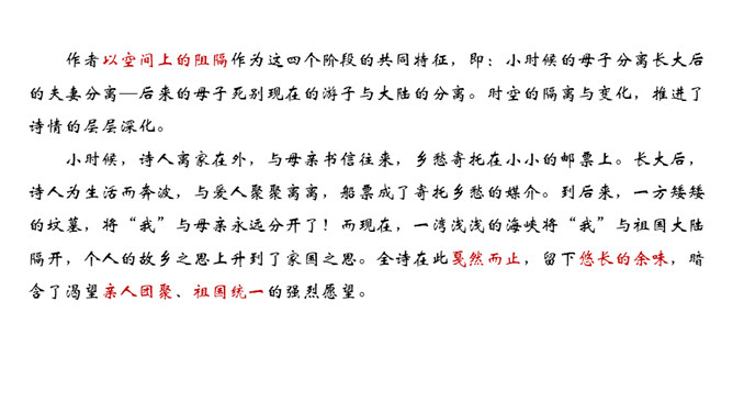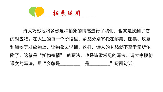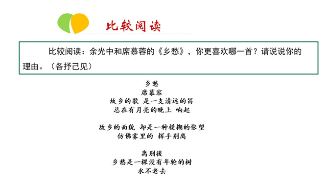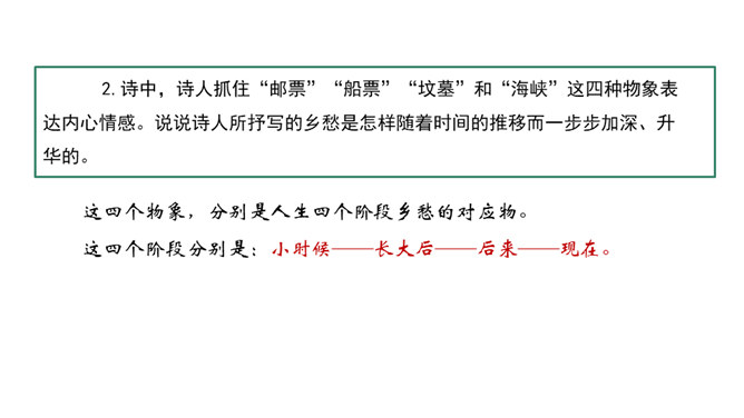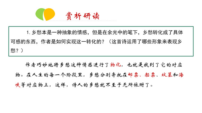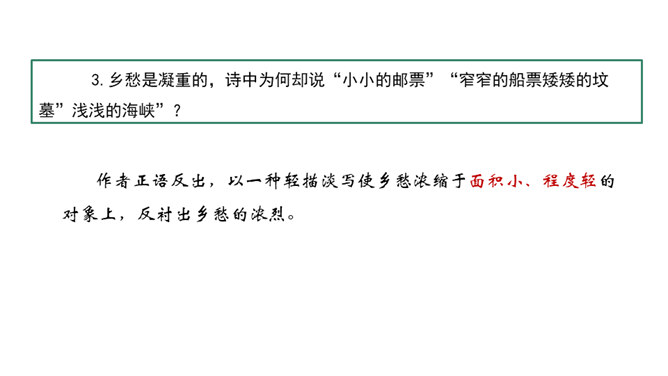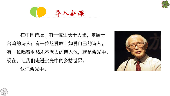 在中国诗坛,有一位生长于大陆,定居于台湾的诗人;有一位热爱故土如爱自已的诗人,有一位唱着乡愁永不老去的诗人他,就是余光中。现在,让我们走进余光中的乡愁世界。认识余光中。1.范读欣赏。2.以第一节为例,给诗歌划分朗读节奏。3.分四组以多种形式朗读。注意朗读的节奏、重音及诗人的感情。边读边思考:读完整首诗,你的头脑里印象最深的是哪几个词语?作者巧妙地将乡愁这种情感进行了物化,也就是找到了它的对应物。在人生的每一个阶段里,乡愁分别寄托在邮票、船票、坟墓和海峡等对应物上,这样,诗人的乡愁就不至于无所依附了。所属专题:乡愁ppt。