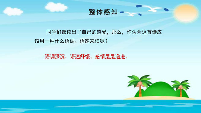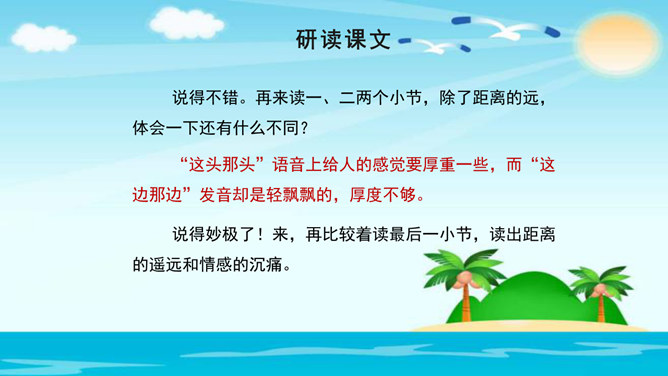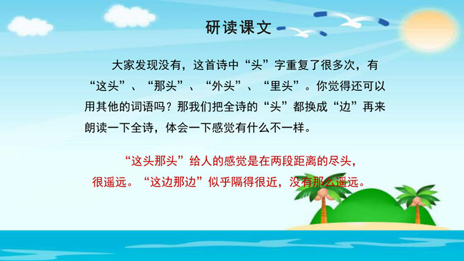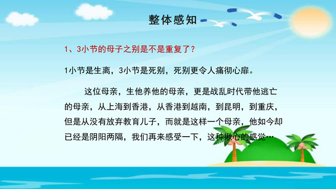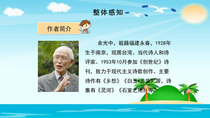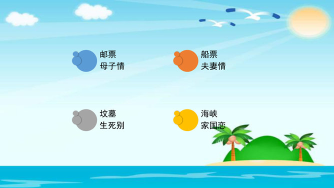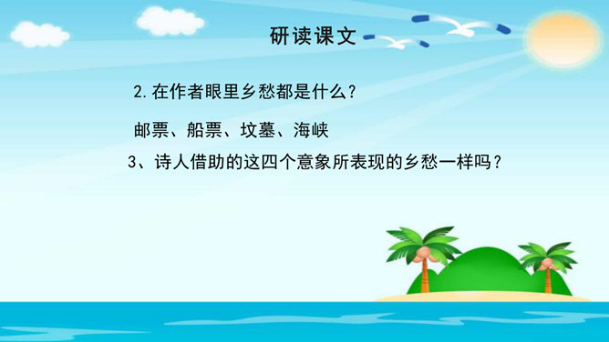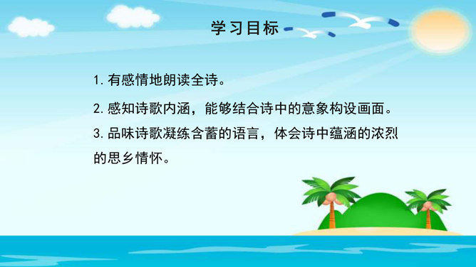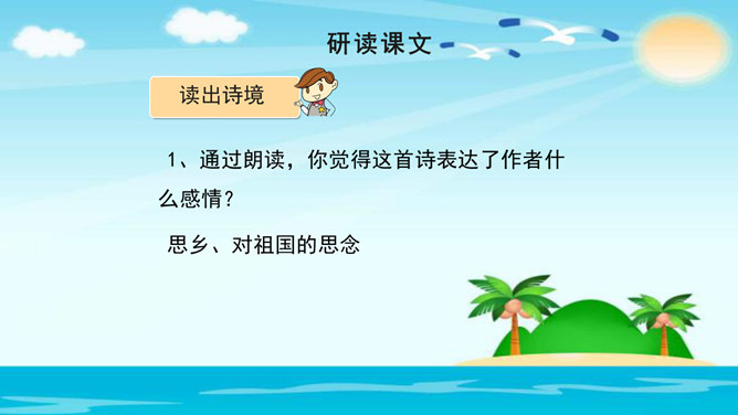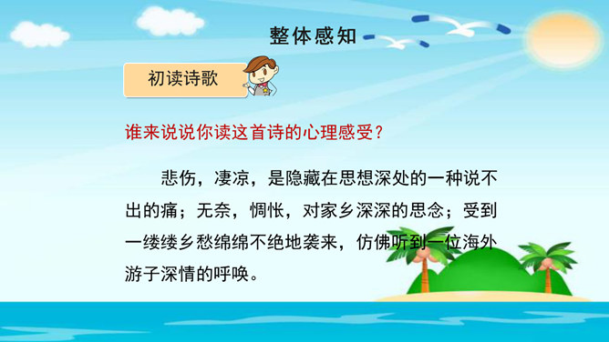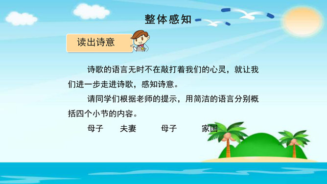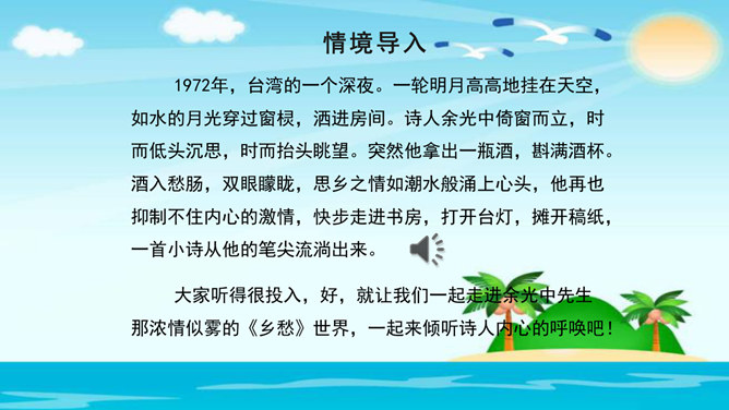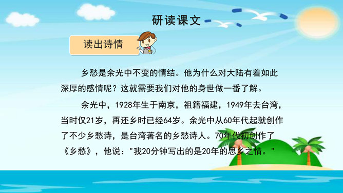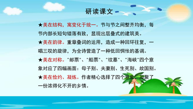 美在结构,寓变化于统一。节与节之间整齐均衡,每节内部长短句错落有致,显现出层叠式的建筑美。 美在韵律。重章叠词的运用,造成一种回环往复,一唱三叹的旋律,为全诗营造了一种低回惆怅的基调。 美在对称。"邮票"、"船票"、"坟墓"、"海峡"四个意象对应了四幅画面:母子别、夫妻别、生死别、故国别。 美在俭约、凝炼。作者精心选择了四个意象,凝聚了一份浓得化不开的乡情。诗可以读,可以唱,还可以演。我们来竞聘"摄影家"。你愿成为一位导演吗?如果让你把这首诗拍成"MV",你选哪一节?想一想,该拍什么画面?配什么音乐?所属专题:乡愁ppt。