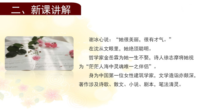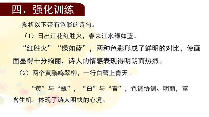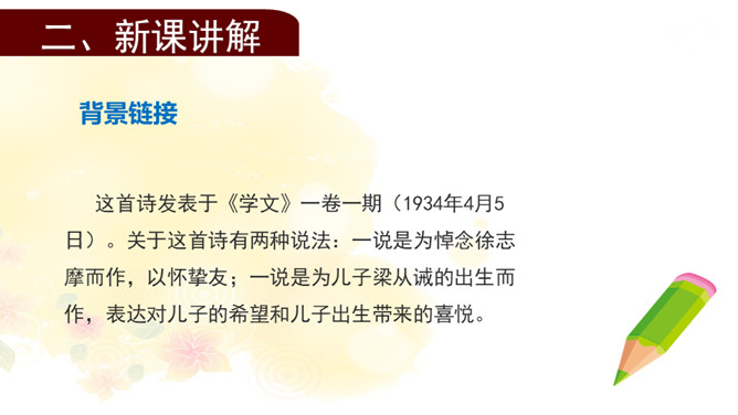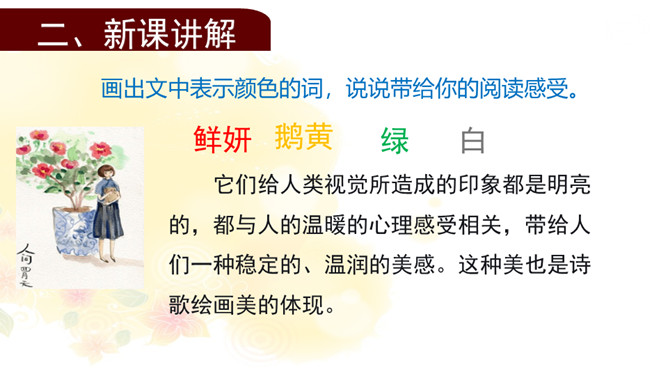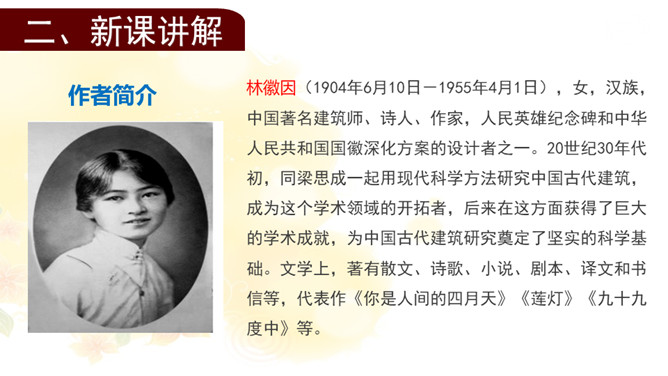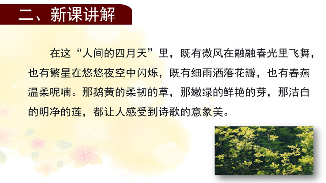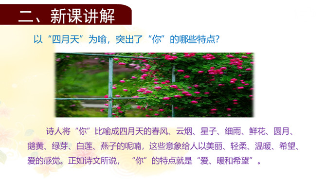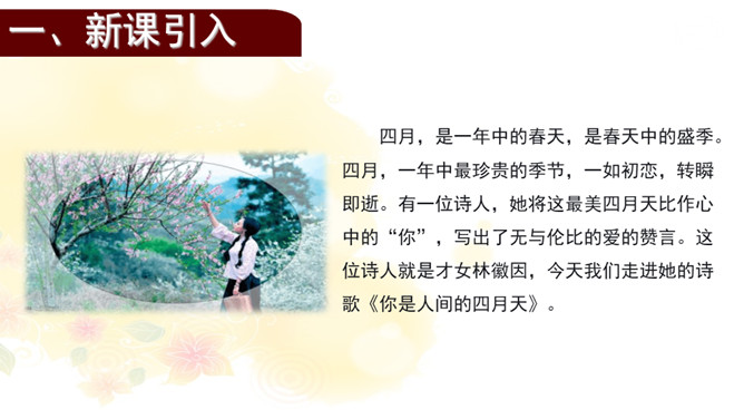 四月,是一年中的春天,是春天中的盛季。四月,一年中最珍贵的季节,一如初恋,转瞬即逝。有一位诗人,她将这最美四月天比作心中的“你”,写出了无与伦比的爱的赞言。这位诗人就是才女林徽因,今天我们走进她的诗歌。画出文中表示颜色的词,说说带给你的阅读感受。它们给人类视觉所造成的印象都是明亮的,都与人的温暖的心理感受相关,带给人们一种稳定的、温润的美感。这种美也是诗歌绘画美的体现。诗人穷尽了自己所有的想象,把心中所爱比喻成美妙无比、精妙绝伦的“四月天”,充分表现出爱之深、情之切、意之密。所属专题:你是人间四月天ppt。