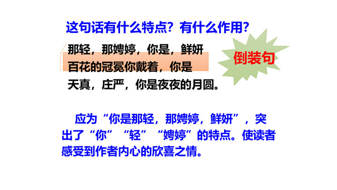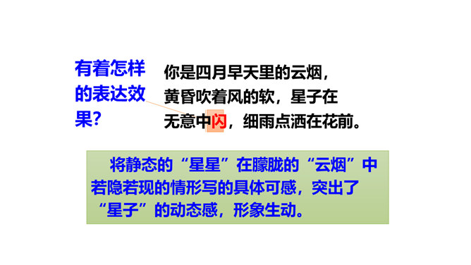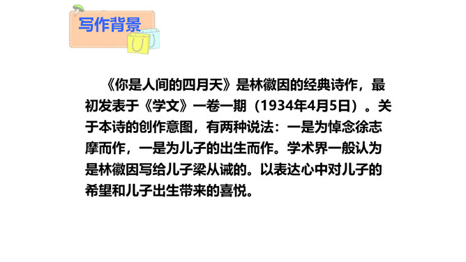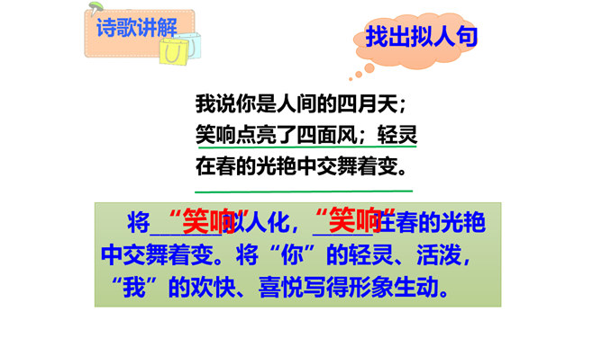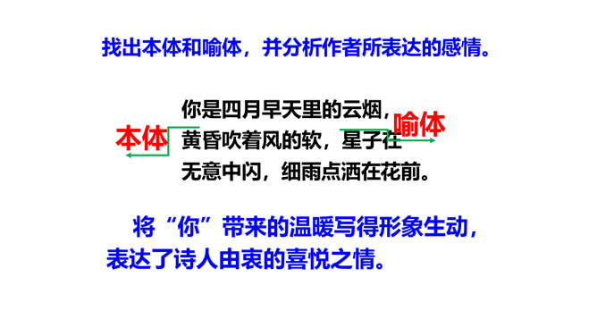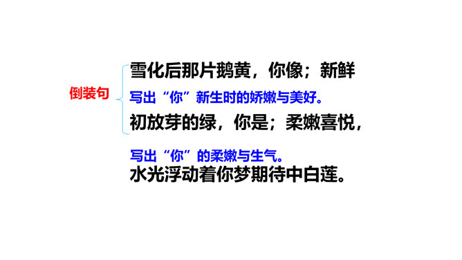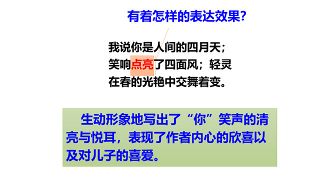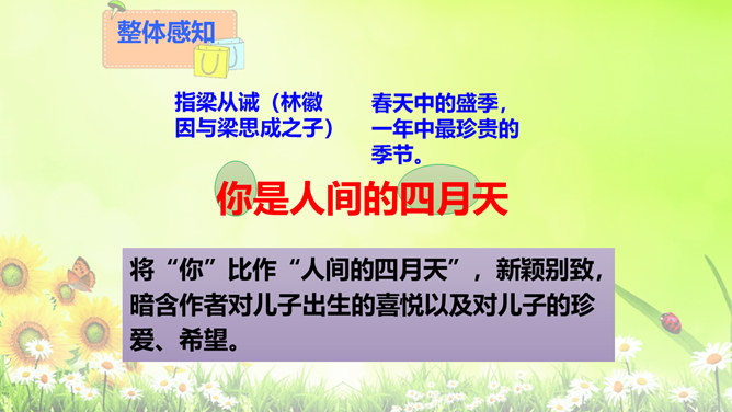 试分析诗歌第1~4节的结构特点。本诗第1至4节句式结构基本相同,形成复沓、对称的乐章;将心中的爱以一幅幅四月天丰美的画面作比,节奏明快;排比的句式将画面连接,情感如水面涟漪层层叠叠,荡漾起伏。本诗中,“你”字反复出现,试分析其表达效果。本诗中“你”字反复出现十一次,既突出了主题,又起到了“衬韵”的作用。“你”字的每一次出现,歌颂四月天,不仅是在向“你”倾诉,是一种形式美感与内容美感的深层次结合。这首诗给人的感觉很美。你认为它美在哪里?请作出简要赏析。所属专题:你是人间四月天ppt。