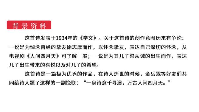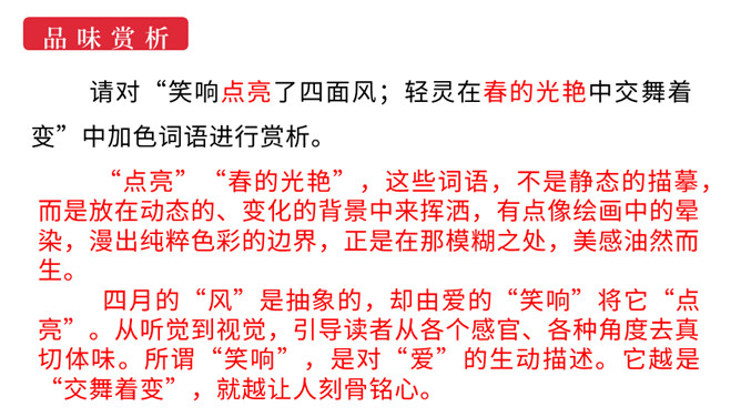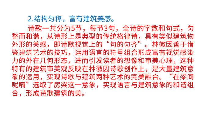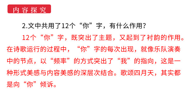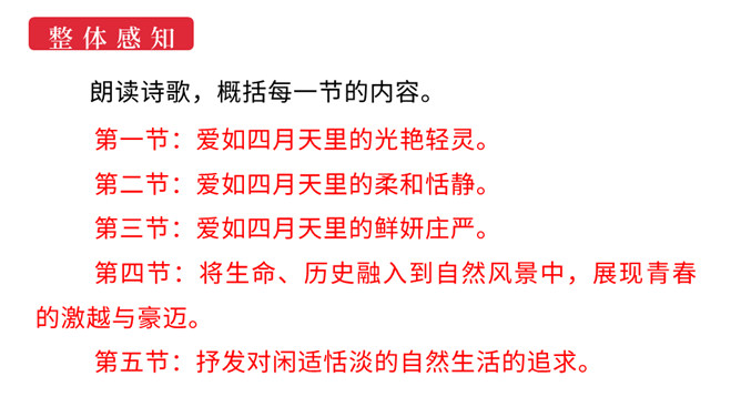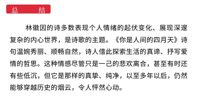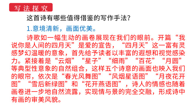 诗歌如一幅生动的画卷展现在我们的眼前。开篇“我说你是人间的四月天”是爱的宣告,“四月天”这一富有灵感梦幻温暖的意象,首先给予读者以丰富的遐想和视觉感染力。紧接着是“云烟”“星子”“细雨”“百花”“月圆”等典型性意象的自然组合,这样五个诗意的画面也映入我们的眼帘,依次是“春光风舞图”“风烟星语图”“月夜花开图”“雪后新绿图”和“花开燕语图”,诗人的情感也随着画卷进一步地自然流露,实现情与景的完全交融,形成诗中有画的审美风貌。所属专题:你是人间四月天ppt。