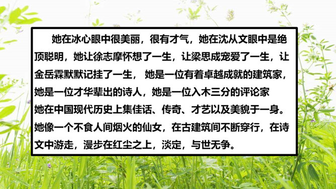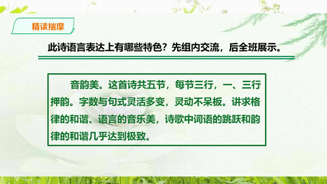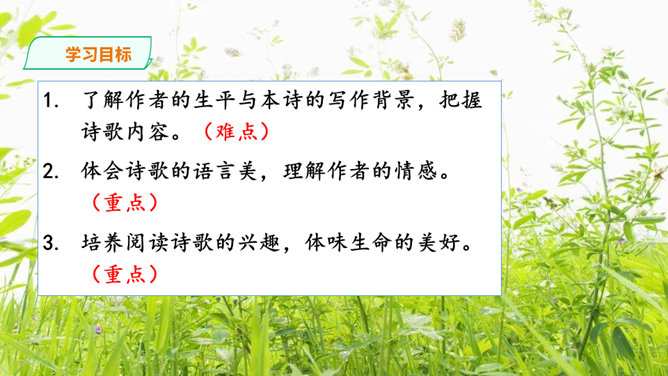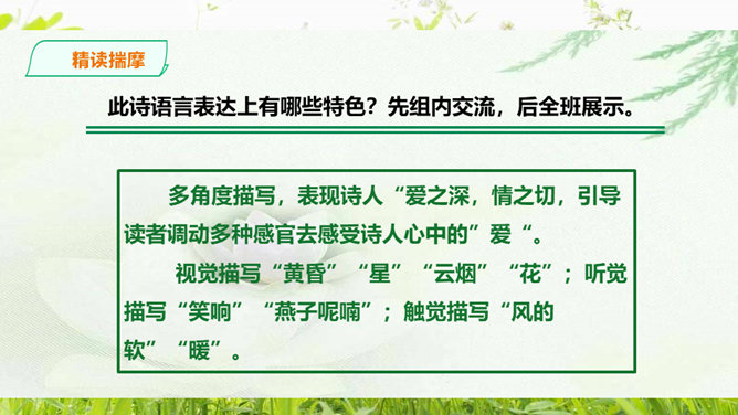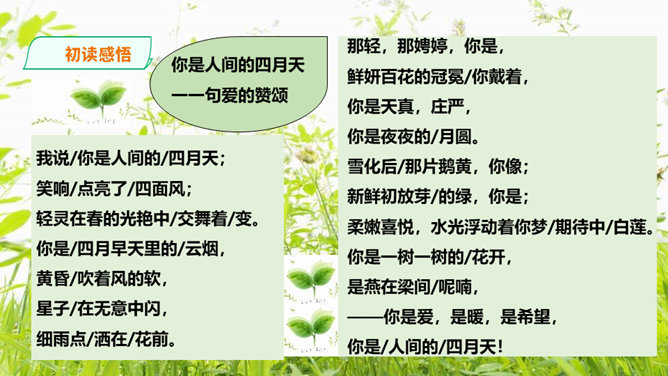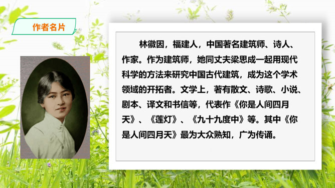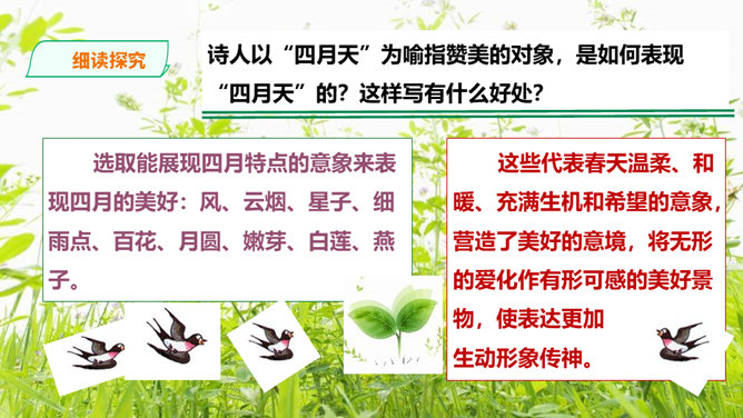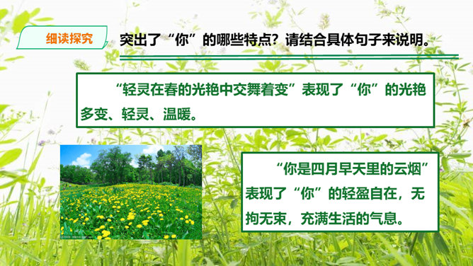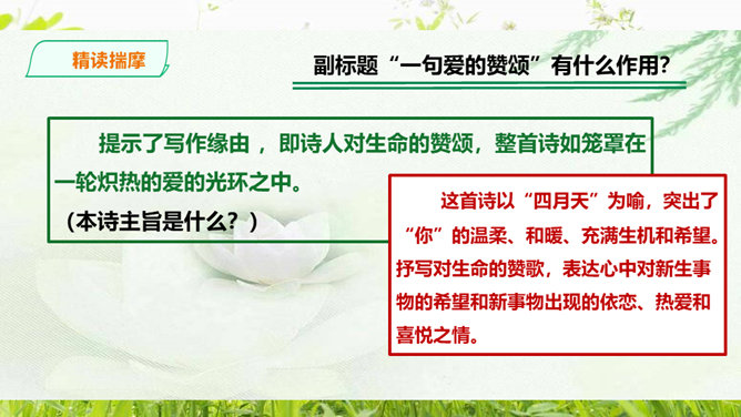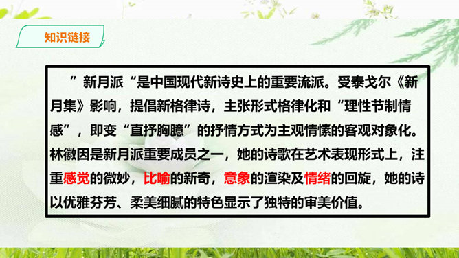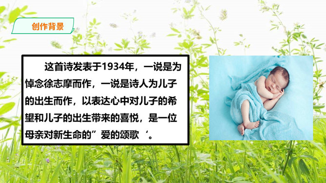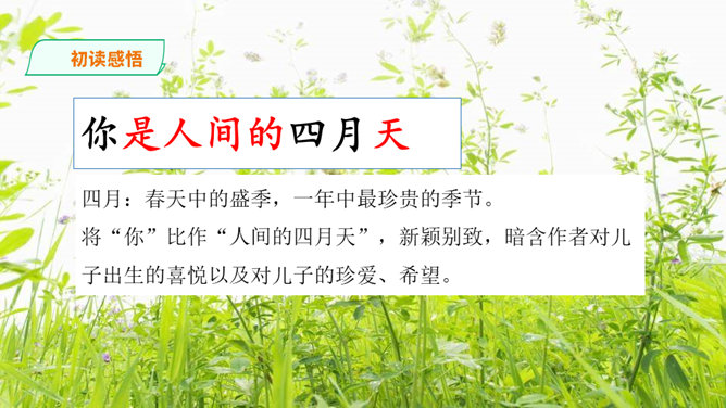 这首诗发表于1934年,一说是为悼念徐志摩而作,一说是诗人为儿子的出生而作,以表达心中对儿子的希望和儿子的出生带来的喜悦,是一位母亲对新生命的”爱的颂歌‘。突出了“你”的哪些特点?请结合具体句子来说明。“雪化后那片鹅黄,你像;新鲜初放芽的绿,你是;”两种明亮颜色,表现了“你”充满生机和希望。“你是一树一树的花开,是燕在梁间呢喃”表现了“你”的温柔、和暖。这首诗以“四月天”为喻,突出了“你”的温柔、和暖、充满生机和希望。抒写对生命的赞歌,表达心中对新生事物的希望和新事物出现的依恋、热爱和喜悦之情。所属专题:你是人间四月天ppt。