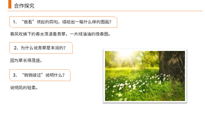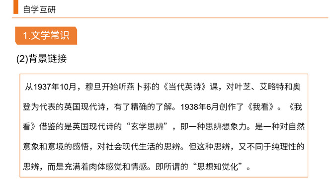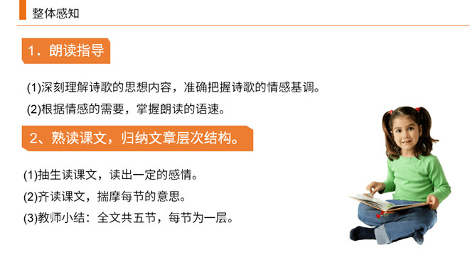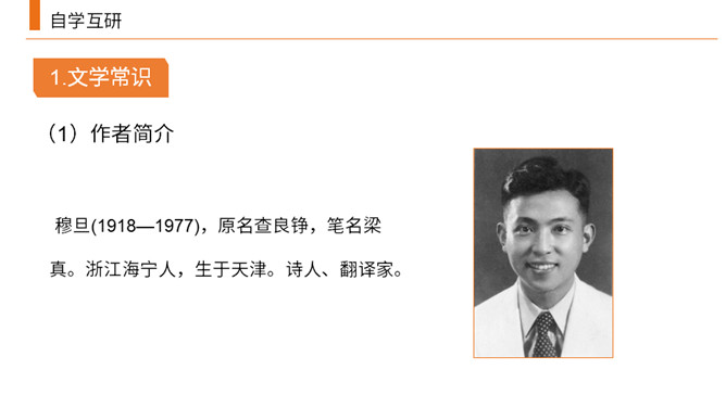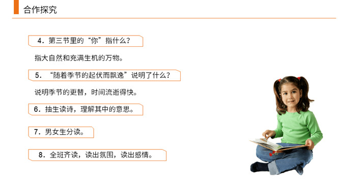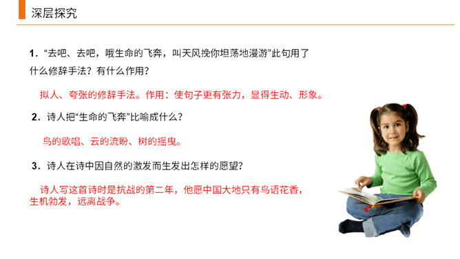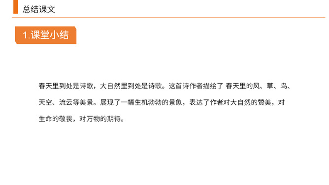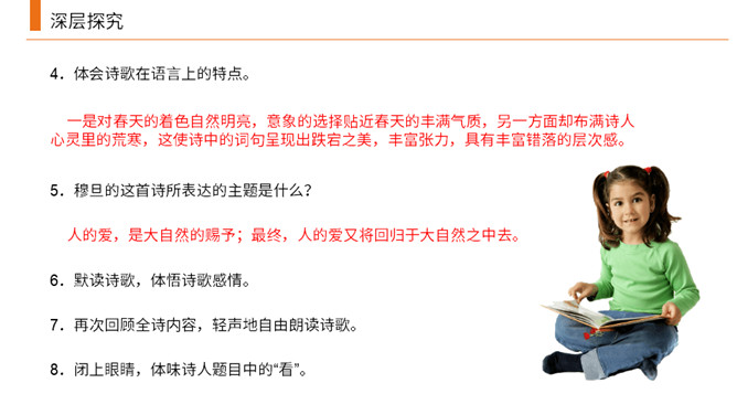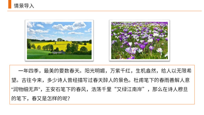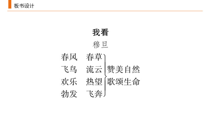 一年四季,最美的要数春天。阳光明媚,万紫千红,生机盎然,给人以无限希望。古往今来,多少诗人曾经描写过春天醉人的景色。杜甫笔下的春雨善解人意“润物细无声”,王安石笔下的春风,浩荡千里“又绿江南岸”,那么在诗人穆旦的笔下,春又是怎样的呢?1.朗读指导:(1)深刻理解诗歌的思想内容,准确把握诗歌的情感基调。(2)根据情感的需要,掌握朗读的语速。2、熟读课文,归纳文章层次结构。(1)抽生读课文,读出一定的感情。(2)齐读课文,揣摩每节的意思。(3)教师小结:全文共五节,每节为一层。所属专题:我看ppt。