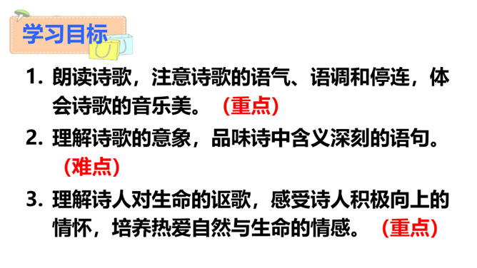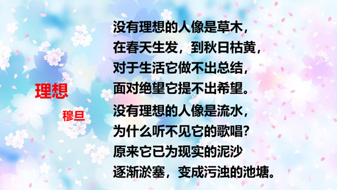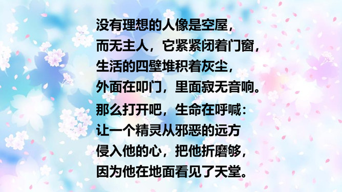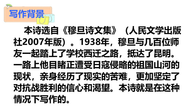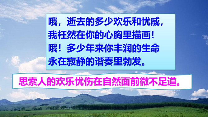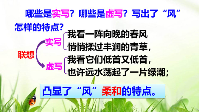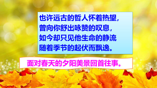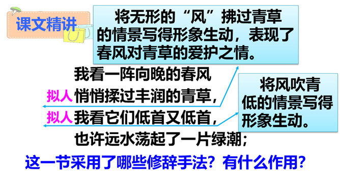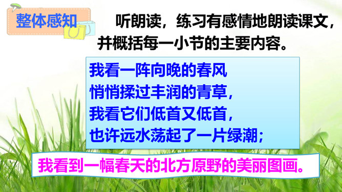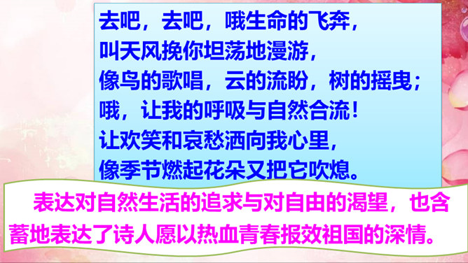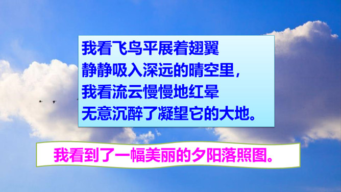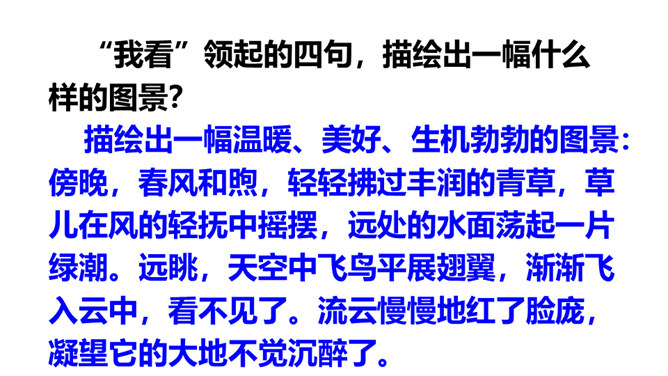 “我看”领起的四句,描绘出一幅什么样的图景?描绘出一幅温暖、美好、生机勃勃的图景:傍晚,春风和煦,轻轻拂过丰润的青草,草儿在风的轻抚中摇摆,远处的水面荡起一片绿潮。远眺,天空中飞鸟平展翅翼,渐渐飞入云中,看不见了。流云慢慢地红了脸庞,凝望它的大地不觉沉醉了。“你”,指诗人热爱着的这片热土。在诗人的眼里,“你”的生命永远都是“丰润”的。即使你如今正遭受苦难,也在如这春天般优美的环境中蓬勃生发。运用反复的修辞手法,使用祈使句句式,突出强调生命热情被自然的活力点燃时的兴奋和惊喜之情。所属专题:我看ppt。
