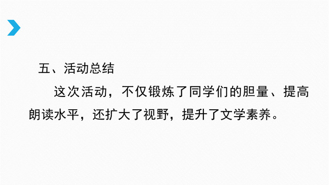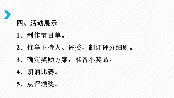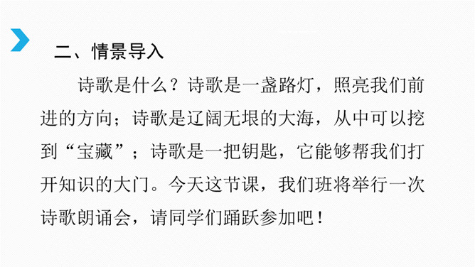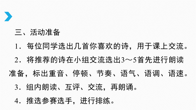 通过本次活动,提高学生的朗读能力和水平。领悟朗读技巧:停顿、重音及情感。增强对诗歌的兴趣。诗歌是什么?诗歌是一盏路灯,照亮我们前进的方向;诗歌是辽阔无垠的大海,从中可以挖到“宝藏”;诗歌是一把钥匙,它能够帮我们打开知识的大门。今天这节课,我们班将举行一次诗歌朗诵会,请同学们踊跃参加吧!每位同学选出几首你喜欢的诗,用于课上交流。将推荐的诗在小组交流选出3~5首先进行朗读准备,标出重音、停顿、节奏、语气、语调、语速。组内朗读、互评、交流,再朗诵。推选参赛选手,进行排练。所属专题:自由朗诵ppt。