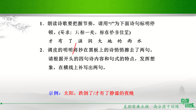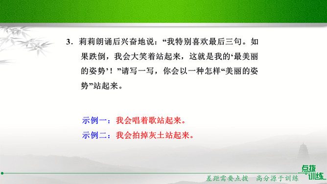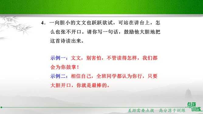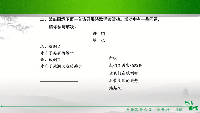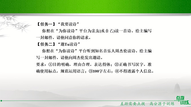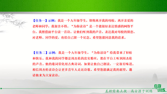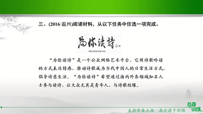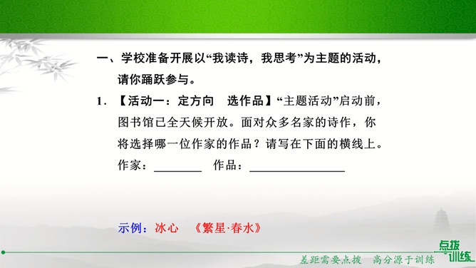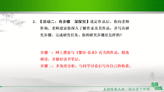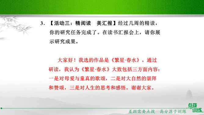 学校准备开展以“我读诗,我思考”为主题的活动,请你踊跃参与。选定作品后,你向老师咨询。老师建议你深入了解作家及其作品,并写出研究步骤,完成研究任务。你的研究步骤是怎样的?步骤一:网上搜索与《繁星·春水》有关的作品,精选研读,并做好读书笔记。步骤二:多角度分析,与同学讨论后写出自己的收获。经过几周的精读,你的研究任务完成了。在读书汇报会上,请你展示研究成果。通过研读,我认为《繁星·春水》大致包括三方面内容:一是对母爱与童真的歌颂,二是对大自然的崇拜和赞颂,三是对人生的思考和感悟。谢谢大家。所属专题:自由朗诵ppt。