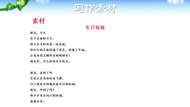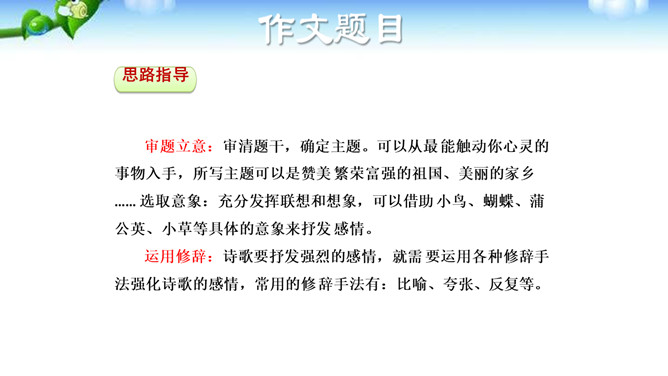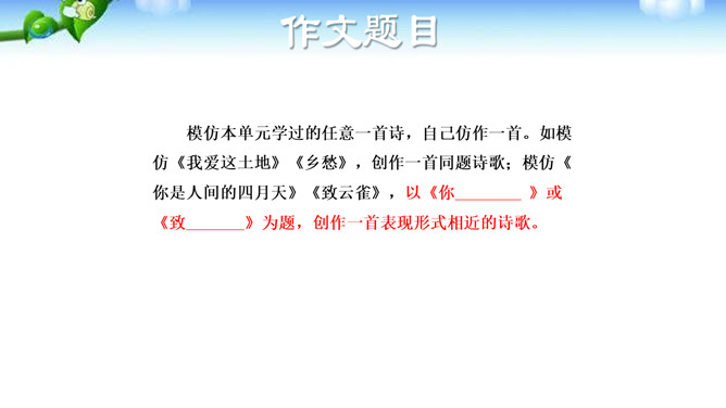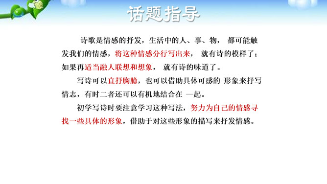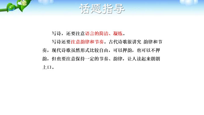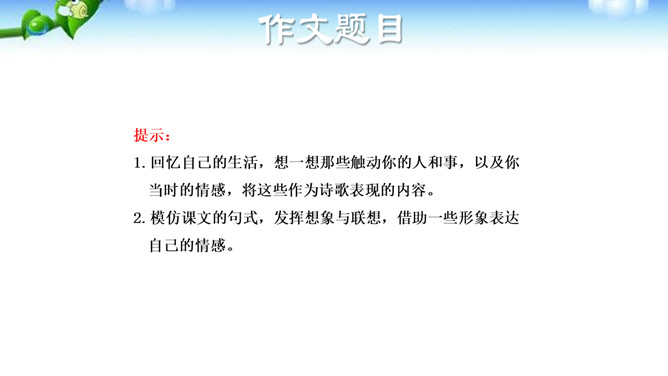 诗歌是情感的抒发,生活中的人、事、物, 都可能触发我们的情感,将这种情感分行写出来, 就有诗的模样了;如果再适当融人联想和想象, 就有诗的味道了。写诗可以直抒胸臆,也可以借助具体可感的 形象来抒写情志,有时二者还可以有机地结合在 —起。初学写诗时要注意学习这种写法,努力为自己的情感寻找一些具体的形象,借助于对这些形象的描写来抒发情感。写诗,还要注意语言的简洁、凝练。写诗还要注意韵律和节奏。古代诗歌很讲究 韵律和节奏,现代诗歌虽然形式比较自由,可以押韵,也可以不押韵,但也要注意保持一定的节奏、韵律。所属专题:尝试创作诗歌ppt。