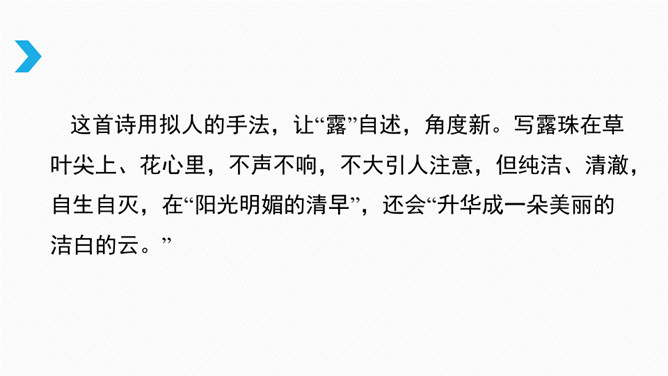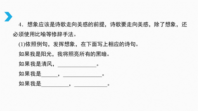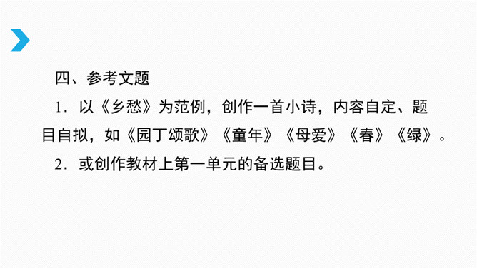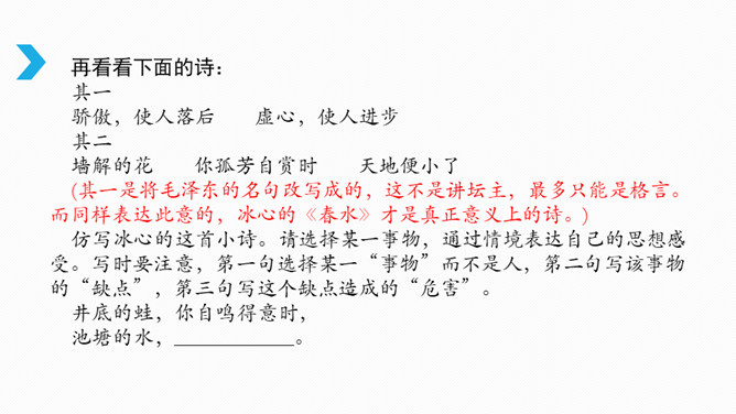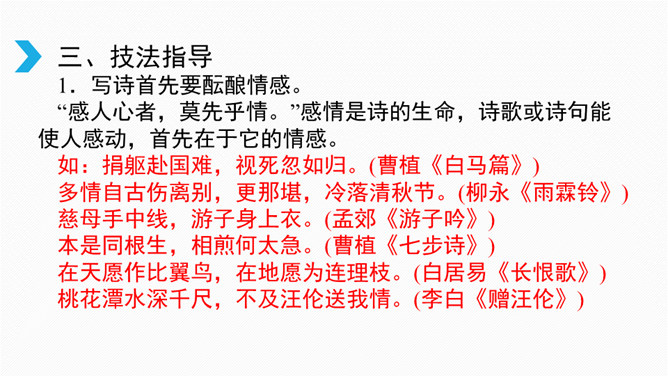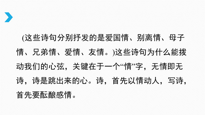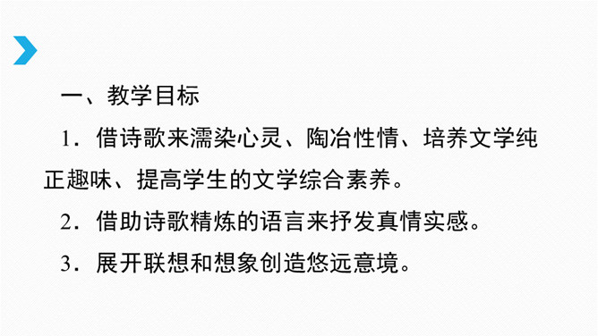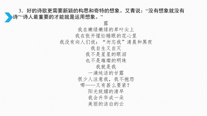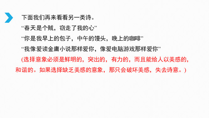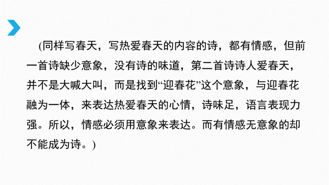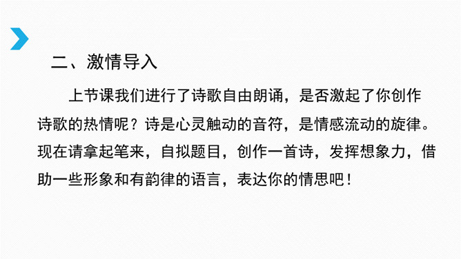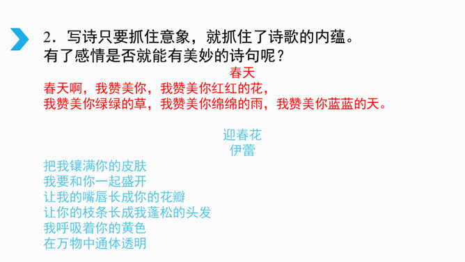 借诗歌来濡染心灵、陶冶性情、培养文学纯正趣味、提高学生的文学综合素养。借助诗歌精炼的语言来抒发真情实感。展开联想和想象创造悠远意境。上节课我们进行了诗歌自由朗诵,是否激起了你创作诗歌的热情呢?诗是心灵触动的音符,是情感流动的旋律。现在请拿起笔来,自拟题目,创作一首诗,发挥想象力,借助一些形象和有韵律的语言,表达你的情思吧!同样写春天,写热爱春天的内容的诗,都有情感,但前一首诗缺少意象,没有诗的味道,第二首诗诗人爱春天,并不是大喊大叫,而是找到“迎春花”这个意象,与迎春花融为一体。所属专题:尝试创作诗歌ppt。