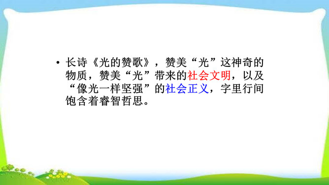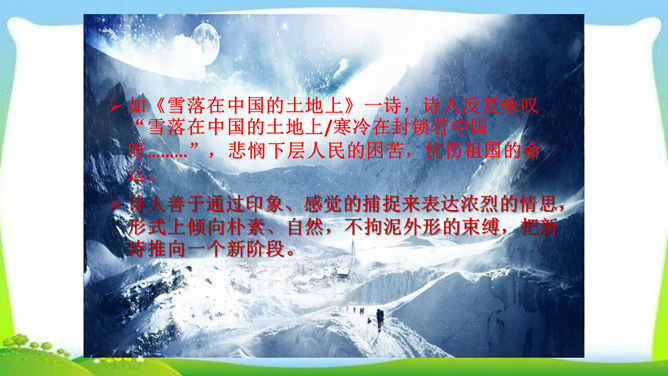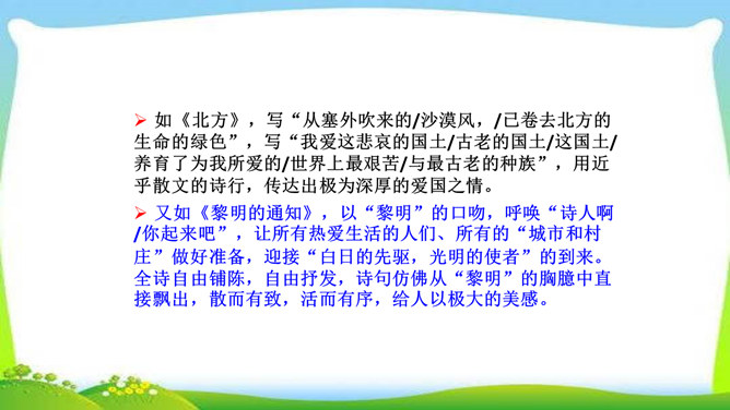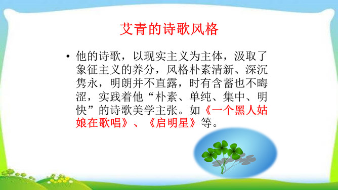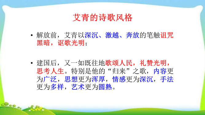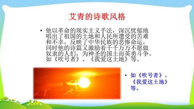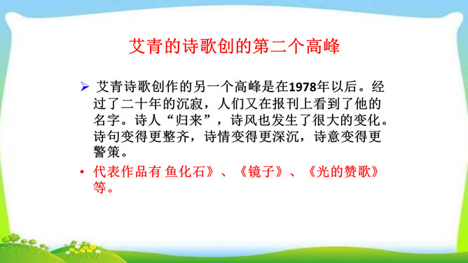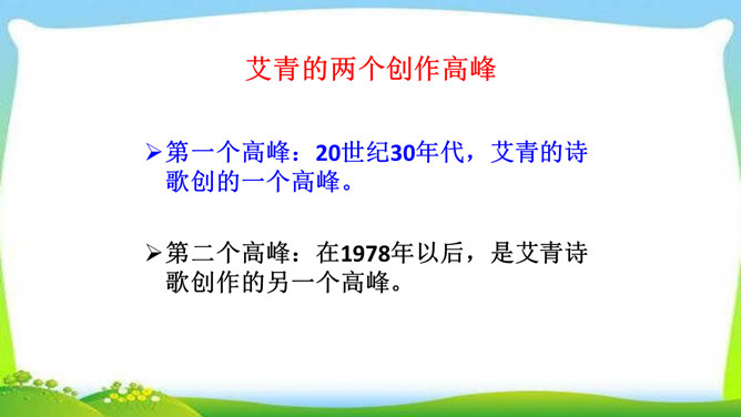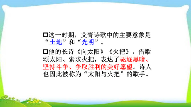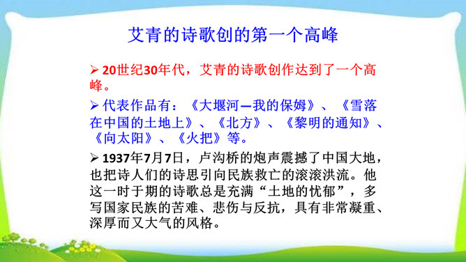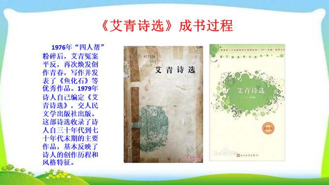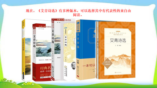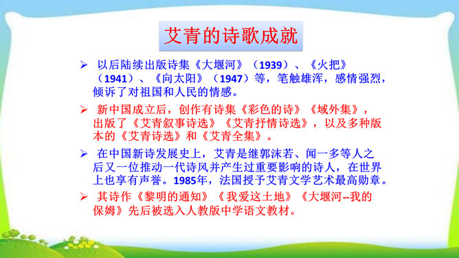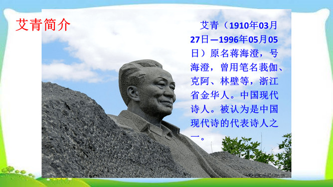 艾青(1910年03月27日—1996年05月05日)原名蒋海澄,号海澄,曾用笔名莪伽、克阿、林壁等,浙江省金华人。中国现代诗人。被认为是中国现代诗的代表诗人之一。以后陆续出版诗集《大堰河》(1939)、《火把》(1941)、《向太阳》(1947)等,笔触雄浑,感情强烈,倾诉了对祖国和人民的情感。新中国成立后,创作有诗集《彩色的诗》《域外集》,出版了《艾青叙事诗选》《艾青抒情诗选》,以及多种版本的《艾青诗选》和《艾青全集》。在中国新诗发展史上,艾青是继郭沫若、闻一多等人之后又一位推动一代诗风并产生过重要影响的诗人。所属专题:艾青诗选如何读诗ppt。