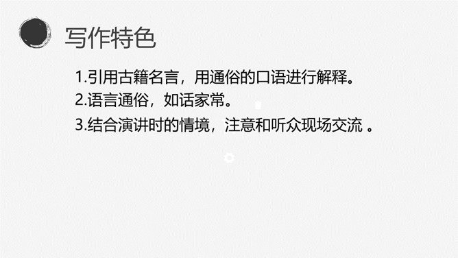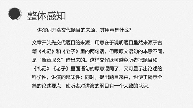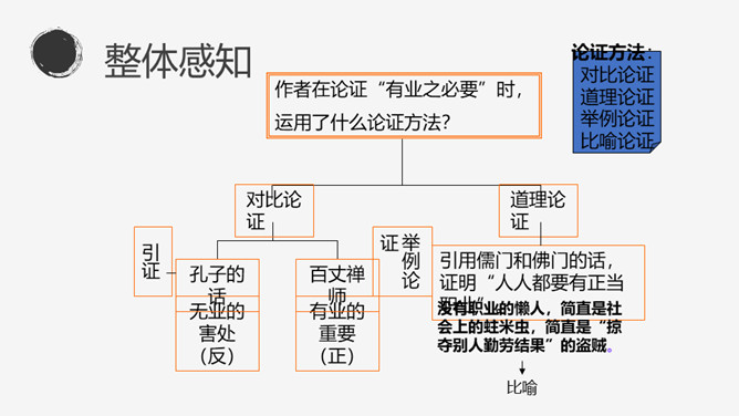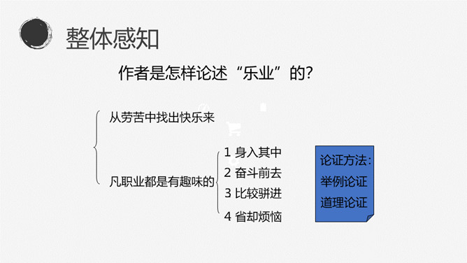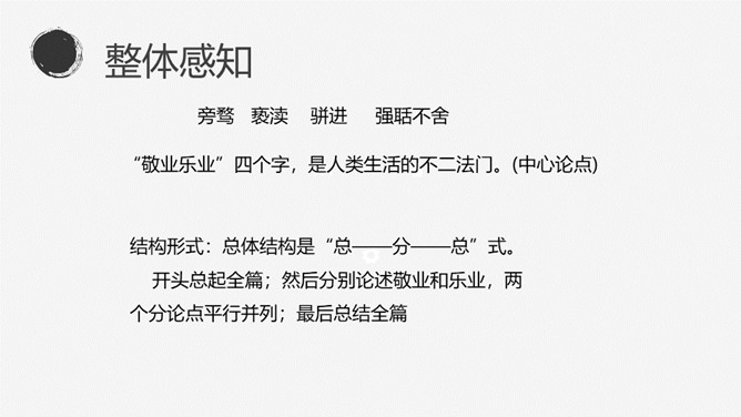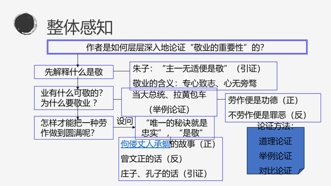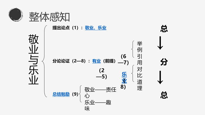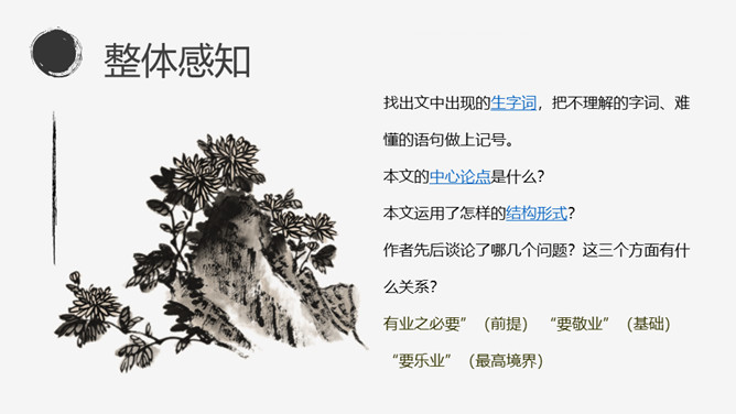 找出文中出现的生字词,把不理解的字词、难懂的语句做上记号。本文的中心论点是什么?本文运用了怎样的结构形式?作者先后谈论了哪几个问题?这三个方面有什么关系?有业之必要”(前提) “要敬业”(基础) “要乐业”(最高境界) “敬业乐业”四个字,是人类生活的不二法门。(中心论点)结构形式:总体结构是“总——分——总”式。开头总起全篇;然后分别论述敬业和乐业,两个分论点平行并列;最后总结全篇。讲演词开头交代题目的来源,其用意是什么?引用古籍名言,用通俗的口语进行解释。所属专题:敬业与乐业ppt。