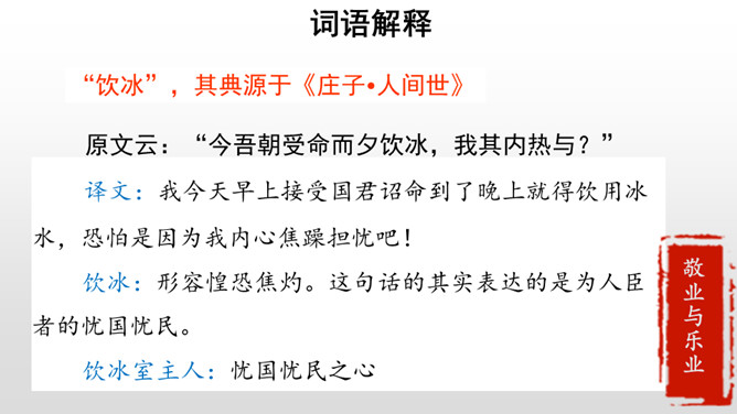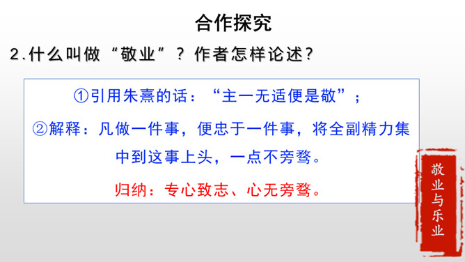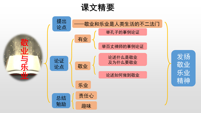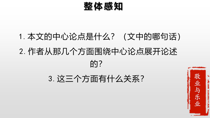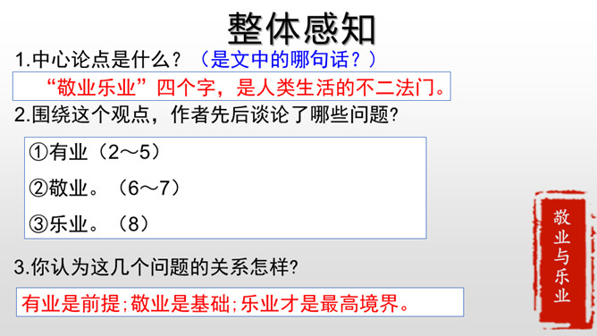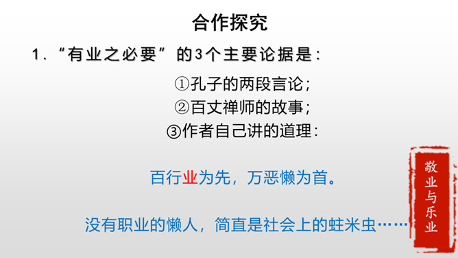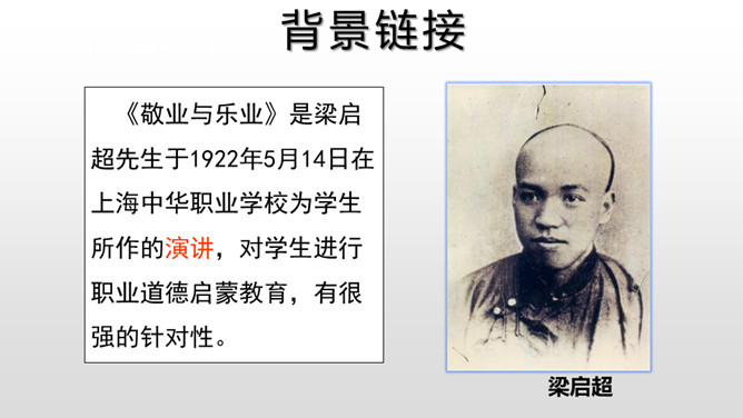 是梁启超先生于1922年5月14日在上海中华职业学校为学生所作的演讲,对学生进行职业道德启蒙教育,有很强的针对性。他兴趣广泛,学识渊博,在文学、史学、哲学、佛学等诸多领域,都有较深的造诣。他一生著述宏富,所遗《饮冰室合集》计148卷,1000余万字。 1.本文的中心论点是什么?(文中的哪句话)2.作者从那几个方面围绕中心论点展开论述的?3.这三个方面有什么关系?中心论点是什么?(是文中的哪句话?)围绕这个观点,作者先后谈论了哪些问题?你认为这几个问题的关系怎样?所属专题:敬业与乐业ppt。
