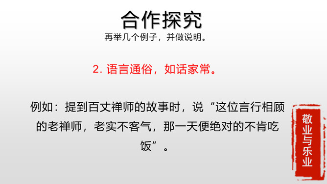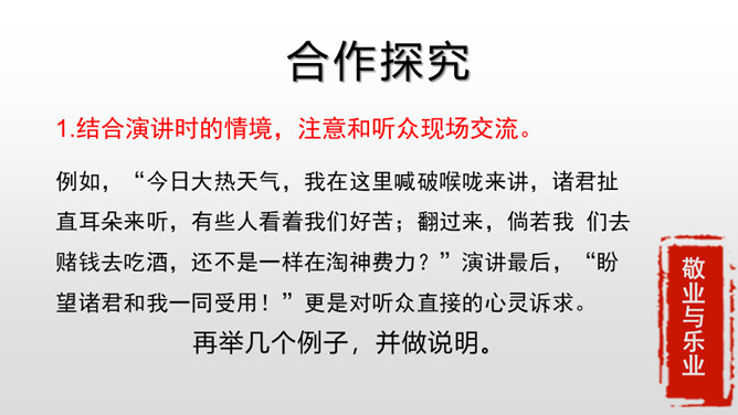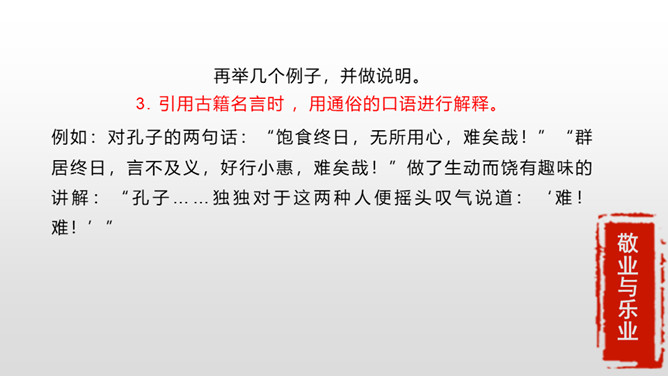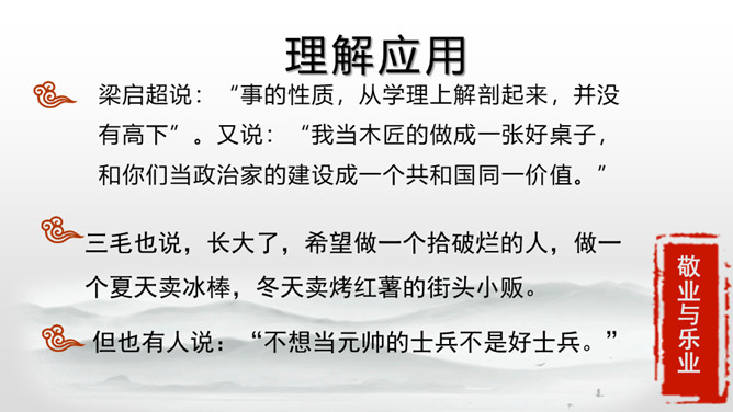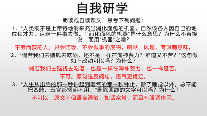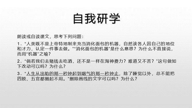 “人类既不是上帝特地制来充当消化面包的机器,自然该各人因自己的地位和才力,认定一件事去做。”“消化面包的机器”是什么意思?为什么不直接说,而用“机器”之喻?不劳而获的人;只会吃饭、不会做事的废物。幽默、风趣,有讽刺意味。“倘若我们去赌钱去吃酒,还不是一样在淘神费力?难道又不苦?”这句做如下改动可以吗?为什么?倘若我们去赌钱去吃酒,也是一样在淘神费力,也一样是苦。不可。原句是反问句,语气更肯定。“人生从出胎的那一秒钟起到咽气的那一秒钟止,除了睡觉以外,总不能把四肢、五官都搁起不用。”删除画线的文字可以吗?所属专题:敬业与乐业ppt。