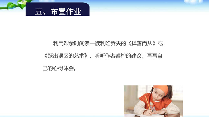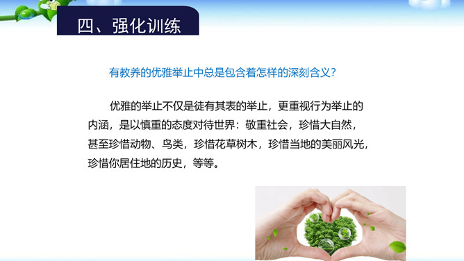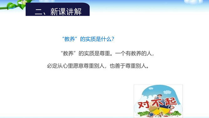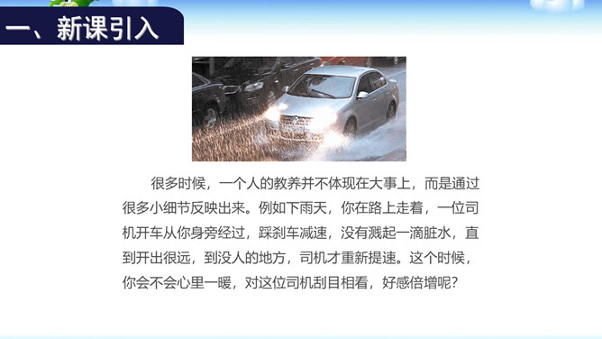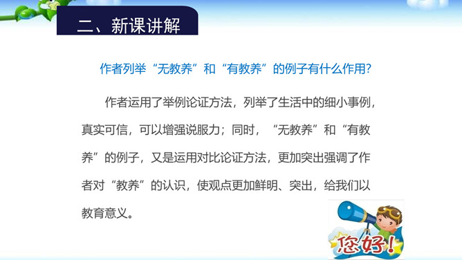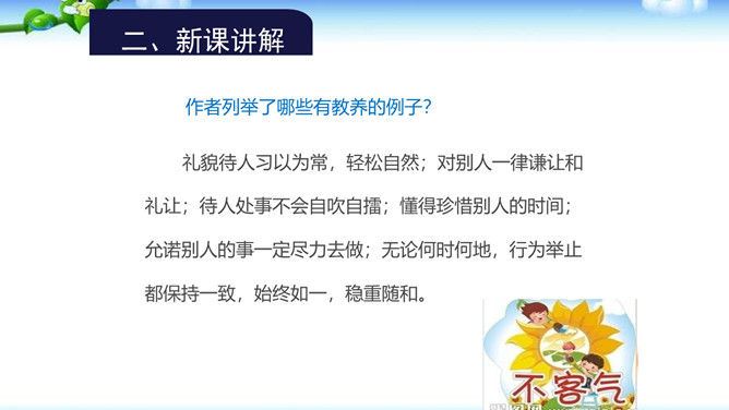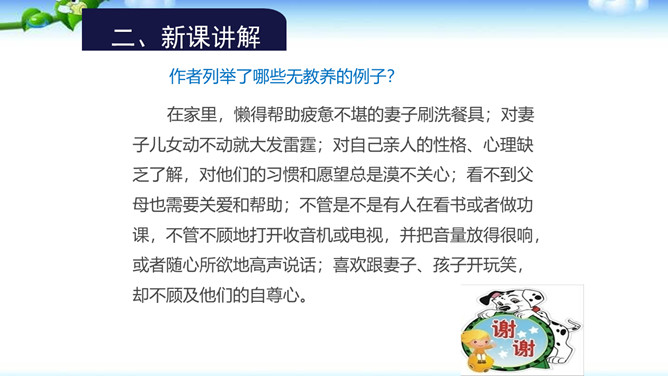 很多时候,一个人的教养并不体现在大事上,而是通过很多小细节反映出来。例如下雨天,你在路上走着,一位司机开车从你身旁经过,踩刹车减速,没有溅起一滴脏水,直到开出很远,到没人的地方,司机才重新提速。这个时候,你会不会心里一暖,对这位司机刮目相看,好感倍增呢?作者列举了哪些无教养的例子?在家里,懒得帮助疲惫不堪的妻子刷洗餐具;对妻子儿女动不动就大发雷霆;对自己亲人的性格、心理缺乏了解,对他们的习惯和愿望总是漠不关心;看不到父母也需要关爱和帮助。所属专题:论教养ppt。