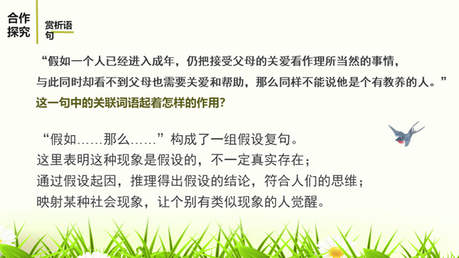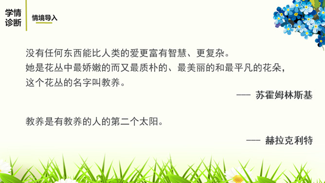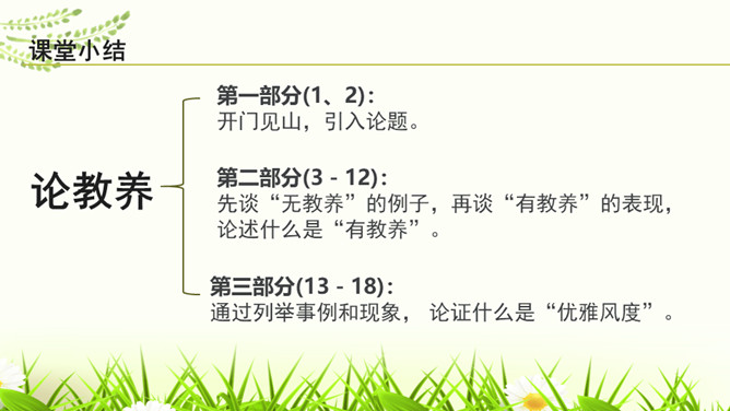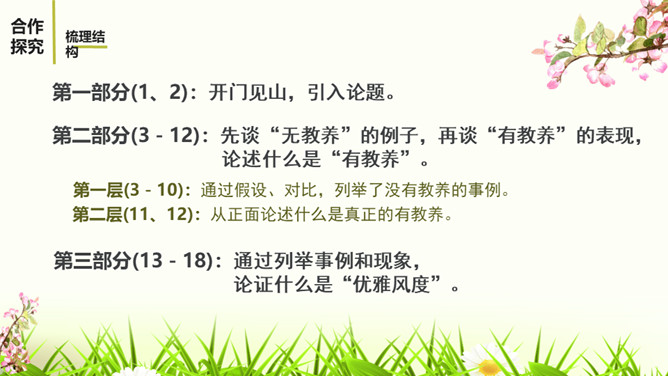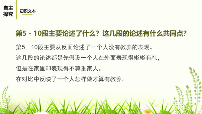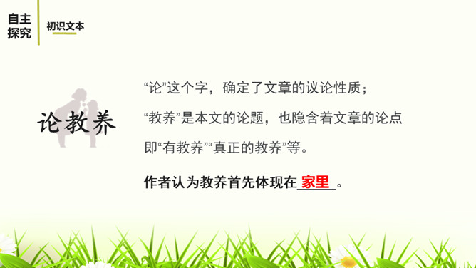 教学目标:1.通读全文,理顺文章的论证思路。理解什么是“真正的教养”和“优雅风度”。2.理解本文使用的举例论证和对比论证的作用。3.明确作者的观点,学会做一个真正有教养和优雅风度的人。“论”这个字,确定了文章的议论性质;“教养”是本文的论题,也隐含着文章的论点即“有教养”“真正的教养”等。第5-10段主要论述了什么?这几段的论述有什么共同点?主要从反面论述了一个人没有教养的表现。这几段的论述都是先假设一个人在外面表现得彬彬有礼,但是在家里却表现得不尊重家人。所属专题:论教养ppt。