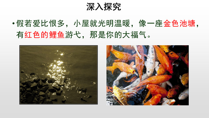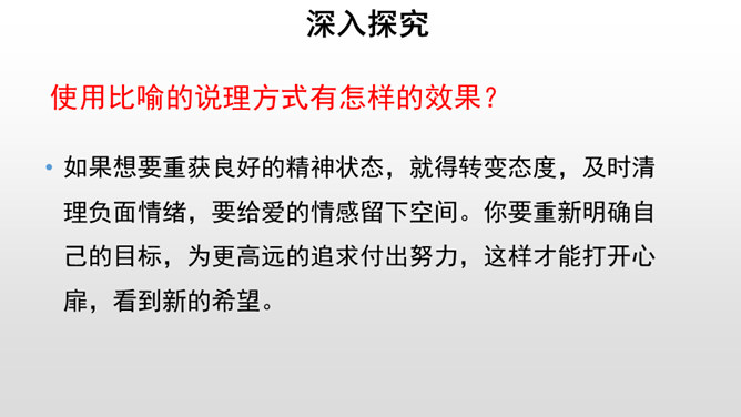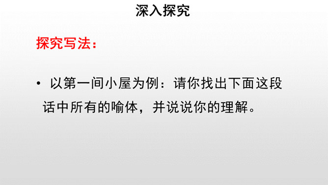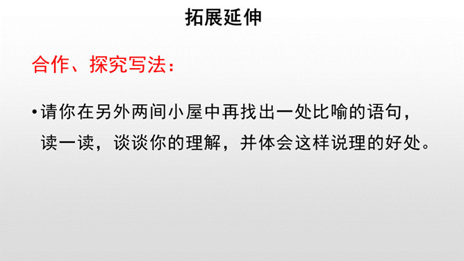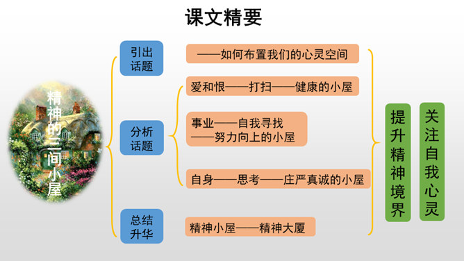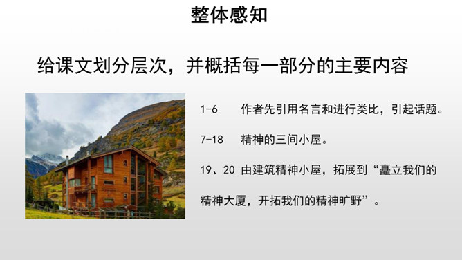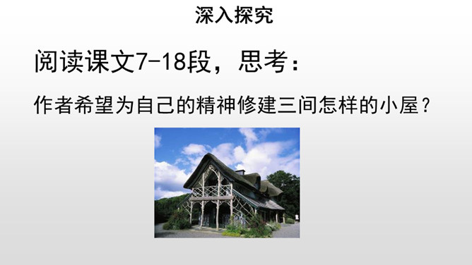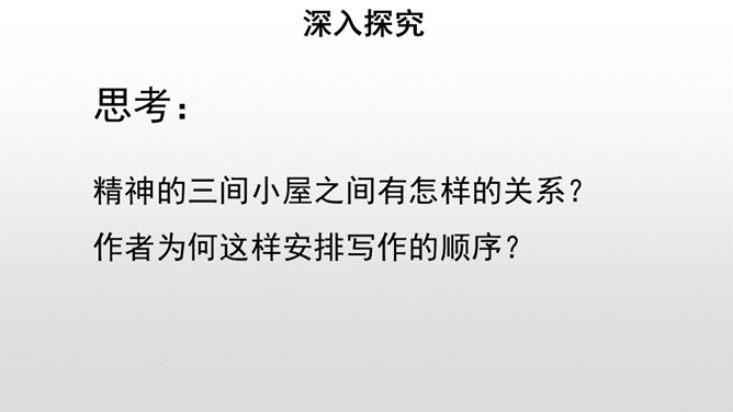 给课文划分层次,并概括每一部分的主要内容。作者先引用名言和进行类比,引起话题。由建筑精神小屋,拓展到“矗立我们的精神大厦,开拓我们的精神旷野”。作者希望为自己的精神修建三间怎样的小屋?思考:精神的三间小屋之间有怎样的关系?作者为何这样安排写作的顺序?以第一间小屋为例:请你找出下面这段话中所有的喻体,并说说你的理解。使用比喻的说理方式有怎样的效果?请你在另外两间小屋中再找出一处比喻的语句,读一读,谈谈你的理解,并体会这样说理的好处。所属专题:精神的三间小屋ppt。