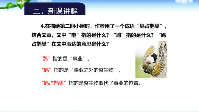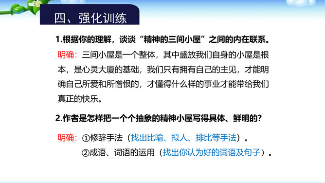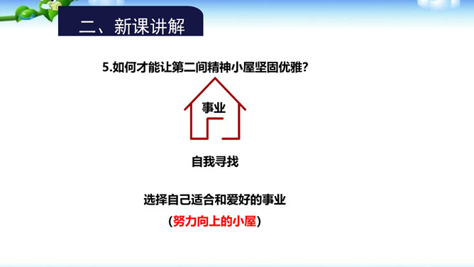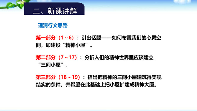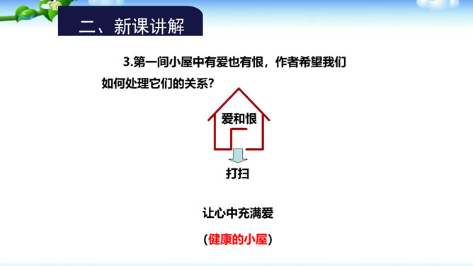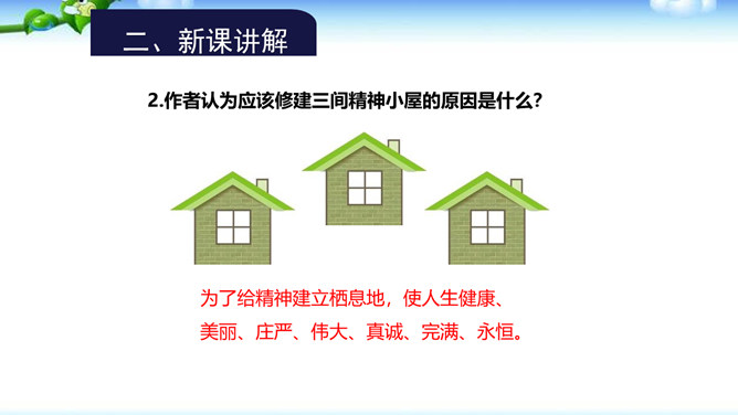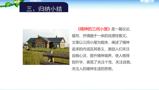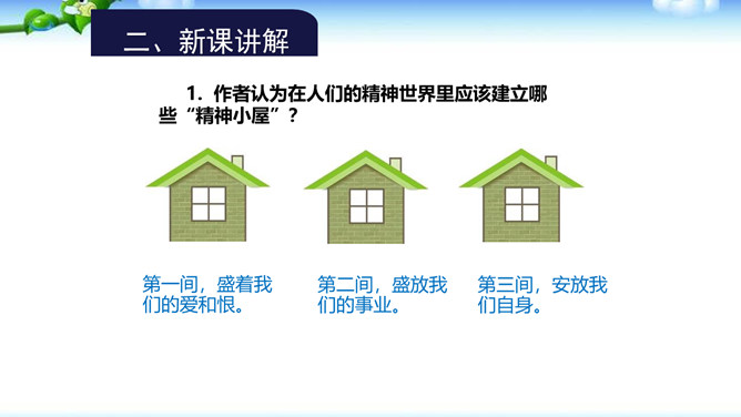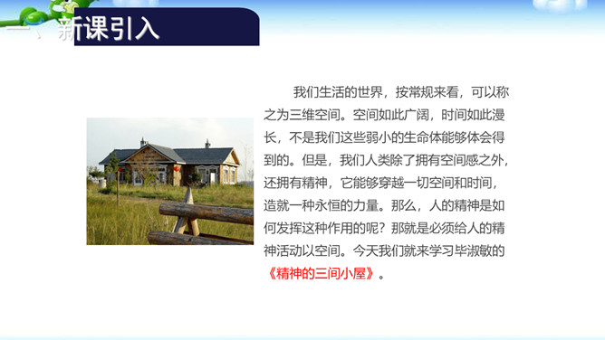 我们生活的世界,按常规来看,可以称之为三维空间。空间如此广阔,时间如此漫长,不是我们这些弱小的生命体能够体会得到的。但是,我们人类除了拥有空间感之外,还拥有精神,它能够穿越一切空间和时间,造就一种永恒的力量。那么,人的精神是如何发挥这种作用的呢?那就是必须给人的精神活动以空间。第一间小屋中有爱也有恨,作者希望我们如何处理它们的关系?在描绘第二间小屋时,作者用了一个成语“鸠占鹊巢”,结合文章,文中“鹊”指的是什么?“鸠”指的是什么?“鸠占鹊巢”在文中表达的意思是什么?所属专题:精神的三间小屋ppt。