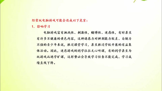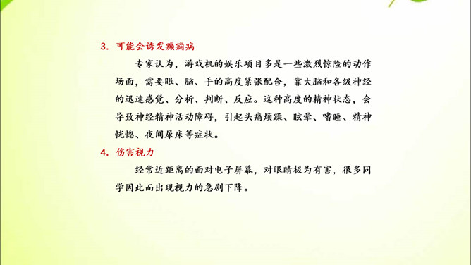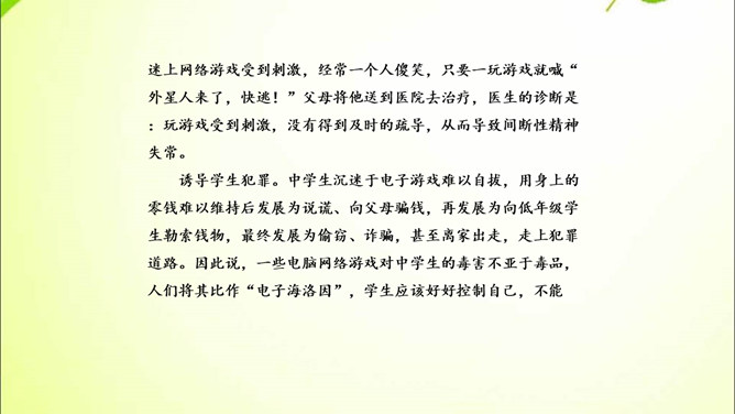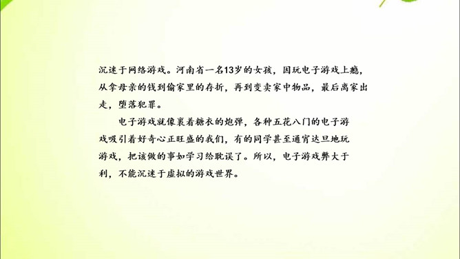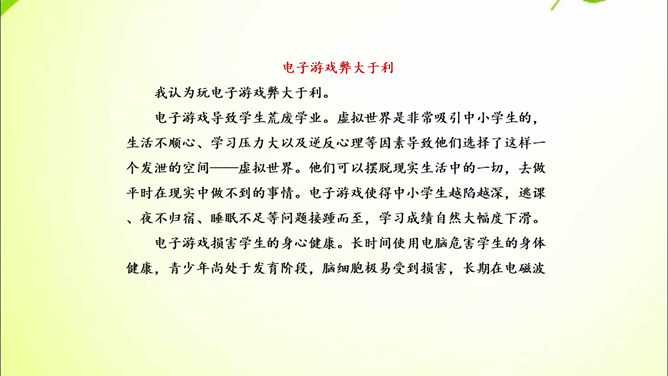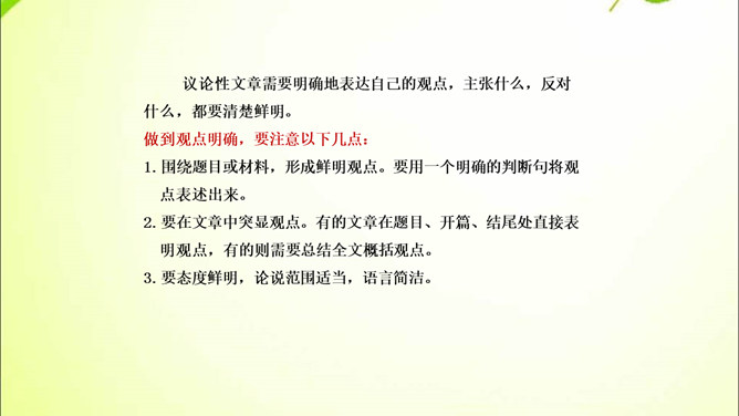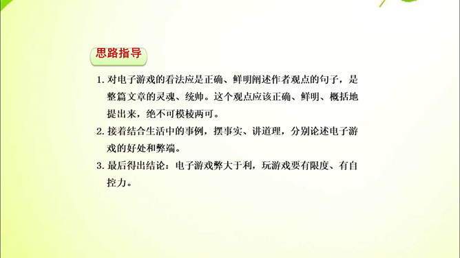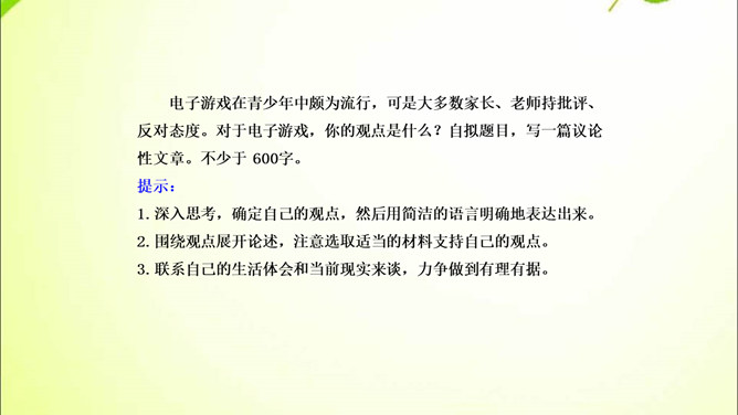 议论性文章需要明确地表达自己的观点,主张什么,反对什么,都要清楚鲜明。做到观点明确,要注意以下几点:1.围绕题目或材料,形成鲜明观点。要用一个明确的判断句将观点表述出来。2.要在文章中突显观点。有的文章在题目、开篇、结尾处直接表明观点,有的则需要总结全文概括观点。3.要态度鲜明,论说范围适当,语言简洁。电子游戏在青少年中颇为流行,可是大多数家长、老师持批评、反对态度。对于电子游戏,你的观点是什么?自拟题目,写一篇议论性文章。提示:深入思考,确定自己的观点,然后用简洁的语言明确地表达出来。所属专题:观点要明确ppt。