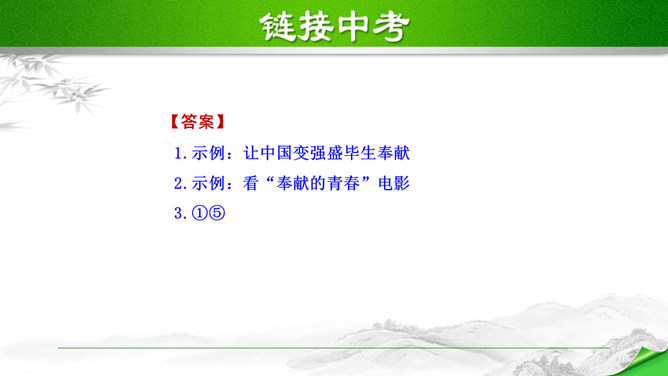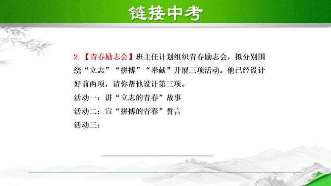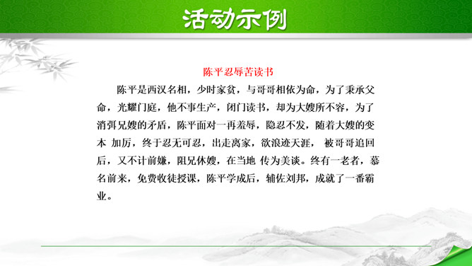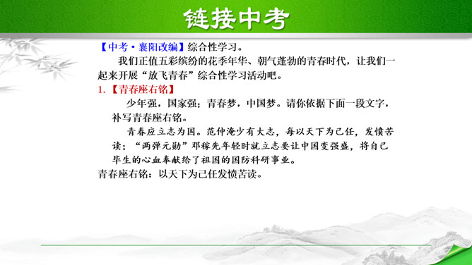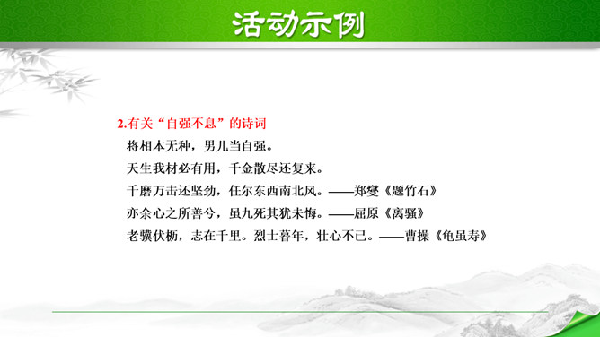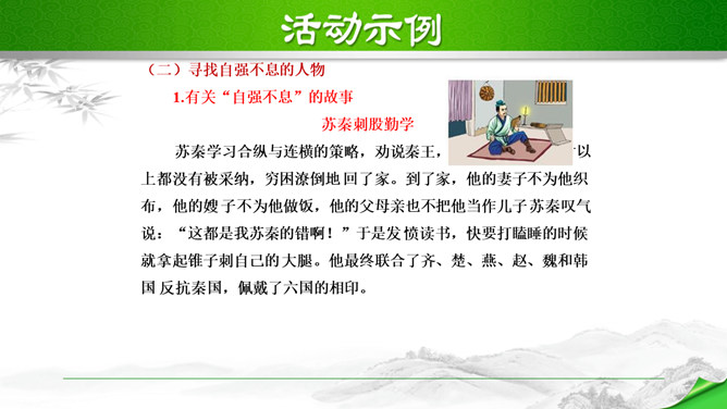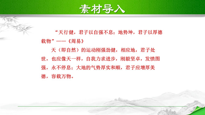 天(即自然)的运动刚强劲健,相应地,君子处世,也应像天一样,自我力求进步,刚毅坚卓,发愤图强,永不停息;大地的气势厚实和顺,君子应增厚美德,容载万物。苏秦学习合纵与连横的策略,劝说秦王,给 秦王的信有十封以上都没有被采纳,穷困潦倒地 回了家。到了家,他的妻子不为他织布,他的嫂 子不为他做饭,他的父母亲也不把他当作儿子 苏秦叹气说:“这都是我苏秦的错啊!”于是发 愤读书,快要打瞌睡的时候就拿起锥子刺自己的 大腿。他最终联合了齐、楚、燕、赵、魏和韩国 反抗秦国,佩戴了六国的相印。所属专题:君子自强不息ppt。