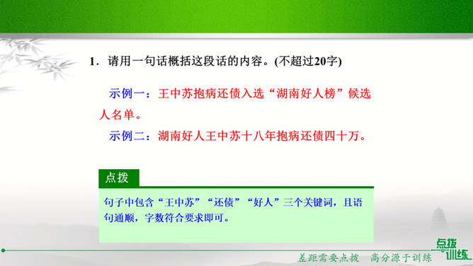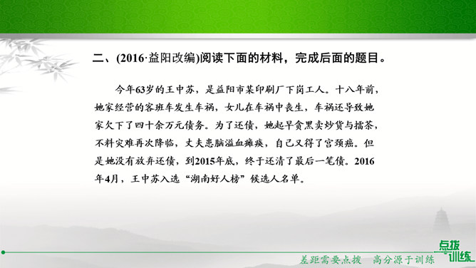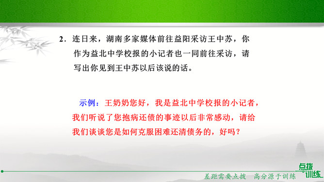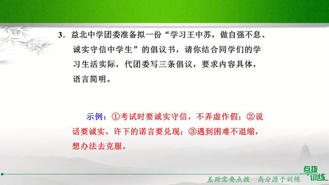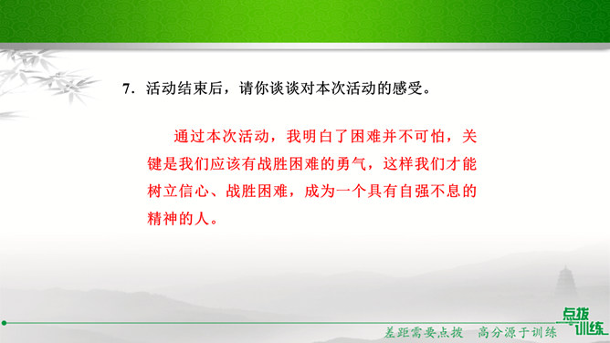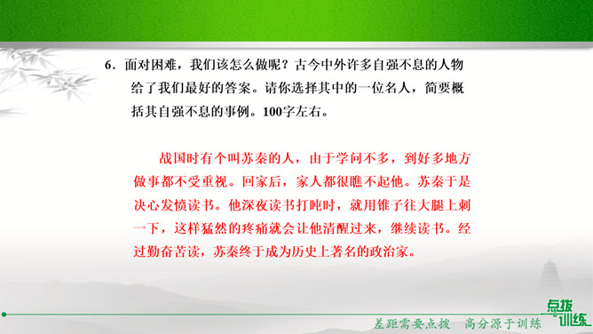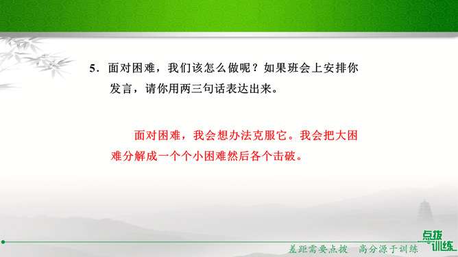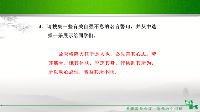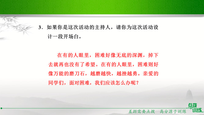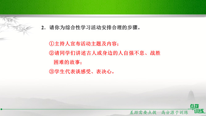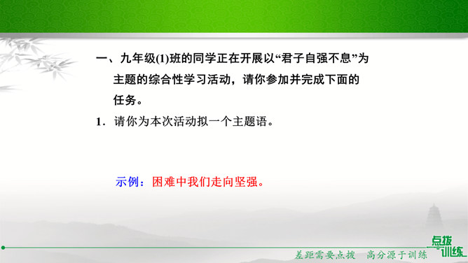 九年级(1)班的同学正在开展以“君子自强不息”为主题的综合性学习活动,请你参加并完成下面的任务。请你为本次活动拟一个主题语。示例:困难中我们走向坚强。请你为综合性学习活动安排合理的步骤。主持人宣布活动主题及内容;请同学们讲述古人或身边的人自强不息、战胜困难的故事;学生代表谈感受、表决心。如果你是这次活动的主持人,请你为这次活动设计一段开场白。在有的人眼里,困难好像无底的深渊,掉下去就再也没有了希望。在有的人眼里,困难则好像万能的磨刀石,越磨越快,越挫越勇。亲爱的同学们,面对困难,我们应该怎么办呢?所属专题:君子自强不息ppt。