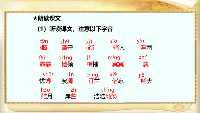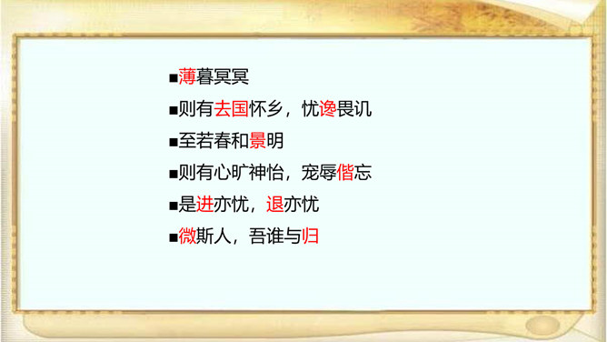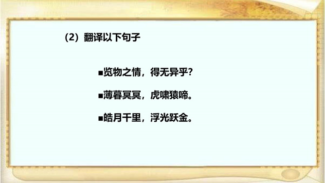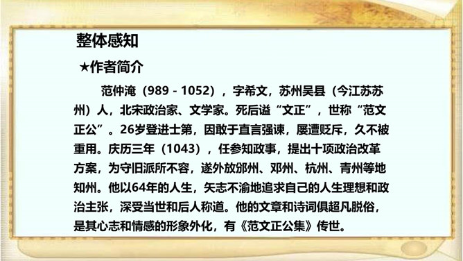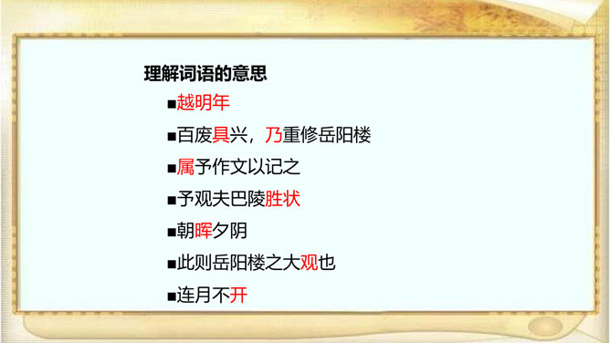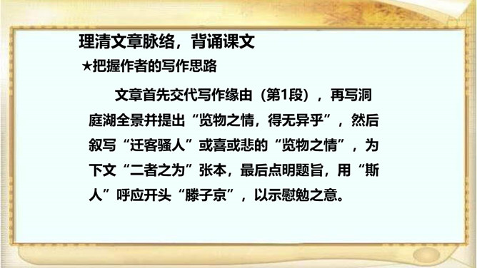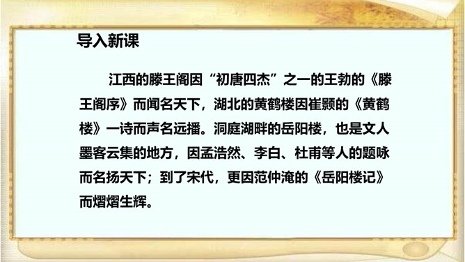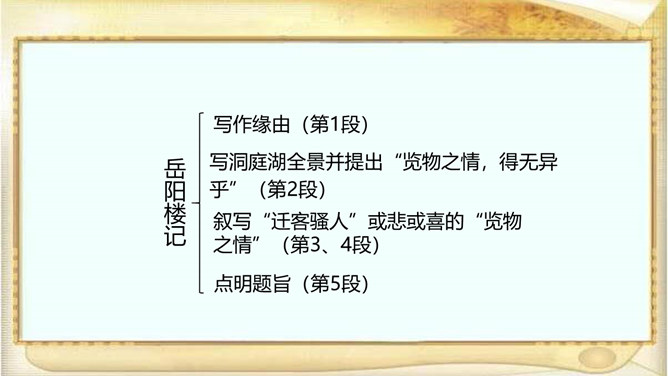 江西的滕王阁因“初唐四杰”之一的王勃的《滕王阁序》而闻名天下,湖北的黄鹤楼因崔颢的《黄鹤楼》一诗而声名远播。洞庭湖畔的岳阳楼,也是文人墨客云集的地方,因孟浩然、李白、杜甫等人的题咏而名扬天下;到了宋代,更因范仲淹的《岳阳楼记》而熠熠生辉。自由读课文,注意语句的节奏、停顿、轻重音,进一步感知课文内容。文章首先交代写作缘由,再写洞庭湖全景并提出“览物之情,得无异乎”,然后叙写“迁客骚人”或喜或悲的“览物之情”,为下文“二者之为”张本,最后点明题旨,用“斯人”呼应开头“滕子京”,以示慰勉之意。所属专题:岳阳楼记ppt。