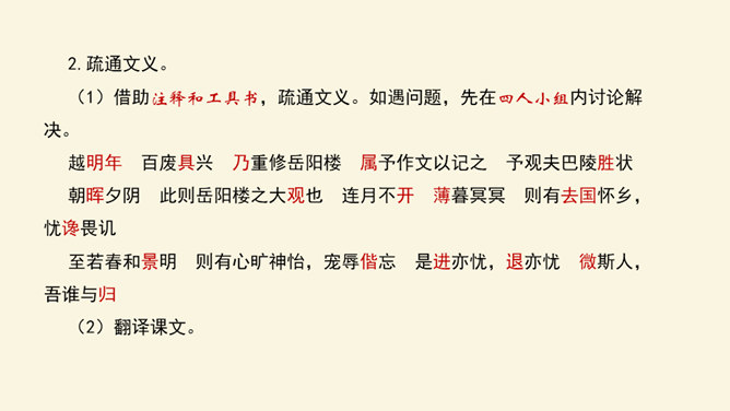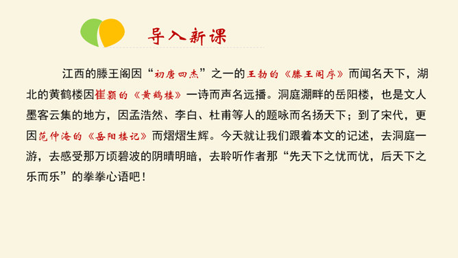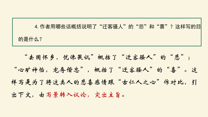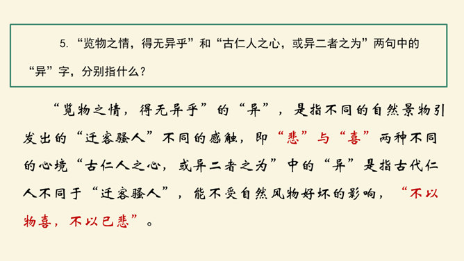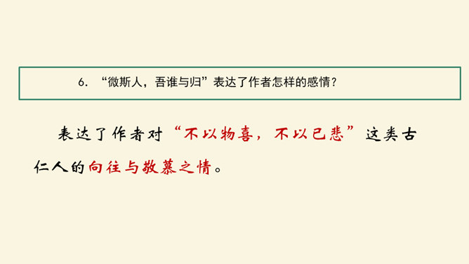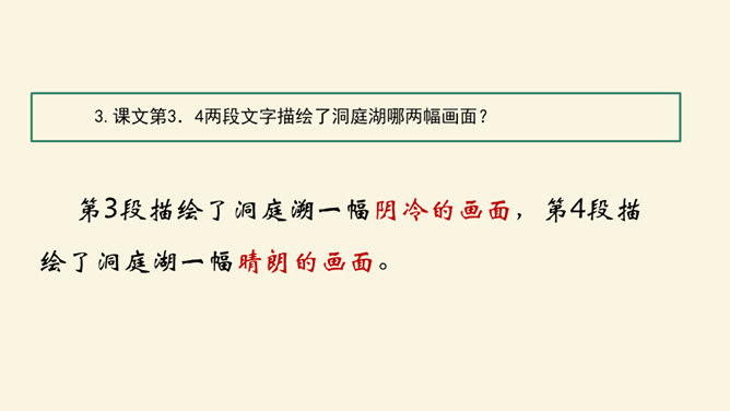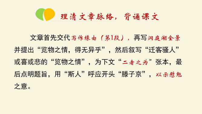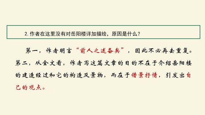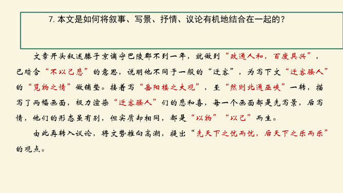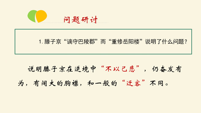 滕子京“谪守巴陵郡”而“重修岳阳楼”说明了什么问题?说明滕子京在逆境中“不以己悲”,仍奋发有为,有阔大的胸襟,和一般的“迁客”不同。作者在这里没有对岳阳楼详加描绘,原因是什么?第一,作者明言“前人之述备矣”,因此不必再去重复。第二,从全文看,作者写这篇文章的目的不在于介绍岳阳楼的建造经过和它的构造及景物,而在于借景抒情,引发出自己的观点。课文第3、4两段文字描绘了洞庭湖哪两幅画面?第3段描绘了洞庭溯一幅阴冷的画面,第4段描绘了洞庭湖一幅晴朗的画面。所属专题:岳阳楼记ppt。