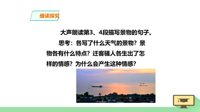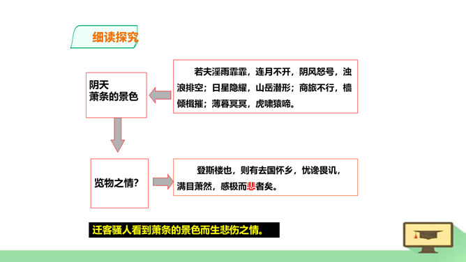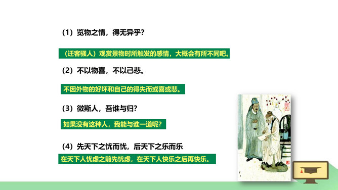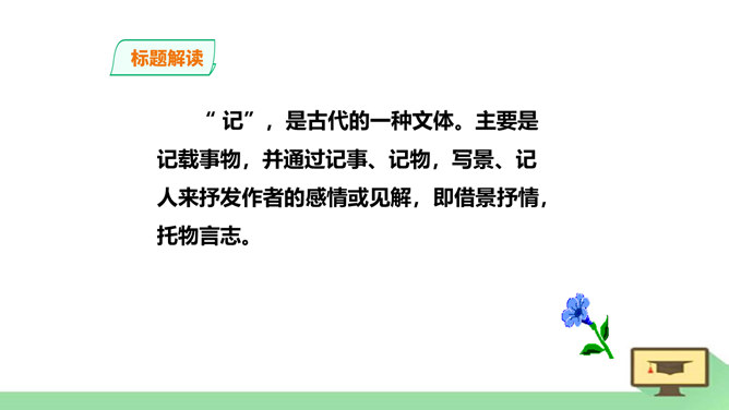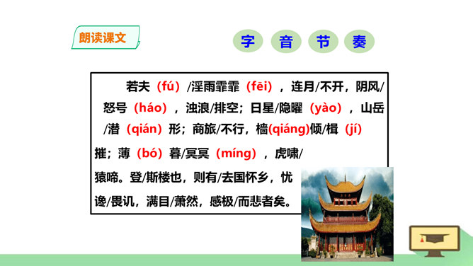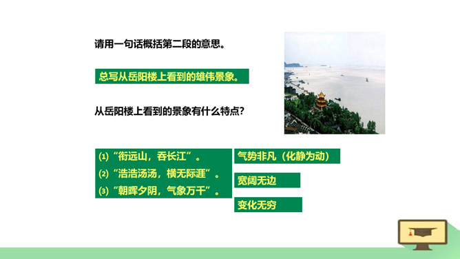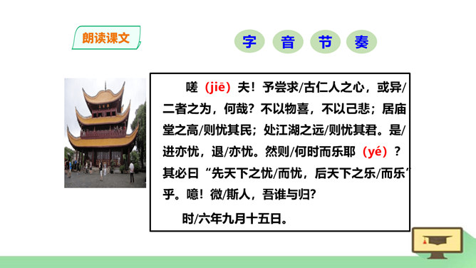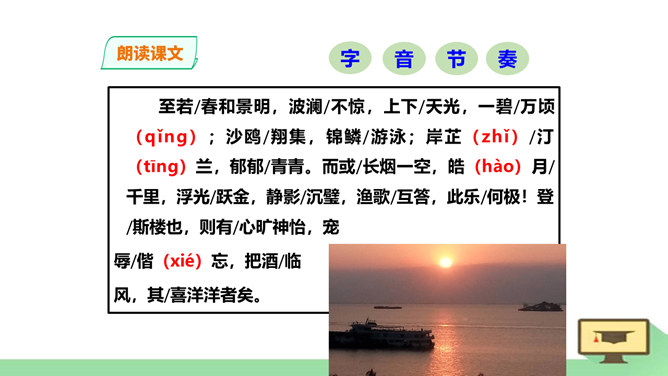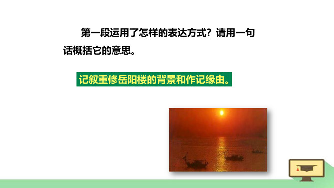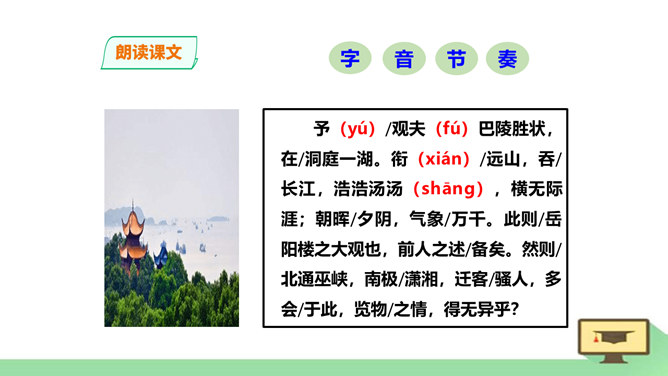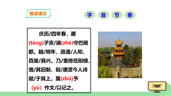 “ 记”,是古代的一种文体。主要是记载事物,并通过记事、记物,写景、记人来抒发作者的感情或见解,即借景抒情,托物言志。1、朗读课文,读准字音节奏。2、积累常见文言实词和虚词。3、了解全文大意。一、请几个同学分段朗读。(其他同学纠错评价)二、自由朗读全文。三、师徒合作朗读。四、欣赏名家朗读。五、全班齐读。师徒合作学习,疏通文意。1、利用注释和工具书译读课文。2、不懂之处,举手提问。3、师徒合作展示。第一段运用了怎样的表达方式?请用一句话概括它的意思。记叙重修岳阳楼的背景和作记缘由。所属专题:岳阳楼记ppt。