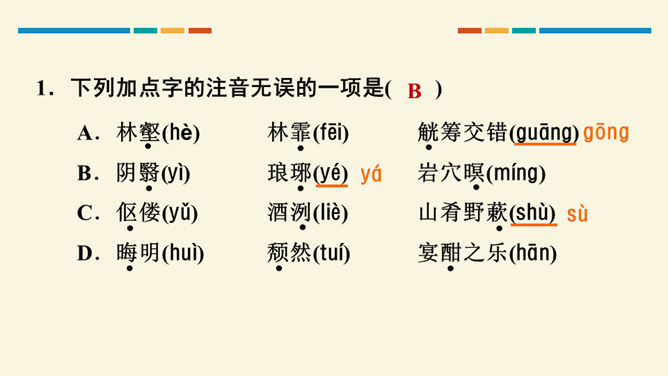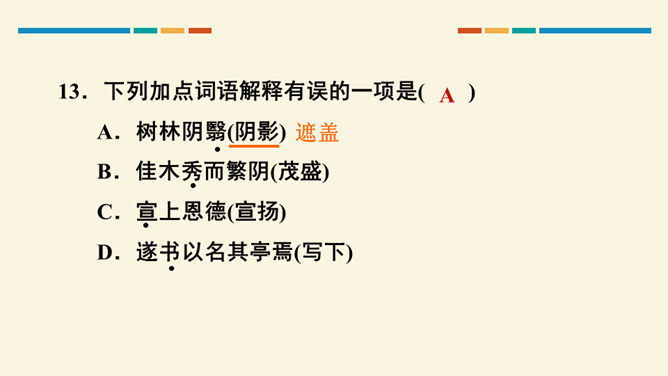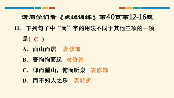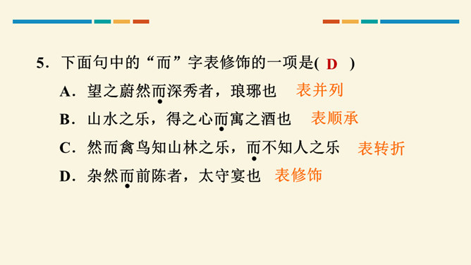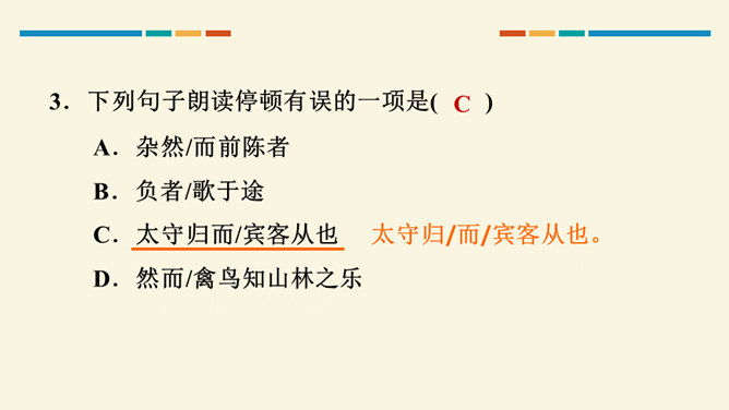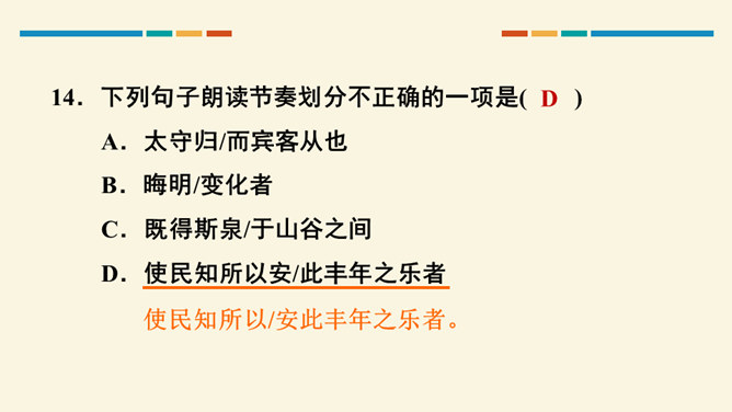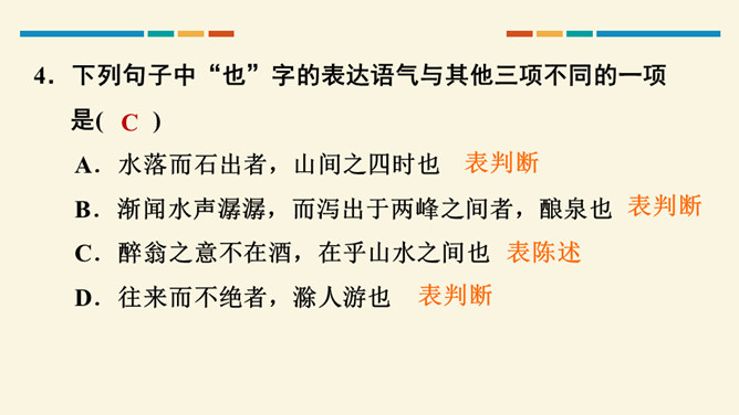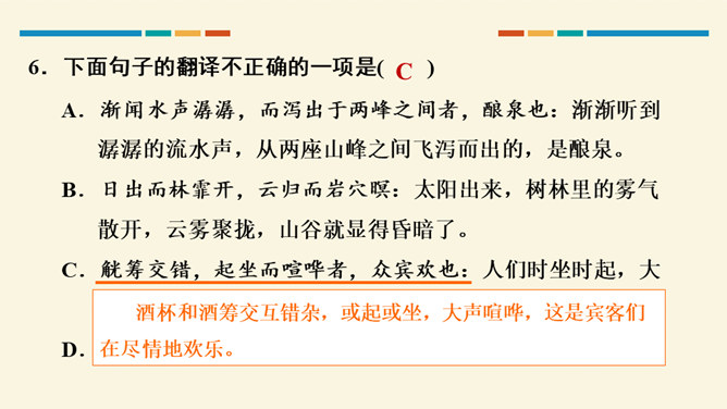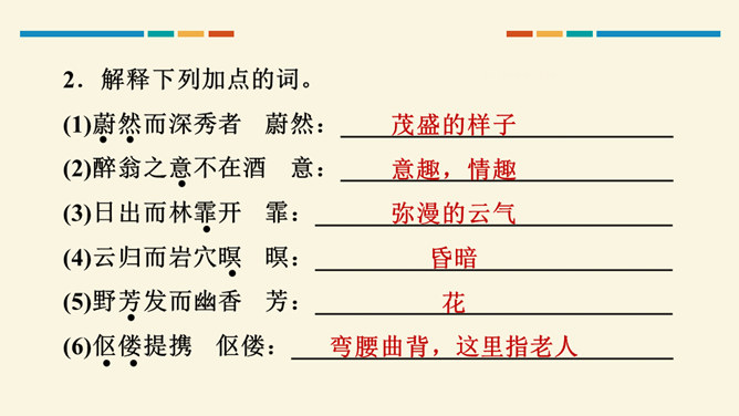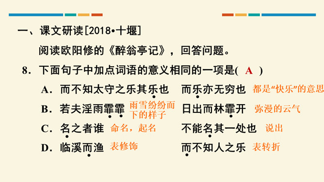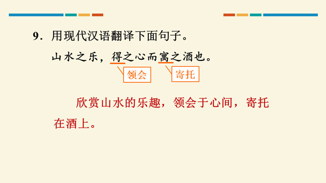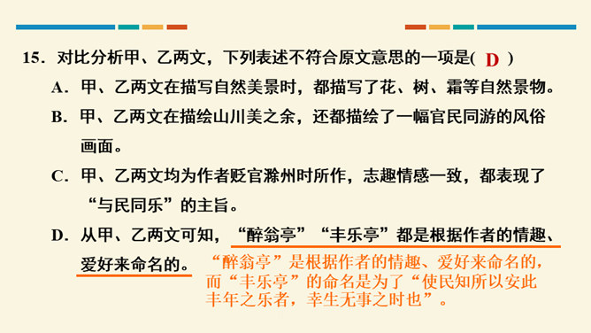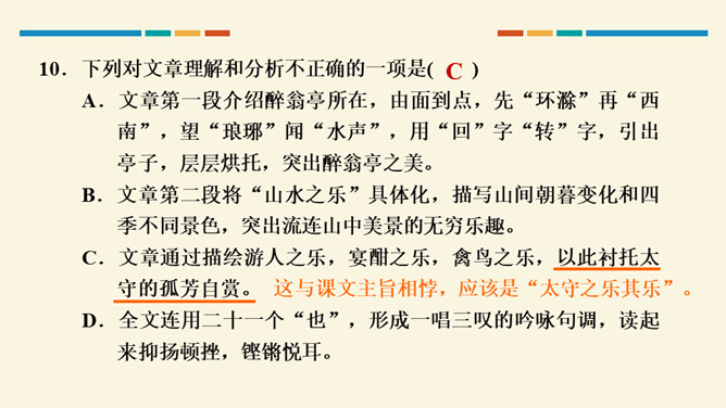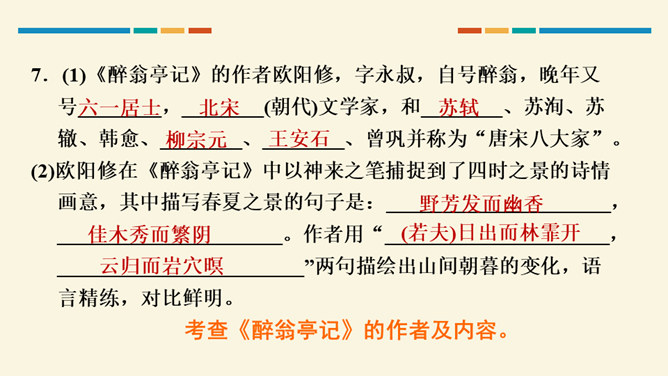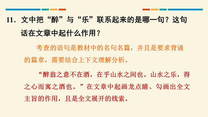 文中把“醉”与“乐”联系起来的是哪一句?这句话在文章中起什么作用?考查的语句是教材中的名句名篇,并且是要求背诵的篇章,需要结合上下文理解分析。“醉翁之意不在酒,在乎山水之间也。山水之乐,得之心而寓之酒也。”在文章中起画龙点睛、勾画出全文主旨的作用,且是全文展开的线索。“醉翁亭”是根据作者的情趣、爱好来命名的,而“丰乐亭”的命名是为了“使民知所以安此丰年之乐者,幸生无事之时也”。就本文而言,欧阳修值得我们学习的精神是什么?勤学苦练、专心致志。所属专题:醉翁亭记ppt。