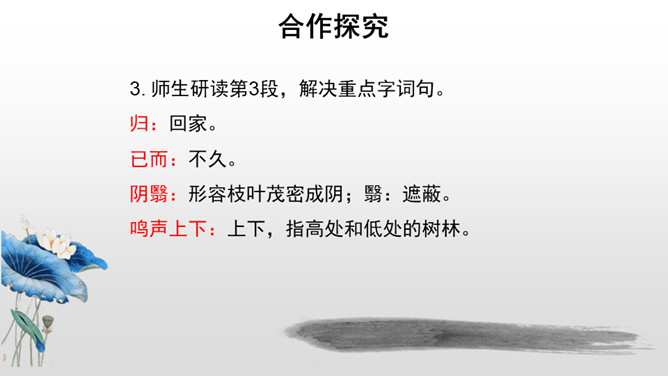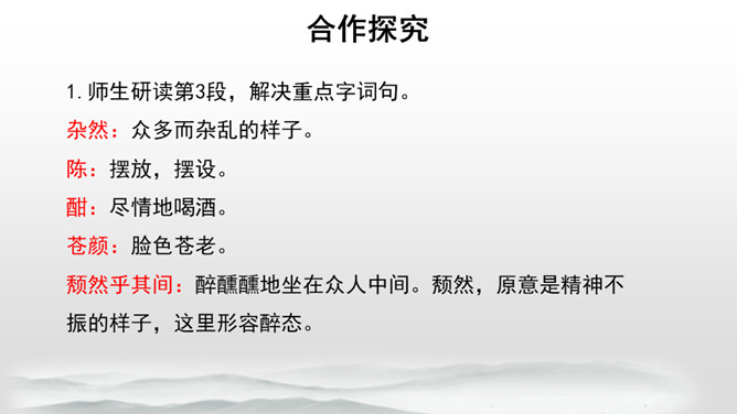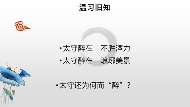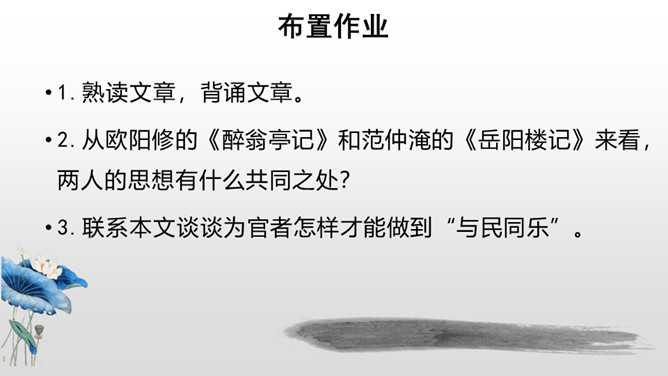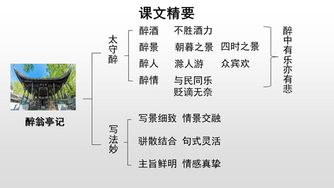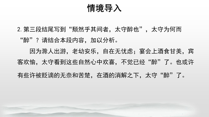 第三段结尾写到“颓然乎其间者,太守醉也”,太守为何而“醉”?请结合本段内容,加以分析。因为滁人出游,老幼安乐,自在无忧虑;宴会上酒食甘美,宾客欢愉,太守看到这些自然心中欢喜,不觉已经“醉”了。也或许有些许被贬谪的无奈和苦楚,在酒的消解之下,太守“醉”了。第四段中反复提及“乐”,本段都写到了多少种“乐趣”呢?大家都为何而“乐”呢?文章通过写滁州一带朝暮四季自然景色的幽深秀美,滁州百姓和平宁静的生活,特别是作者在山林中与民一齐游赏宴饮的乐趣,表现出欧阳修“与民同乐”的政治情怀。所属专题:醉翁亭记ppt。