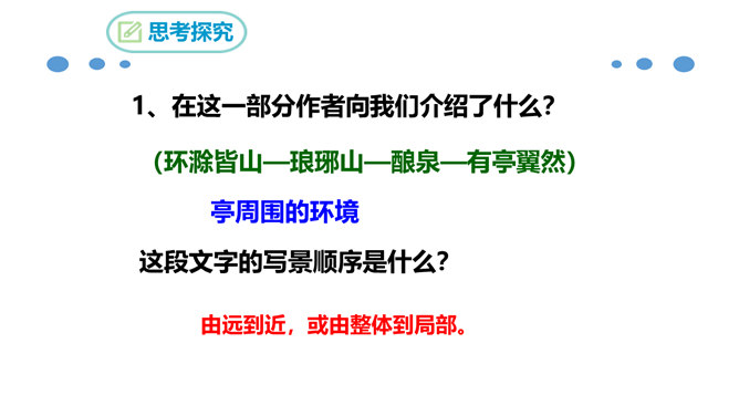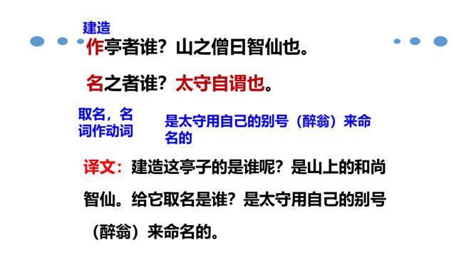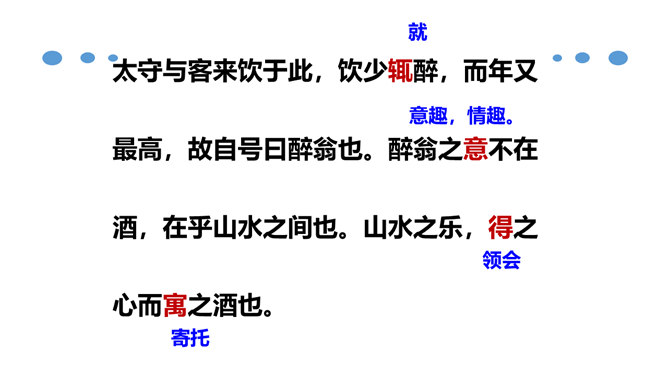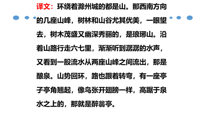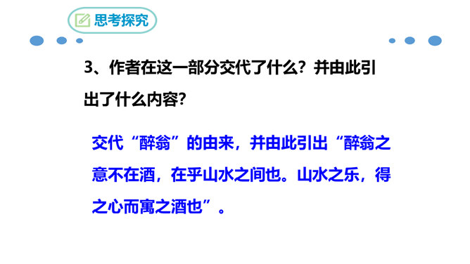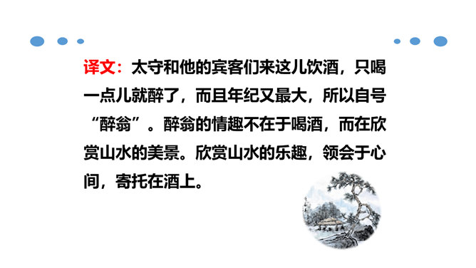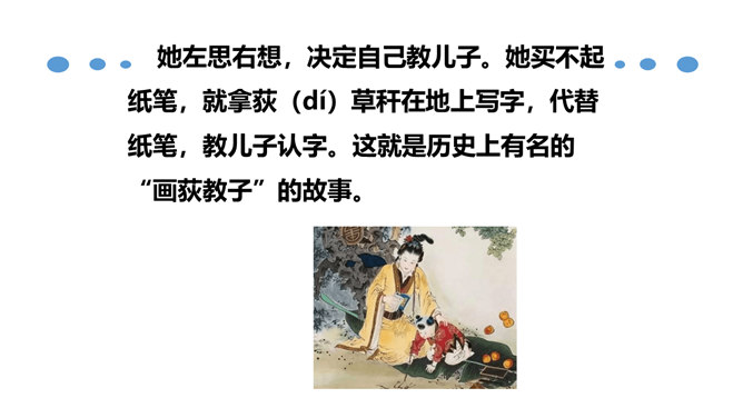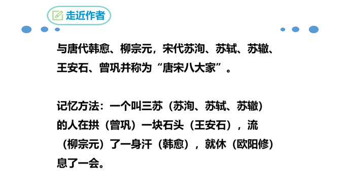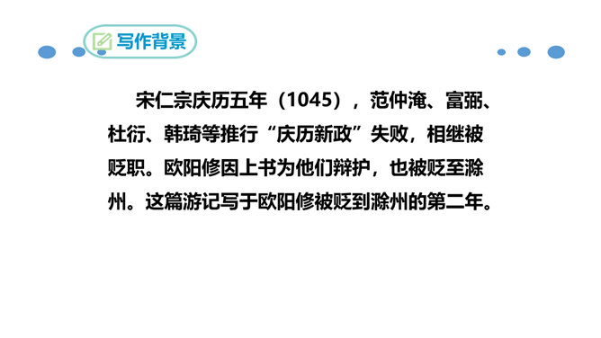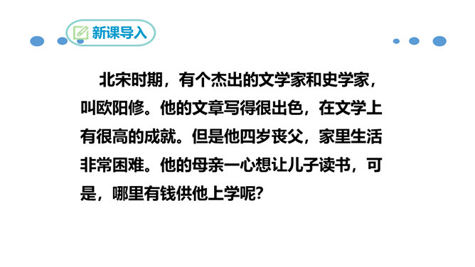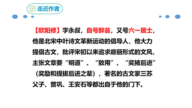 北宋时期,有个杰出的文学家和史学家,叫欧阳修。他的文章写得很出色,在文学上有很高的成就。但是他四岁丧父,家里生活非常困难。他的母亲一心想让儿子读书,可是,哪里有钱供他上学呢?她左思右想,决定自己教儿子。她买不起纸笔,就拿荻草秆在地上写字,代替纸笔,教儿子认字。这就是历史上有名的“画荻教子”的故事。欧阳修字永叔,自号醉翁,又号六一居士,他是北宋中叶诗文革新运动的倡导人,他大力提倡古文,批评宋初以来追求靡丽形式的文风,主张文章要“明道”、“致用”、“奖掖后进”(奖励和提拔后进之辈)。所属专题:醉翁亭记ppt。