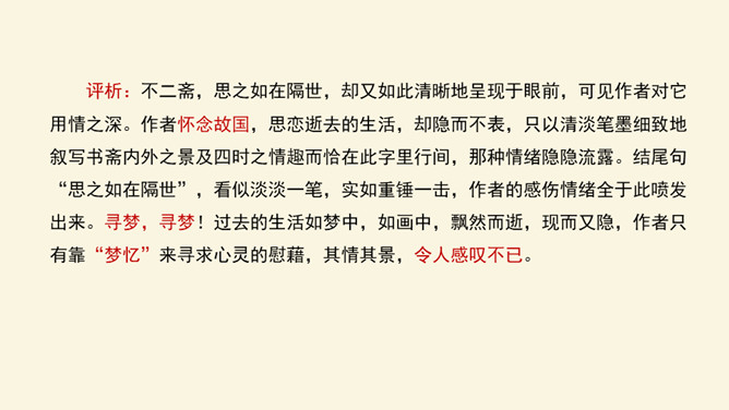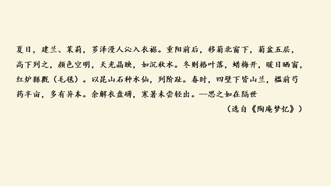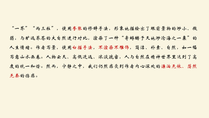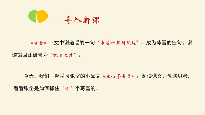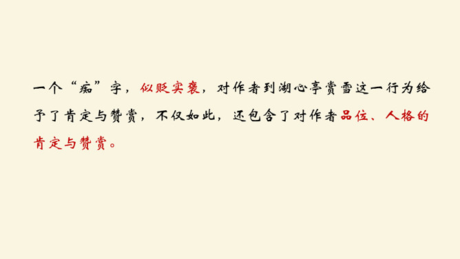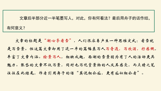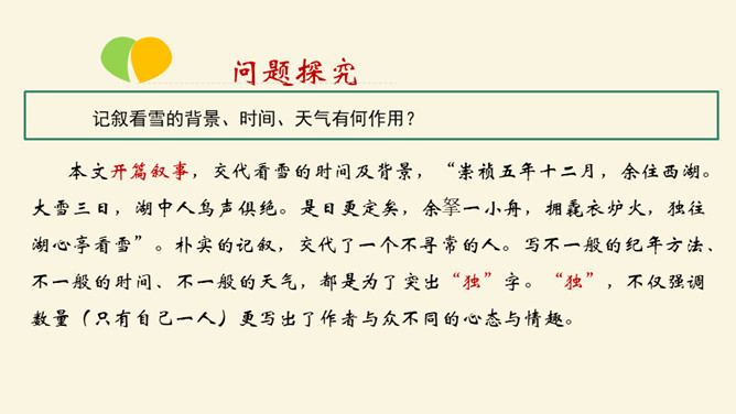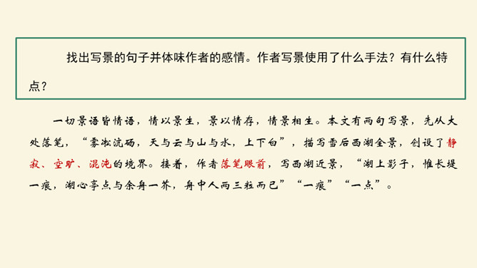 记叙看雪的背景、时间、天气有何作用?本文开篇叙事,交代看雪的时间及背景,“崇祯五年十二月,余住西湖。大雪三日,湖中人鸟声俱绝。是日更定矣,余拏一小舟,拥毳衣炉火,独往湖心亭看雪”。朴实的记叙,交代了一个不寻常的人。写不一般的纪年方法、不一般的时间、不一般的天气,都是为了突出“独”字。“独”,不仅强调数量(只有自己一人)更写出了作者与众不同的心态与情趣。找出写景的句子并体味作者的感情。作者写景使用了什么手法?有什么特点?一切景语皆情语,情以景生,景以情存,情景相生。所属专题:湖心亭看雪ppt。