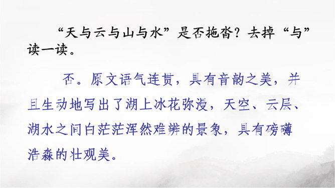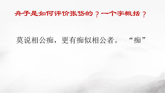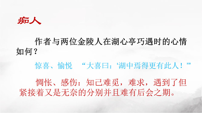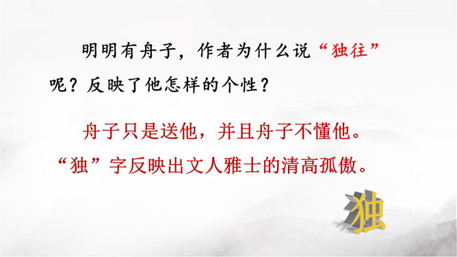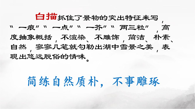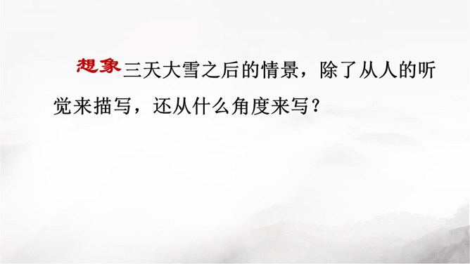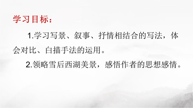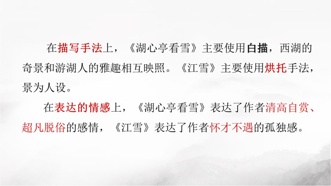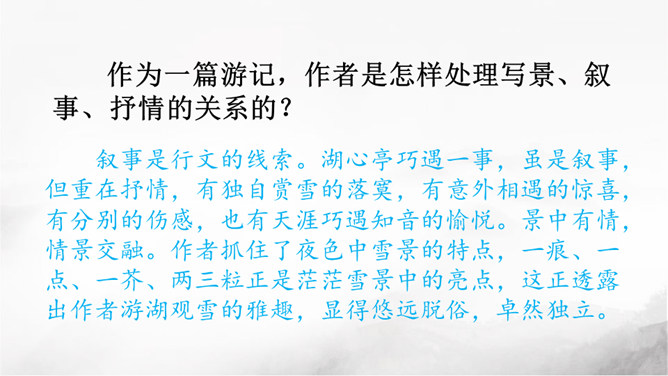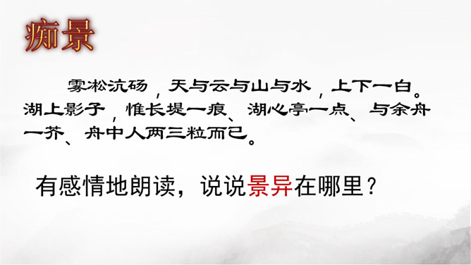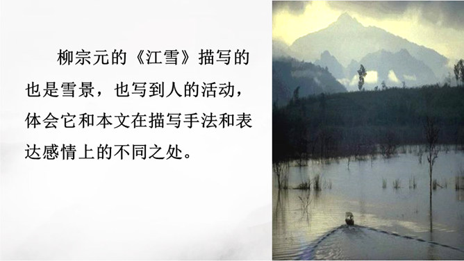 学习目标:1.学习写景、叙事、抒情相结合的写法,体会对比、白描手法的运用。2.领略雪后西湖美景,感悟作者的思想感情。舟子是如何评价张岱的?一个字概括?莫说相公痴,更有痴似相公者。文中哪些地方让你看出“相公痴”?自由朗读,小组讨论交流。“痴”是执着于山水之乐的高雅脱俗之情致。明明有舟子,作者为什么说“独往”呢?反映了他怎样的个性?舟子只是送他,并且舟子不懂他。“独”字反映出文人雅士的清高孤傲。想象三天大雪之后的情景,除了从人的听觉来描写,还从什么角度来写?所属专题:湖心亭看雪ppt。