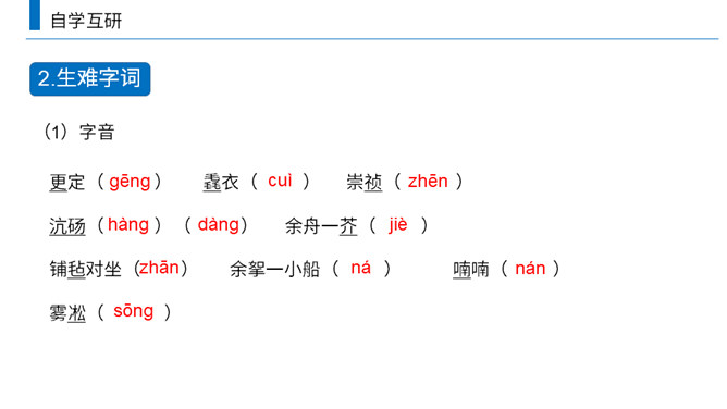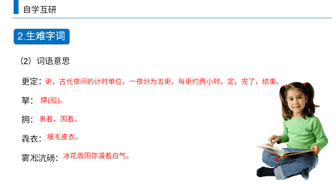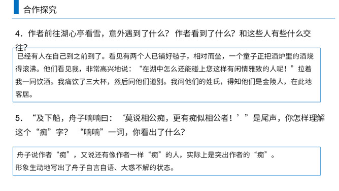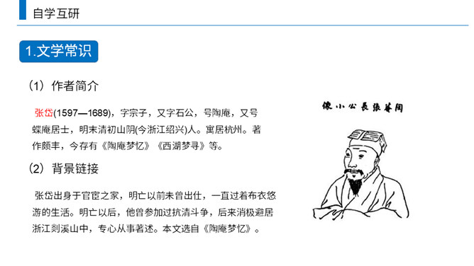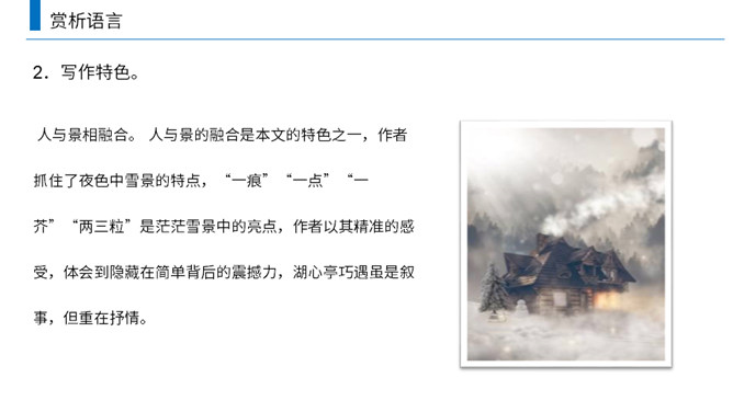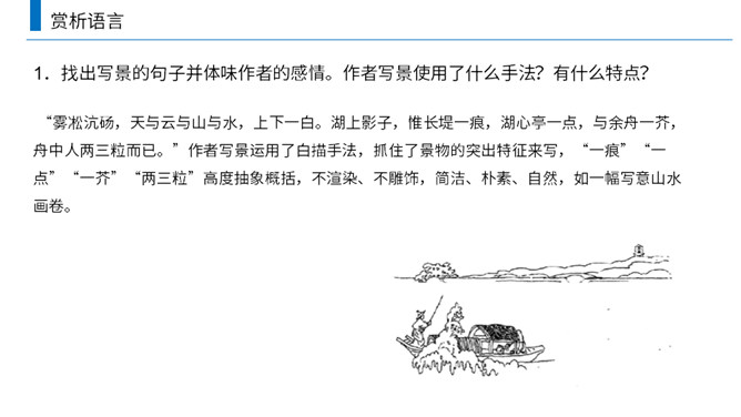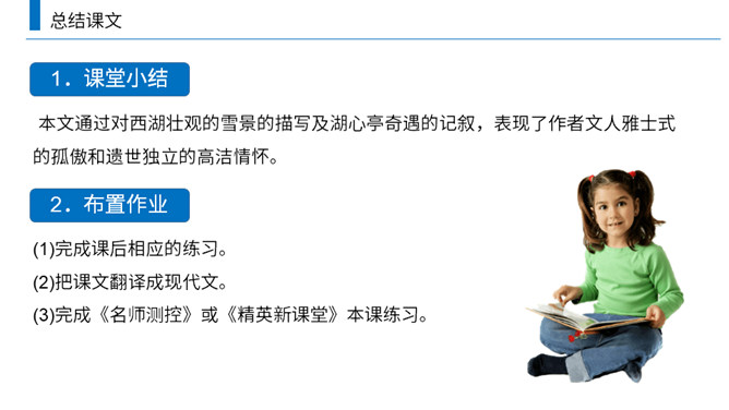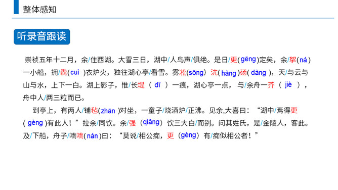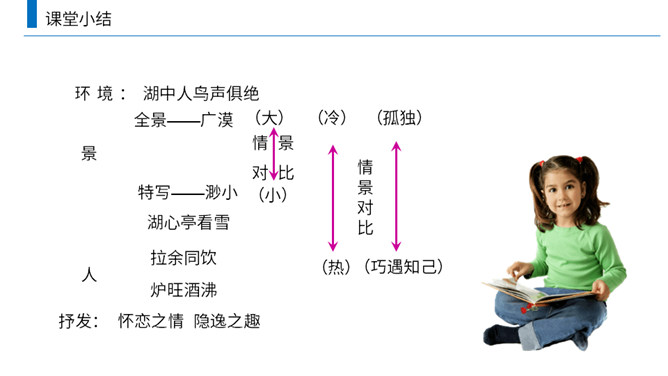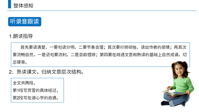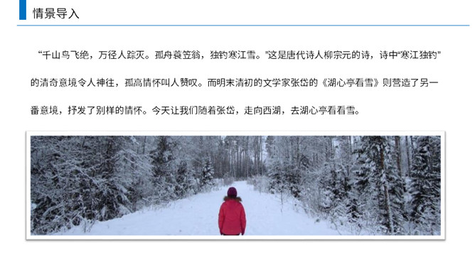 “千山鸟飞绝,万径人踪灭。孤舟蓑笠翁,独钓寒江雪。”这是唐代诗人柳宗元的诗,诗中“寒江独钓”的清奇意境令人神往,孤高情怀叫人赞叹。而明末清初的文学家张岱的《湖心亭看雪》则营造了另一番意境,抒发了别样的情怀。今天让我们随着张岱,走向西湖,去湖心亭看看雪。首先要读清楚,一要句读分明,二要节奏合理;其次要抑扬顿挫,读出作者的感情;再其次要流畅自然,一是语句要流利,二是音韵铿锵;第四要在疏通文意和熟读的基础上自然成诵,切忌硬背。全文共两段,第1段写赏雪的具体经过,第2段写在湖心亭的奇遇。所属专题:湖心亭看雪ppt。