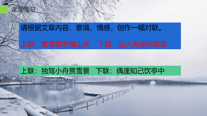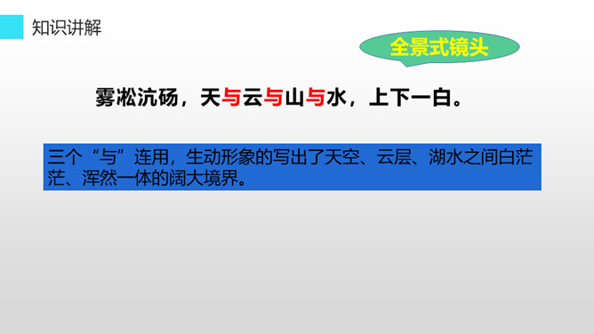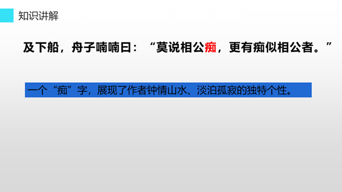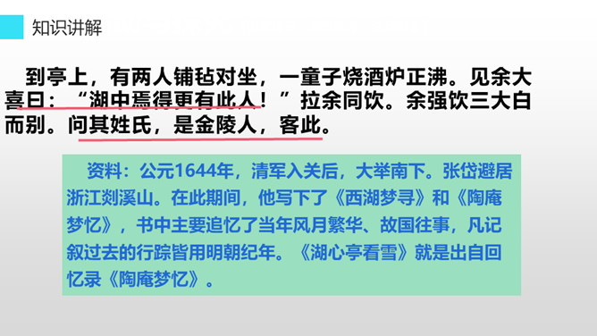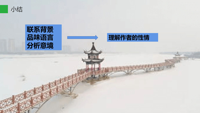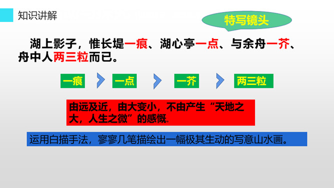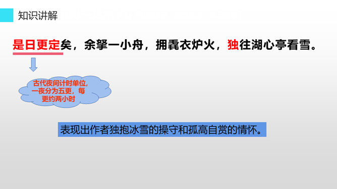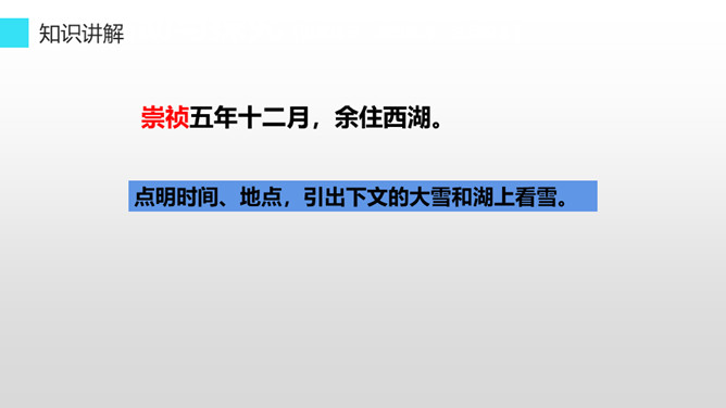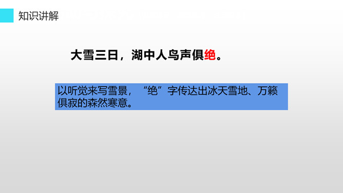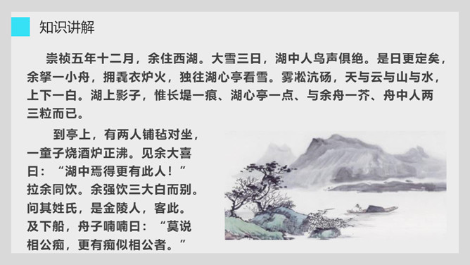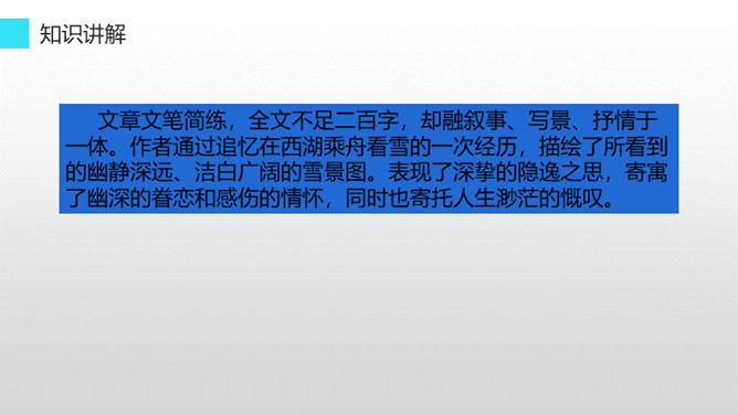 句淡雅而味深长,言尽而意无穷。点明时间、地点,引出下文的大雪和湖上看雪。以听觉来写雪景,“绝”字传达出冰天雪地、万籁俱寂的森然寒意。表现出作者独抱冰雪的操守和孤高自赏的情怀。三个“与”连用,生动形象的写出了天空、云层、湖水之间白茫茫、浑然一体的阔大境界。文章文笔简练,全文不足二百字,却融叙事、写景、抒情于一体。作者通过追忆在西湖乘舟看雪的一次经历,描绘了所看到的幽静深远、洁白广阔的雪景图。表现了深挚的隐逸之思,寄寓了幽深的眷恋和感伤的情怀,同时也寄托人生渺茫的慨叹。所属专题:湖心亭看雪ppt。