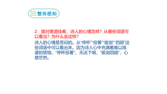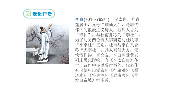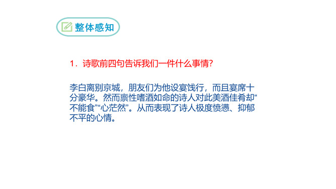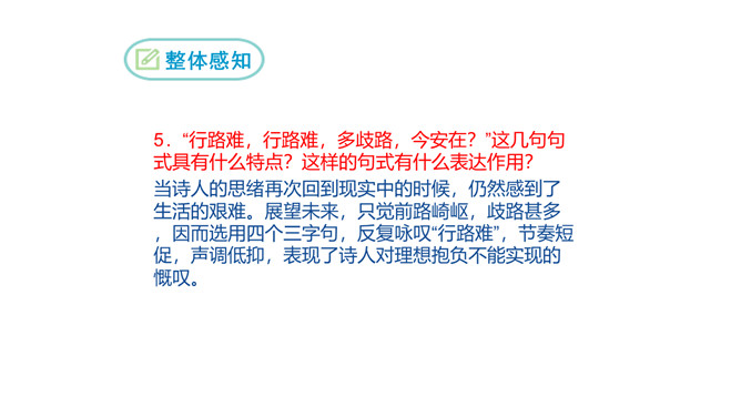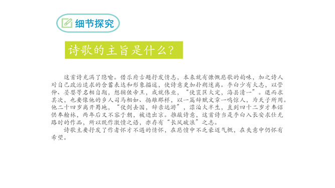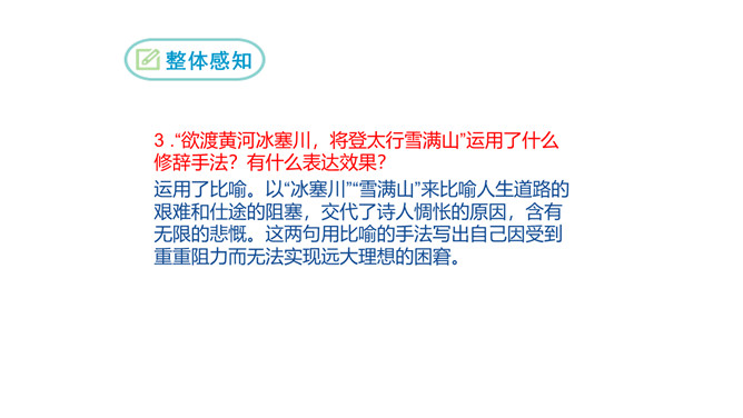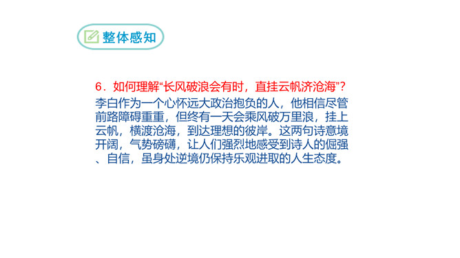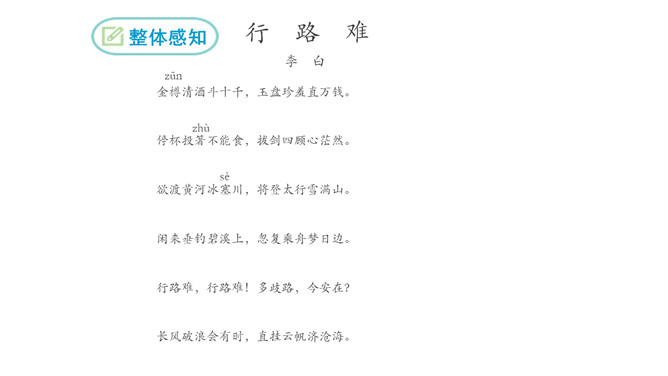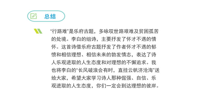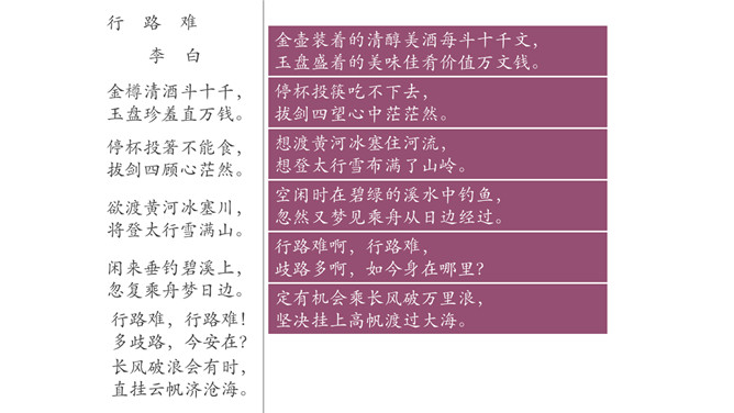 这首诗充满了隐喻。借乐府古题抒发情志,本来就有慷慨悲歌的韵味,加之诗人对自己政治追求的含蓄表达和形象描述,使诗意更加扑朔迷离。李白少有大志,以管仲、晏婴等名相自期,想辅佐帝王,成就伟业,“使寰区大定,海县清一”。退而求其次,也要像他的乡人司马相如、扬雄那样,以一篇辞赋文章一鸣惊人,为天子所用。他二十四岁离开蜀地,“仗剑去国,辞亲远游”,漂泊大半生,直到四十二岁才奉诏供奉翰林,两年后又不容于朝,被迫出京。推敲诗意,这首诗当是李白入长安求仕无路时的作品,所以既作激愤之语,亦存有“长风破浪”之志。所属专题:行路难ppt。