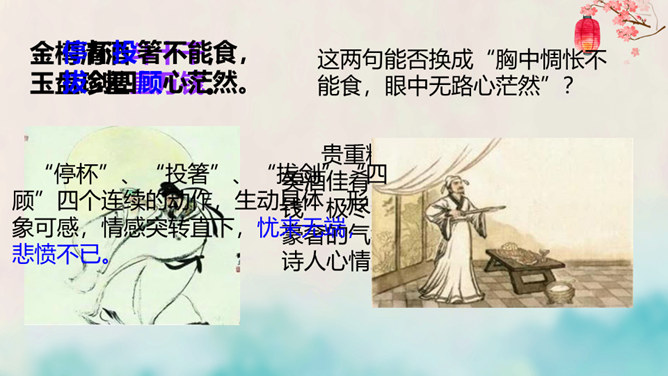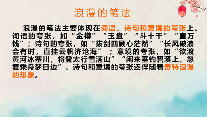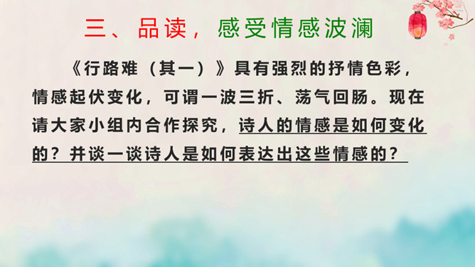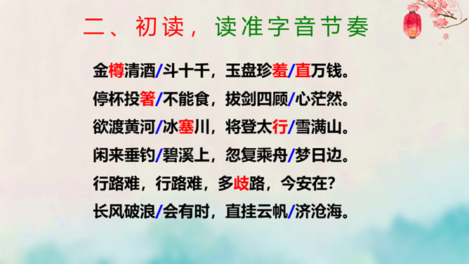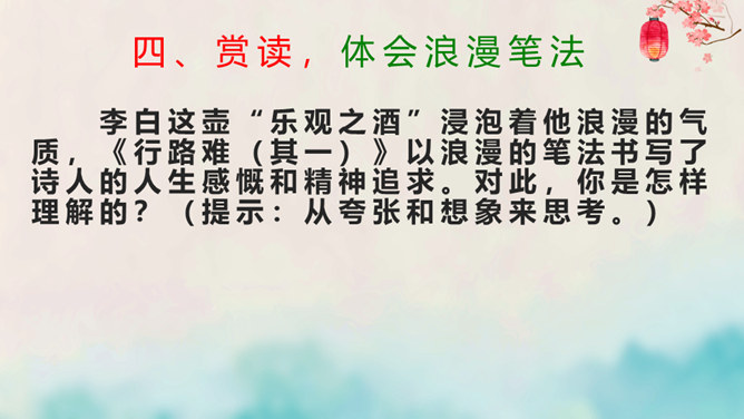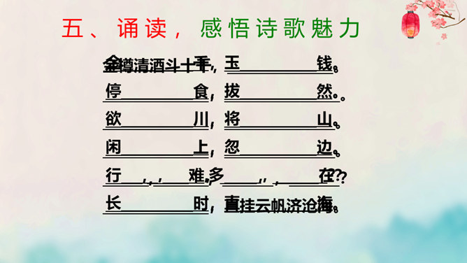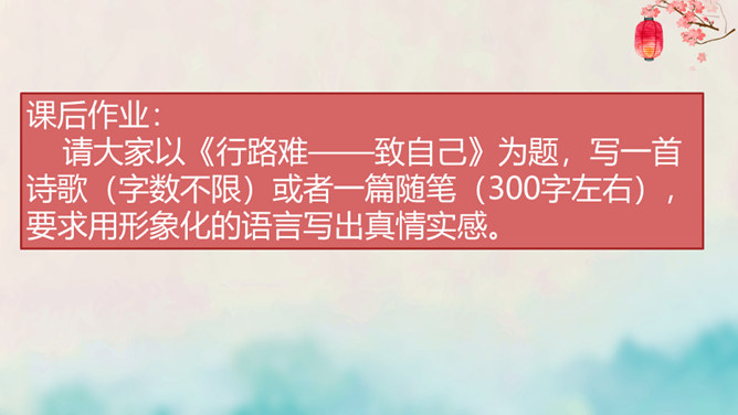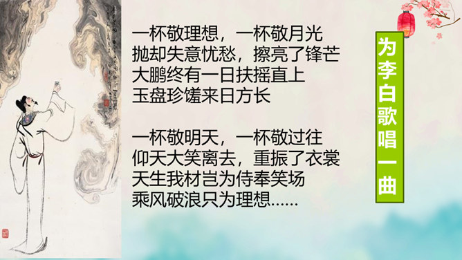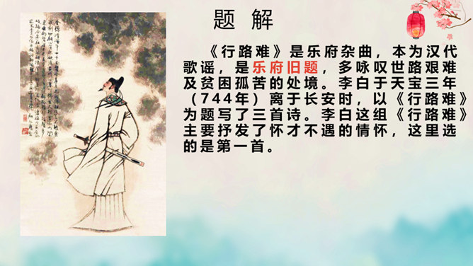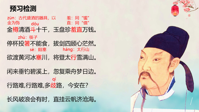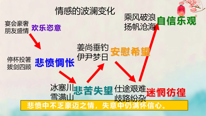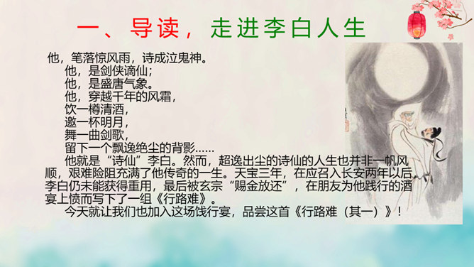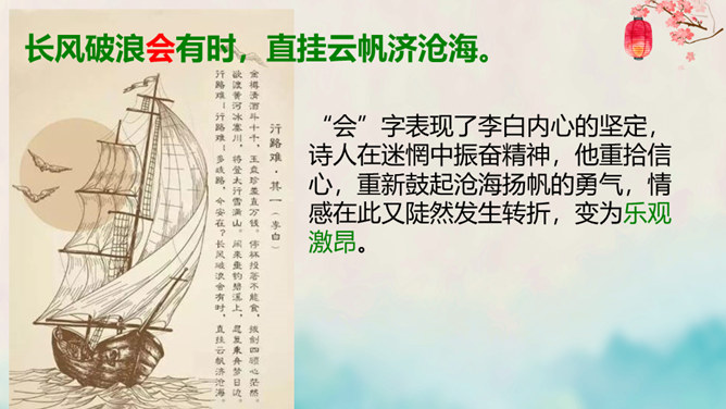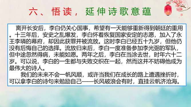 离开长安后,李白仍关心国事,希望有一天能够重新得到朝廷的重用。十三年后,安史之乱爆发,李白怀着恢复国家安定的志愿,加入了永王李璘的幕府,却因此获罪并被流放。这时李白已经五十九岁,但他仍没有后悔自己的选择。流放归来后,李白一度准备参加李光弼的军队,但中途忽然得病,未能如愿。两年之后,李白在当涂去世,时年六十二岁。可以说,李白的一生都与失败交织在一起,然而这并不妨碍他成为最伟大的诗人。我们的未来不会一帆风顺,或许当我们在成长的路上遭遇挫折时,可以拿李白的诗句来勉励自己——长风破浪会有时,直挂云帆济沧海。所属专题:行路难ppt。