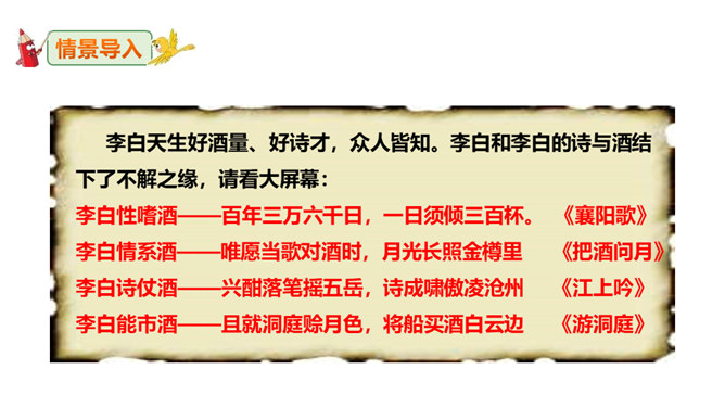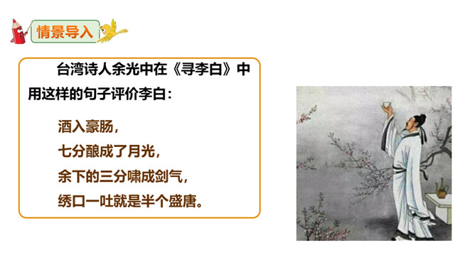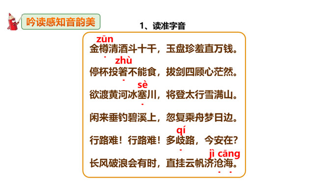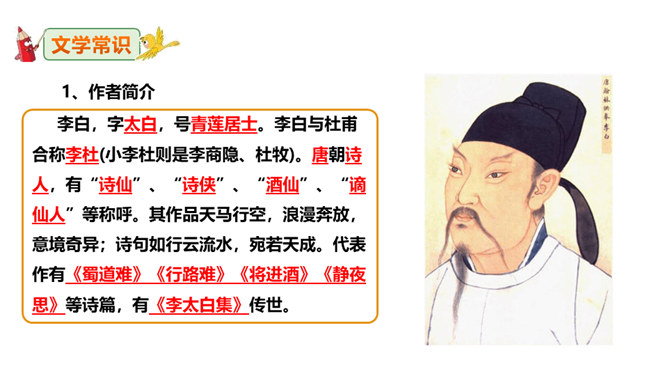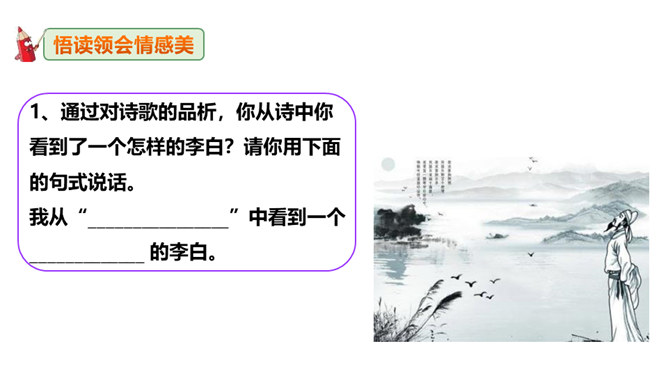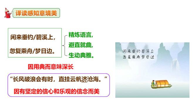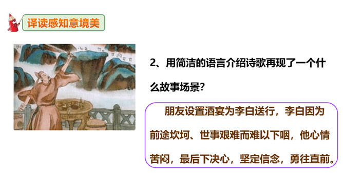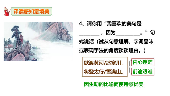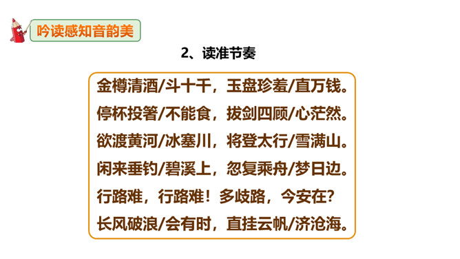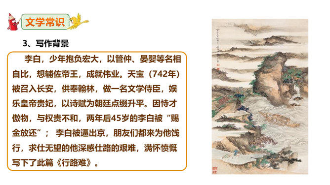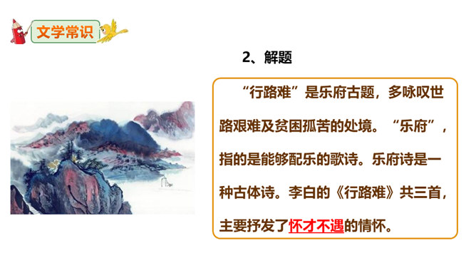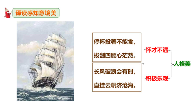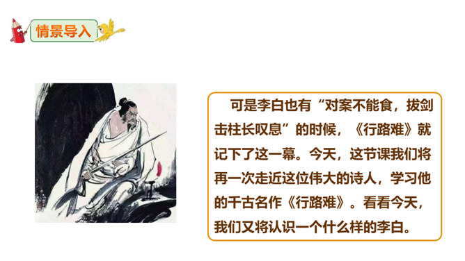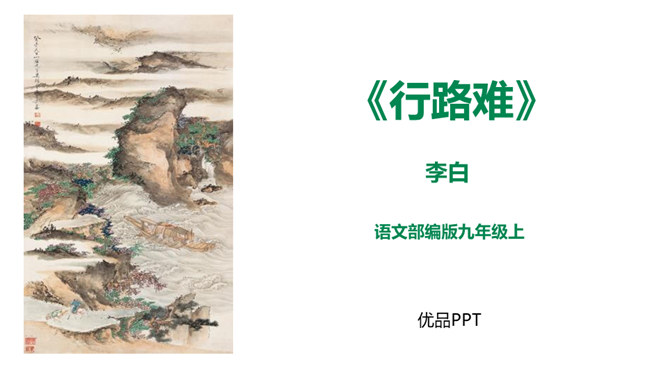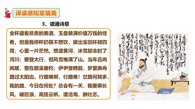 李白道“行路难”,却一直在走。走着笑对红尘,走着辞别故友。一壶浊酒,“歌遍山河八万里”;一叶轻舟,“惟见长江天际流”。渴望建功,他“仰天大笑出门去,我辈岂是蓬蒿人”;翰林遭贬,他“安能摧眉折腰事权贵,使我不得开心颜”。他一生命运多舛(chuǎn),却始终未停下脚步,因为他坚信“长风破浪会有时,直挂云帆济沧海”!请把自己假想成天宝三年黯然离开长安怀才不遇的李白,以人生独白的方式朗读并背诵这首诗。“闲来垂钓碧溪上,复乘舟梦日边”这句话在写法上最突出的特点是什么?所属专题:行路难ppt。