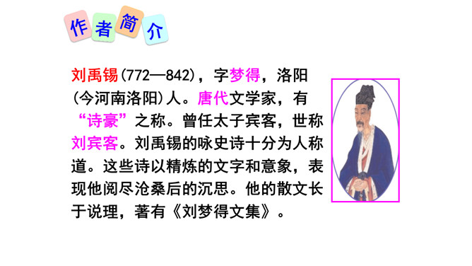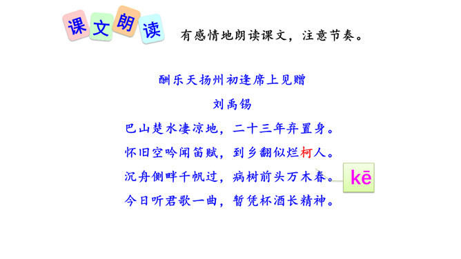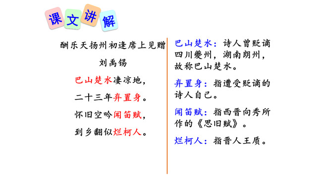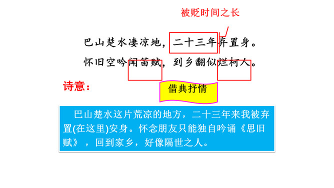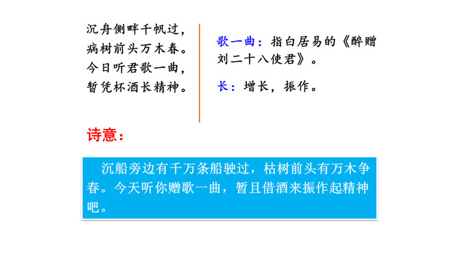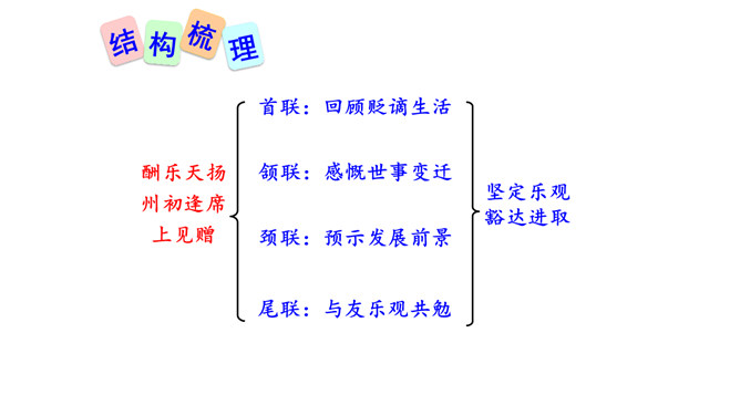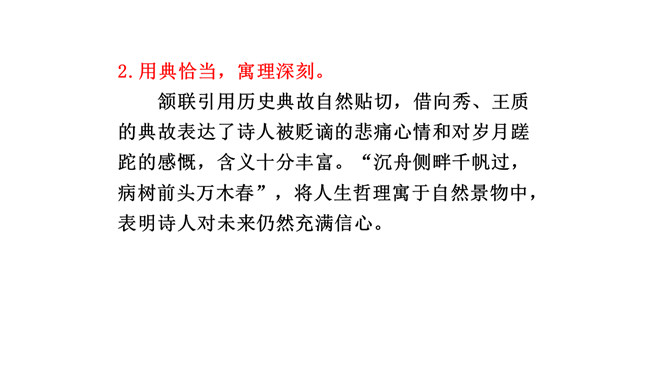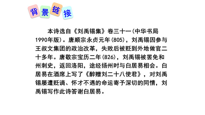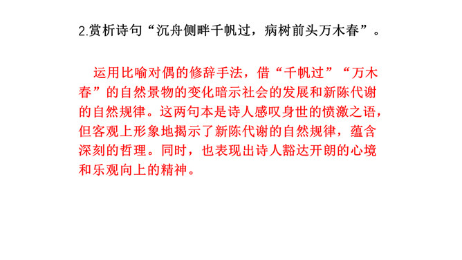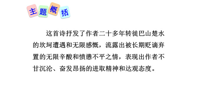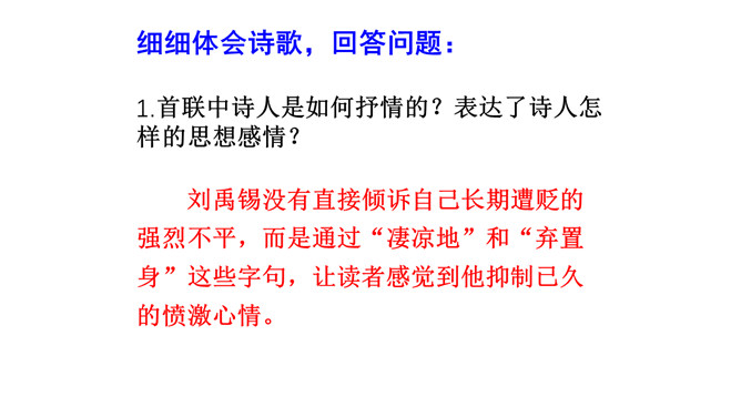 首联中诗人是如何抒情的?表达了诗人怎样的思想感情?刘禹锡没有直接倾诉自己长期遭贬的强烈不平,而是通过“凄凉地”和“弃置身”这些字句,让读者感觉到他抑制已久的愤激心情。赏析诗句“沉舟侧畔千帆过,病树前头万木春”。运用比喻对偶的修辞手法,借“千帆过”“万木春”的自然景物的变化暗示社会的发展和新陈代谢的自然规律。这两句本是诗人感叹身世的愤激之语,但客观上形象地揭示了新陈代谢的自然规律,蕴含深刻的哲理。同时,也表现出诗人豁达开朗的心境和乐观向上的精神。所属专题:酬乐天扬州初逢席上见赠ppt。