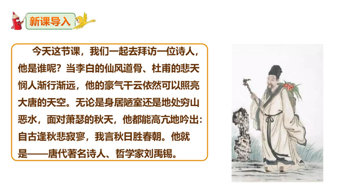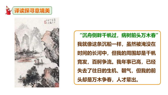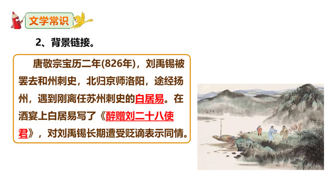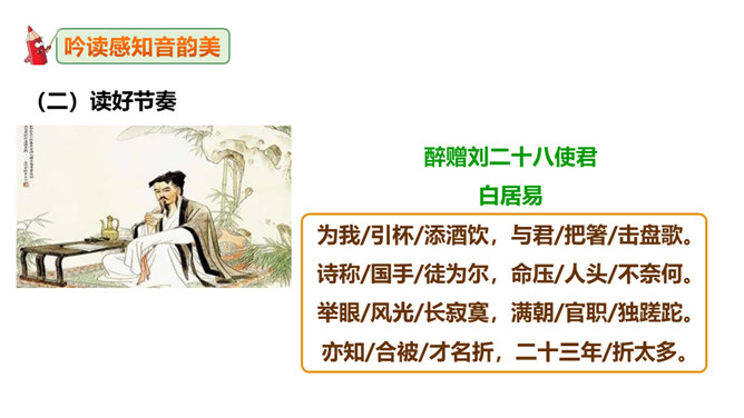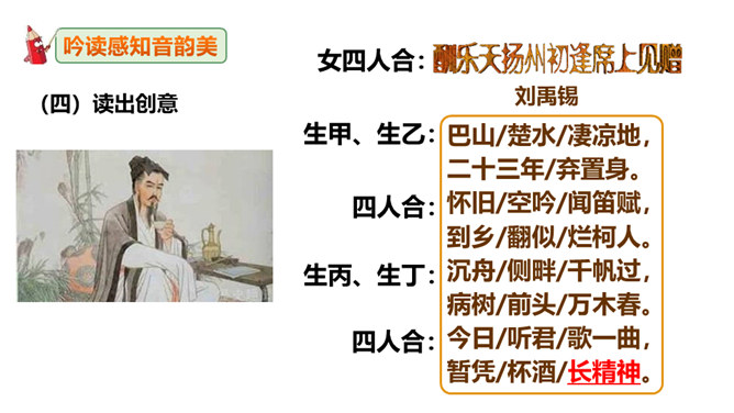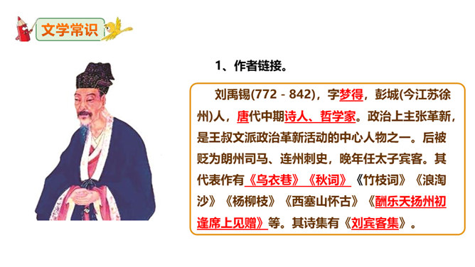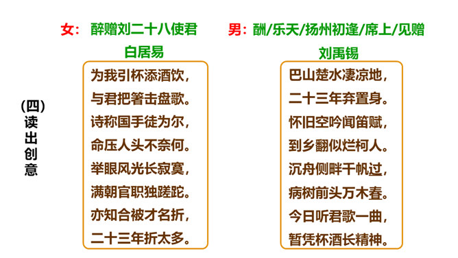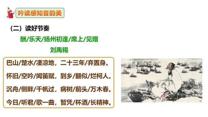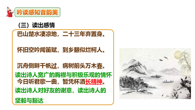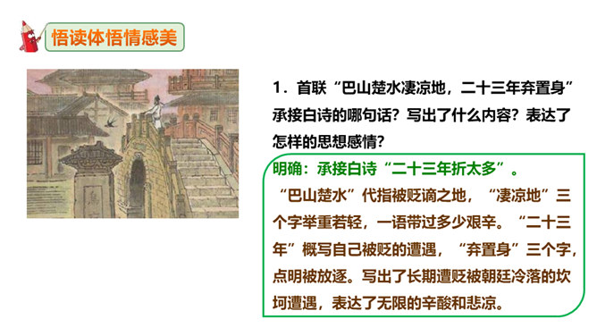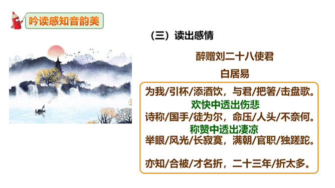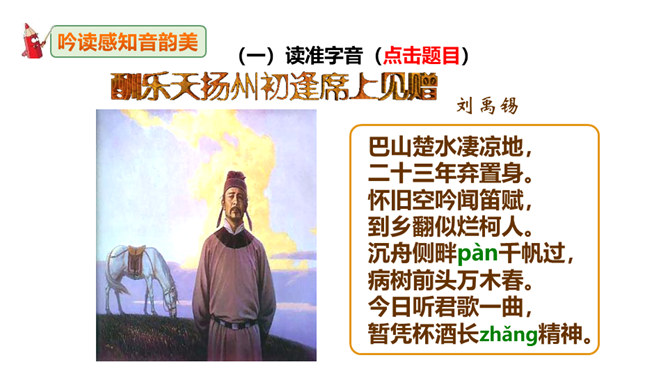 这句诗表现了作者怎样的思想情怀?明确:至此,刘禹锡的真正思想才显露出来。白诗的意思是你长守寂寞独自蹉跎,真令人悲叹不已;而刘诗的意思是反过来劝慰白居易不必为自己的寂寞蹉跎而忧伤;对世事的变迁和仕宦的升沉,作者表达了乐观进取、积极向上的人生态度,表现出开朗、豁达、乐观、坦荡的气魄和襟怀。此联被后人赋予的哲理意义是什么?明确:坎坷是暂时的,光明和希望必将到来,新的事物必将取代旧的事物。尾联“今日听君歌一曲,暂凭杯酒长精神”有什么作用?所属专题:酬乐天扬州初逢席上见赠ppt。