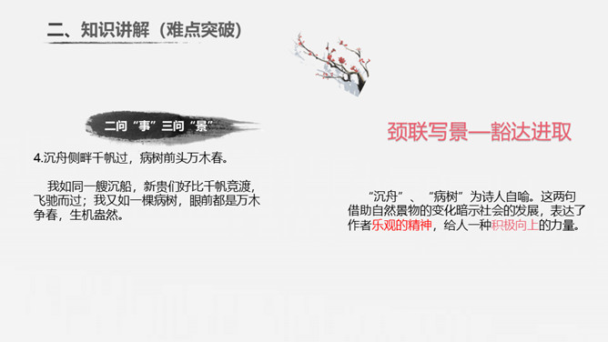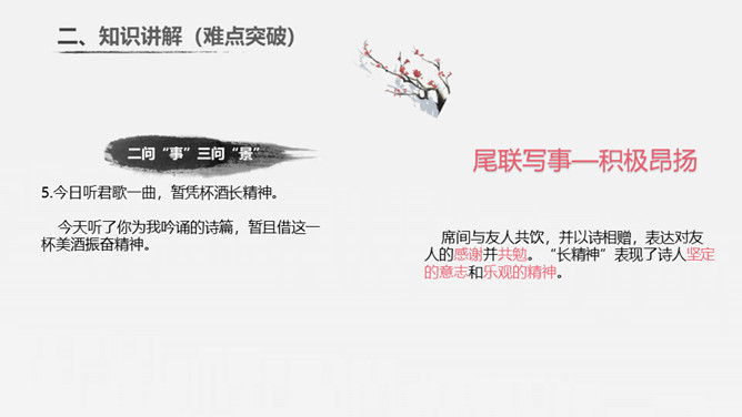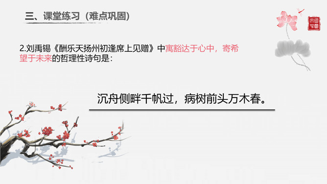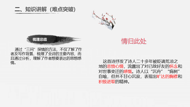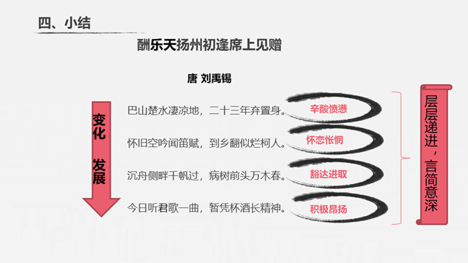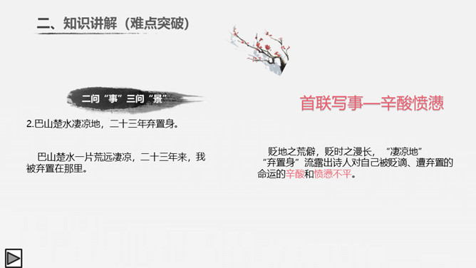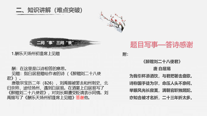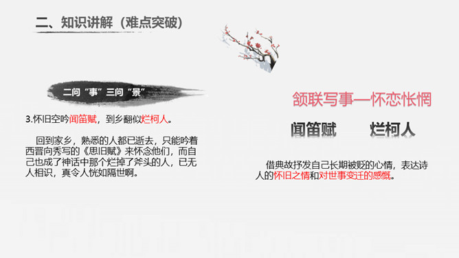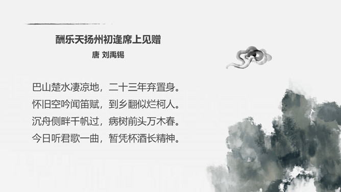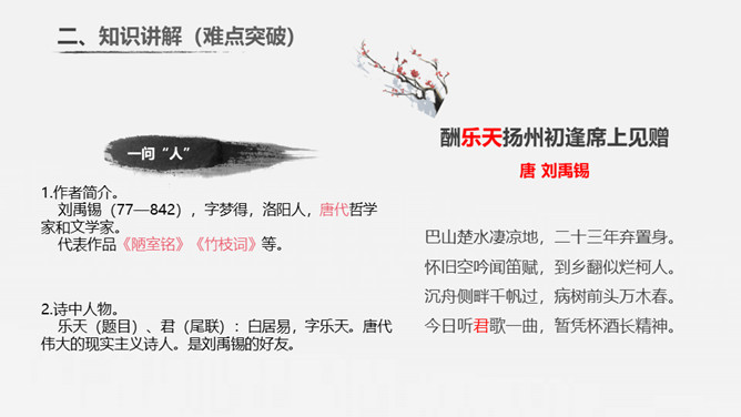 如何领会诗歌中诗人所要抒发的思想感情?贬地之荒僻,贬时之漫长,“凄凉地”“弃置身”流露出诗人对自己被贬谪、遭弃置的命运的辛酸和愤懑不平。回到家乡,熟悉的人都已逝去,只能吟着西晋向秀写的《思旧赋》来怀念他们,而自己也成了神话中那个烂掉了斧头的人,已无人相识,真令人恍如隔世啊。借典故抒发自己长期被贬的心情,表达诗人的怀旧之情和对世事变迁的感慨。通过“三问”探情的方法,不仅了解了作者及写作背景、梳理了全诗的主要内容,而且通过分析,理解了作者想要表达的思想感情。所属专题:酬乐天扬州初逢席上见赠ppt。