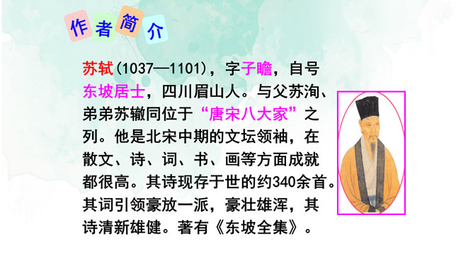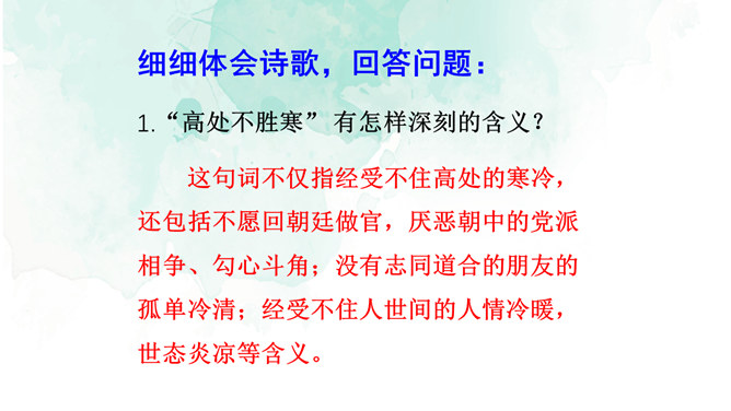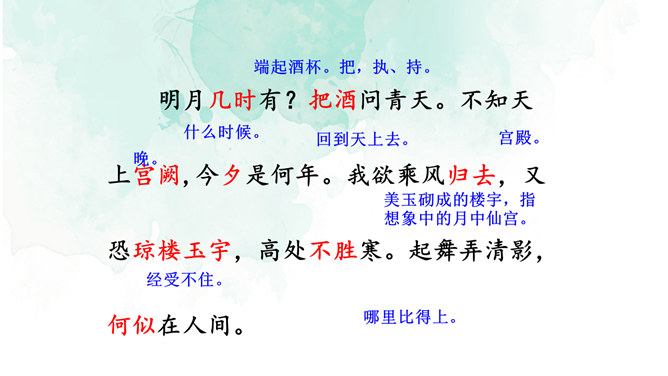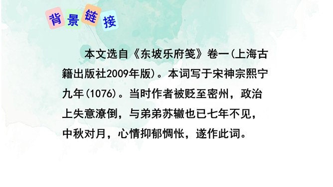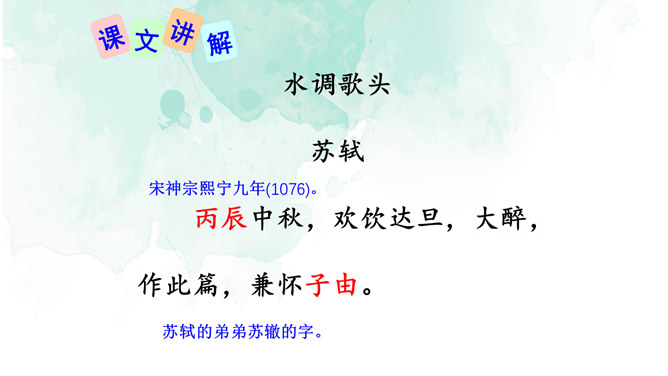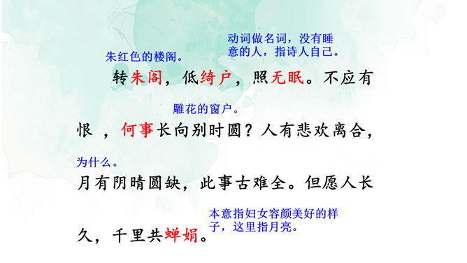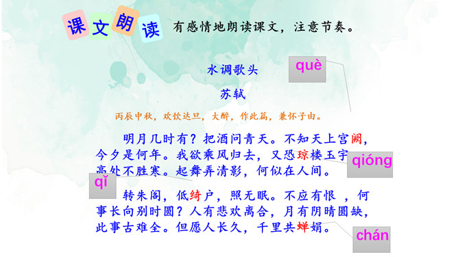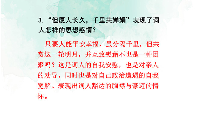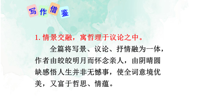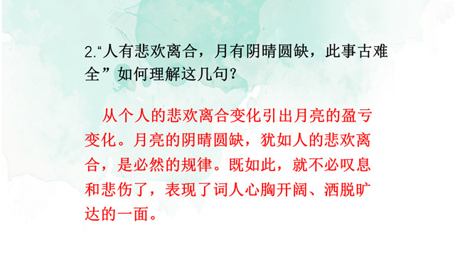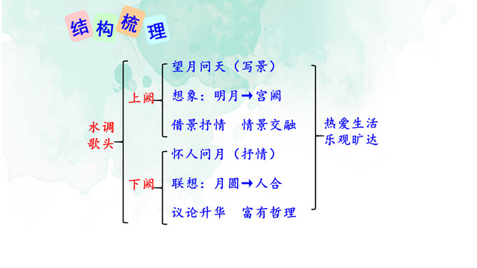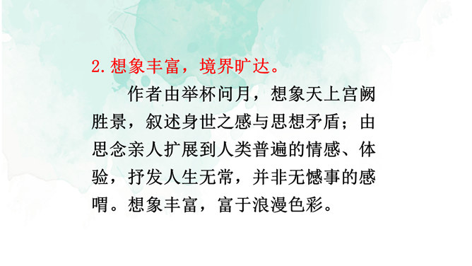 1.情景交融,寓哲理于议论之中。全篇将写景、议论、抒情融为一体,作者由皎皎明月而怀念亲人,由阴晴圆缺感悟人生并非无憾事,使全词意境优美,又富于哲思、情蕴。2.想象丰富,境界旷达。作者由举杯问月,想象天上宫阙胜景,叙述身世之感与思想矛盾;由思念亲人扩展到人类普遍的情感、体验,抒发人生无常,并非无憾事的感喟。想象丰富,富于浪漫色彩。这首词上阕写词人对月饮酒,下阕写对月怀人。反映了词人宦海失意的苦闷,也表现了词人对美好生活的向往和乐观旷达的胸襟。所属专题:水调歌头ppt。