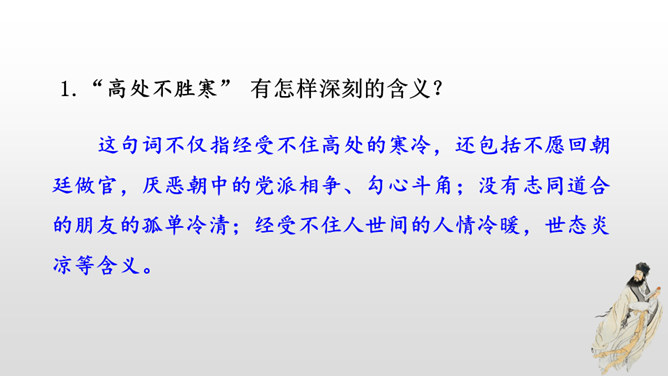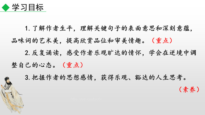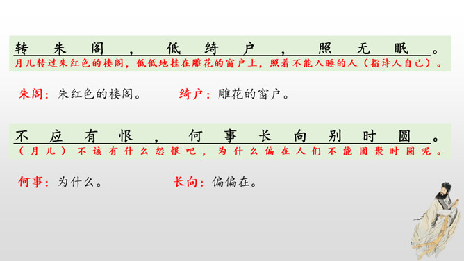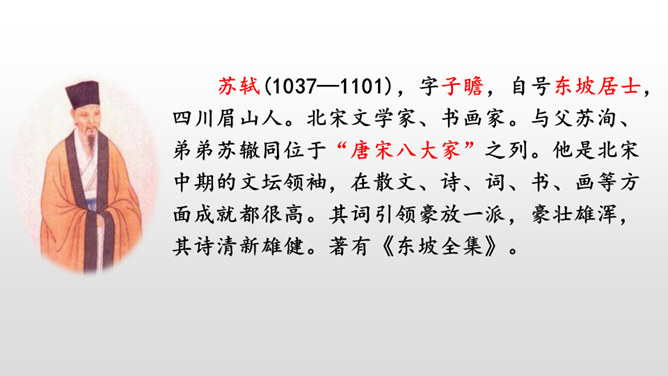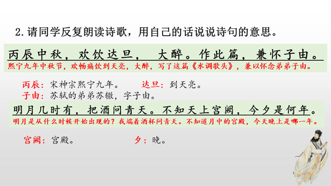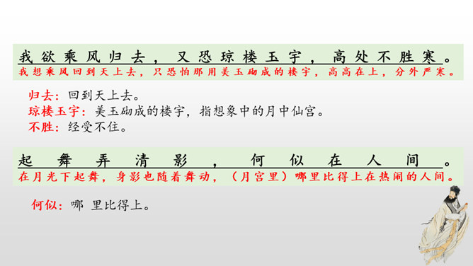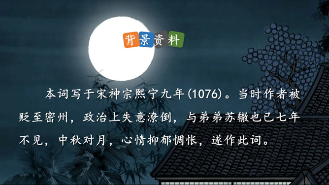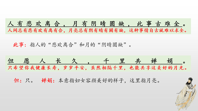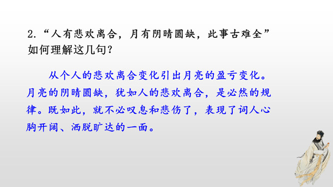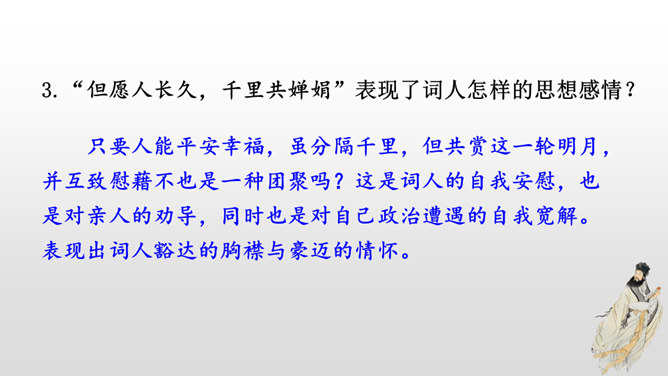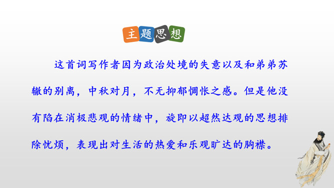 这首词写作者因为政治处境的失意以及和弟弟苏辙的别离,中秋对月,不无抑郁惆怅之感。但是他没有陷在消极悲观的情绪中,旋即以超然达观的思想排除忧烦,表现出对生活的热爱和乐观旷达的胸襟。感悟:一个人,无论面临怎样的逆境和挫折,都要以一颗乐观向上的心来对待生活,垂头丧气、一蹶不振并不能解决问题。要明白:逆境过后是顺境,冬天过后是春天;冬天来了,春天还会远吗?全篇将写景、议论、抒情融为一体,作者由皎皎明月而怀念亲人,由阴晴圆缺感悟人生并非无憾事,使全词意境优美,又富于哲思、情蕴。所属专题:水调歌头ppt。
