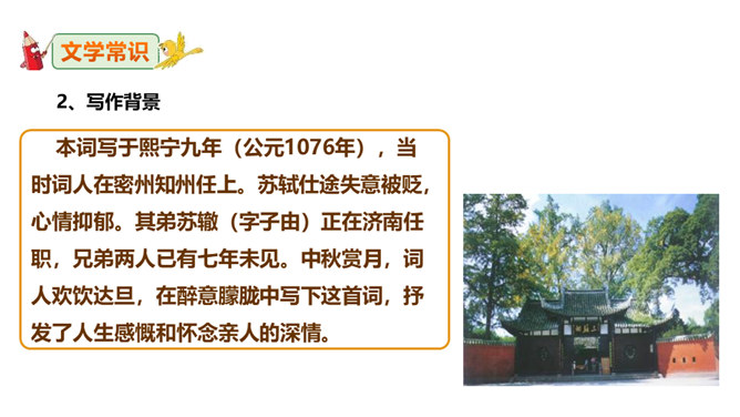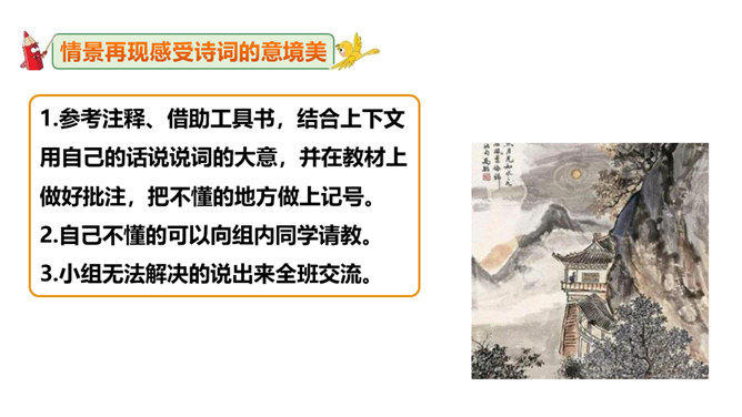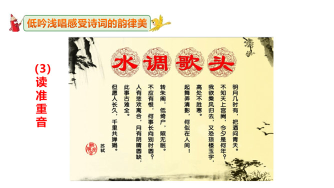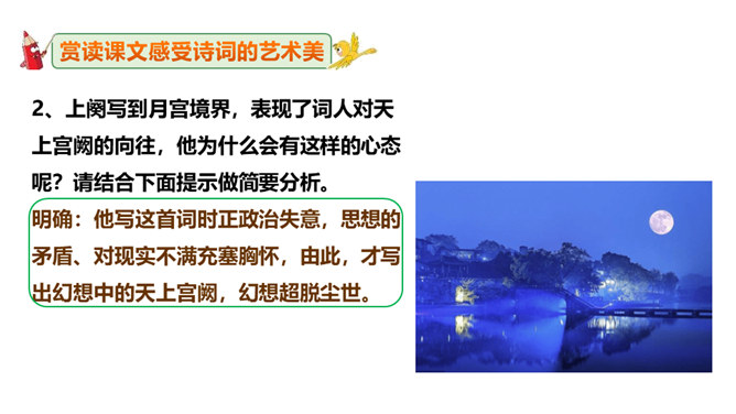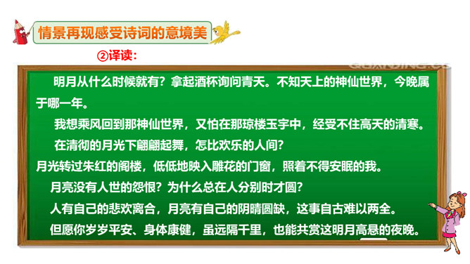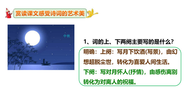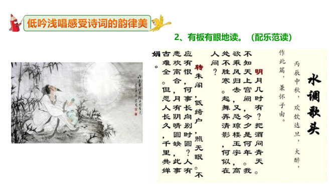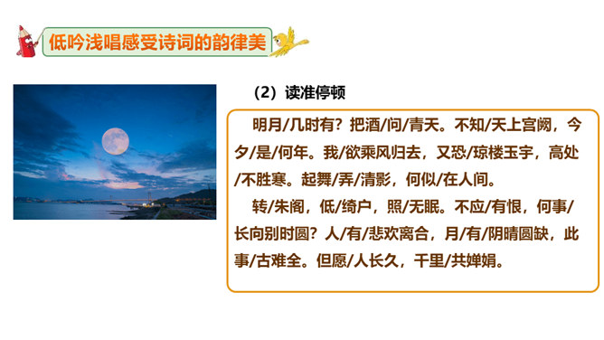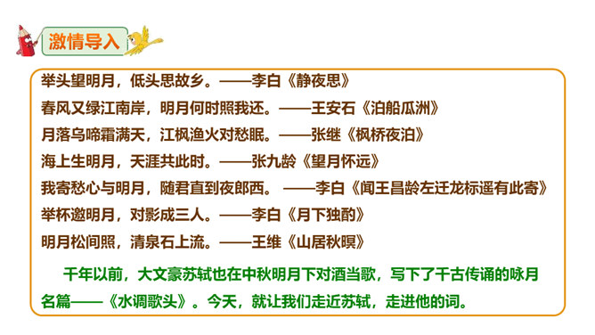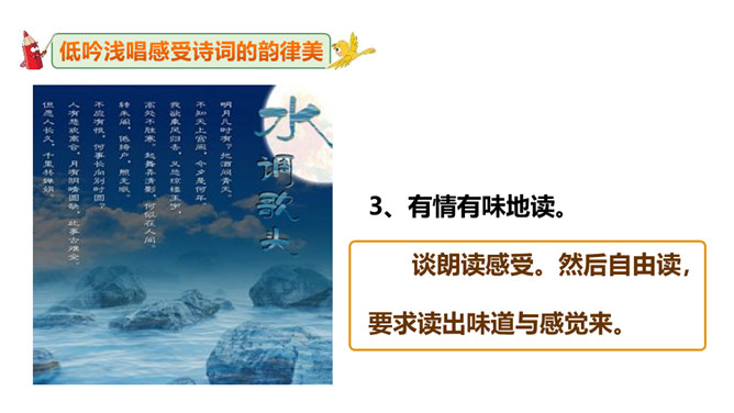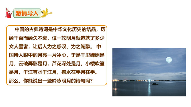 中国的古典诗词是中华文化历史的结晶,历经千百而经久不衰,仅一轮明月就造就了多少文人墨客,让后人为之感叹、为之陶醉。 中国诗人眼中的月亮一片冰心,于是千里婵娟是月,云破弄影是月,芦花深处是月,小楼吹笙是月,千江有水千江月,掬水在手月在手。 那么,你能说出一些吟咏明月的诗句吗?谈朗读感受。然后自由读,要求读出味道与感觉来。1.参考注释、借助工具书,结合上下文用自己的话说说词的大意,并在教材上做好批注,把不懂的地方做上记号。2.自己不懂的可以向组内同学请教。3.小组无法解决的说出来全班交流。所属专题:水调歌头ppt。