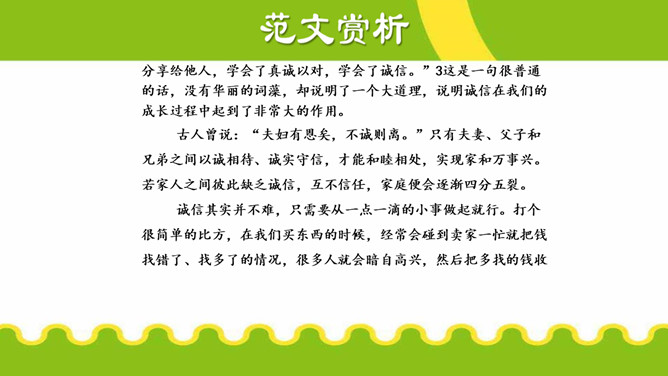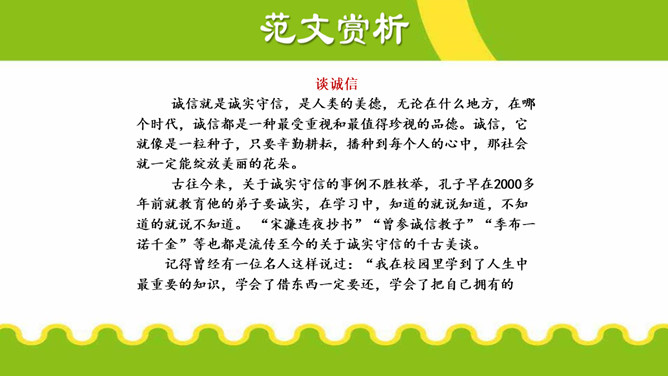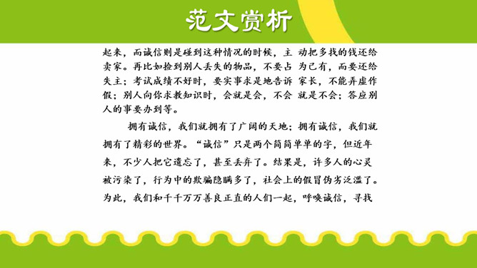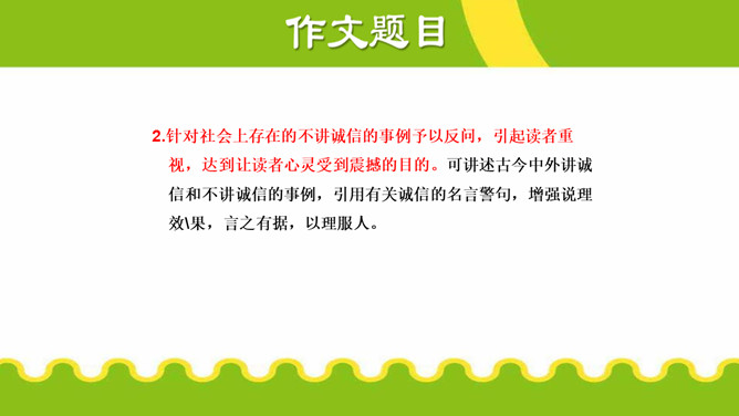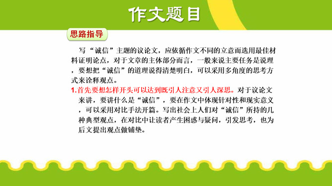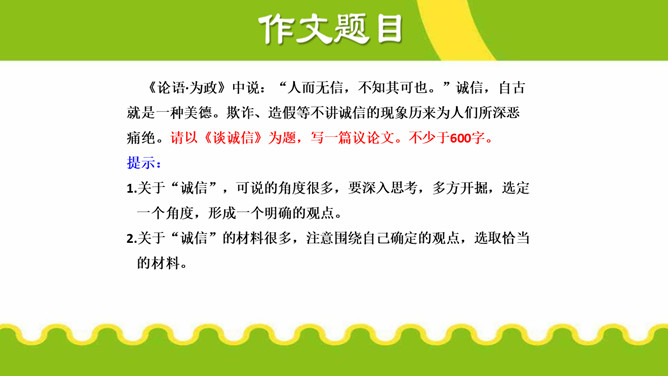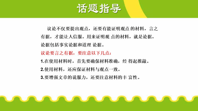 议论不仅要提出观点,还要有能证明观点 的材料,言之有据,才能让人信服。用来证明观 点的材料,就是论据。论据包括事实论据和道理 论据。议论要言之有据,要注意以下几点:1.在使用材料时,首先要确保材料准确,经 得起推敲。2.使用材料,还应保证材料与观点一致。3.要增强文章的说服力,还要注意材料的丰 富性。写 “诚信”主题的议论文,应依循作文不同的立意而选用最佳材料证明论点,对于文章的主体部分而言,一般来说主要任务是说理,要想把“诚信”的道理说得清楚明白,可以采用多角度的思考方式来诠释观点。所属专题:议论要言之有据ppt。