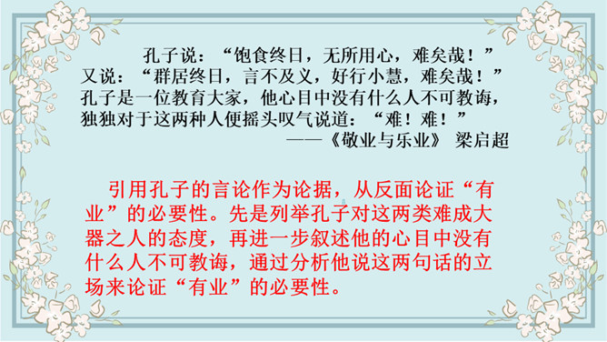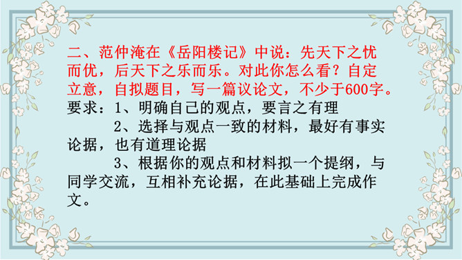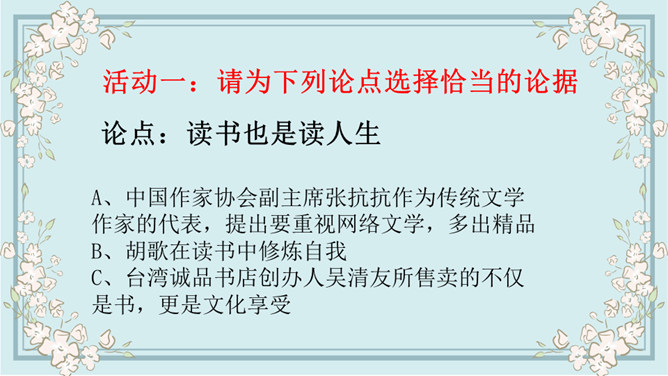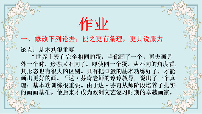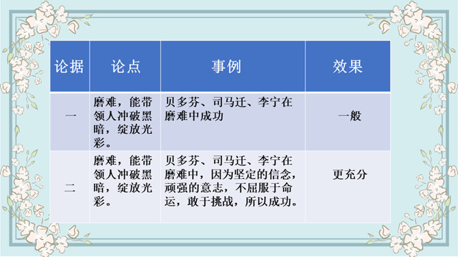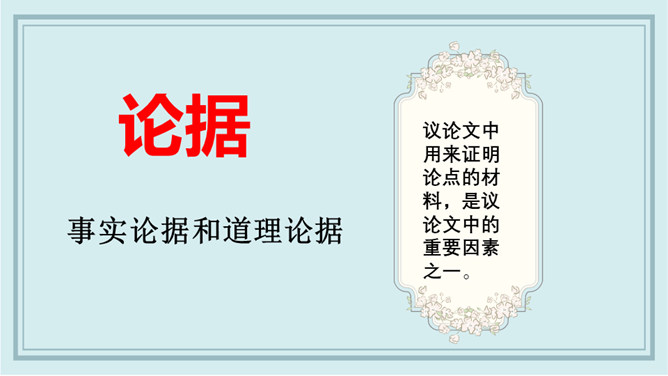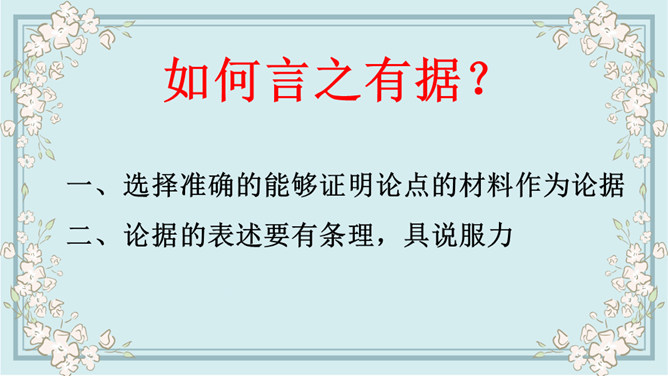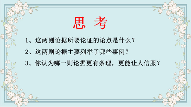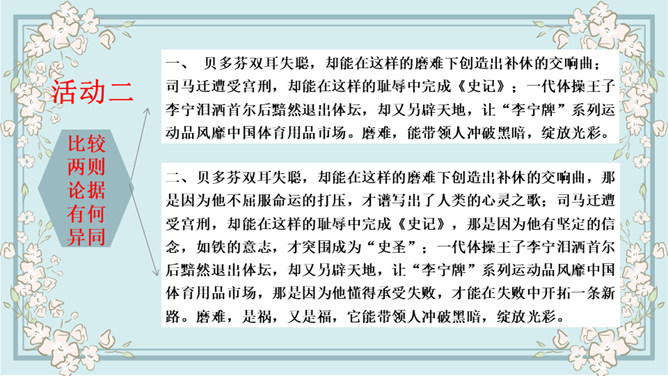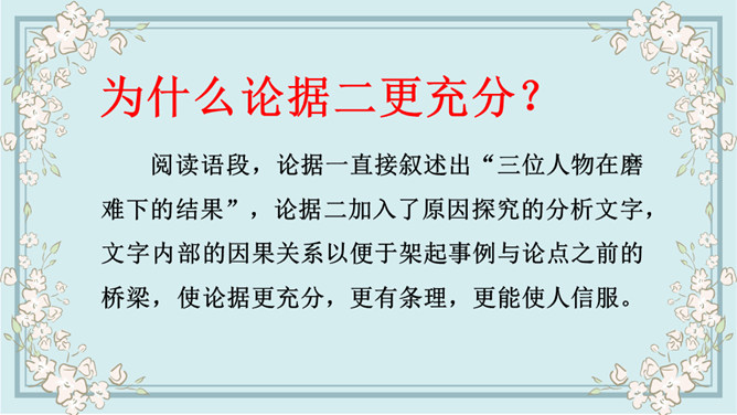 事实论据和道理论据:议论文中用来证明论点的材料,是议论文中的重要因素之一。如何言之有据?一、选择准确的能够证明论点的材料作为论据。二、论据的表述要有条理,具说服力。1、这两则论据所要论证的论点是什么?2、这两则论据主要列举了哪些事例?3、你认为哪一则论据更有条理,更能让人信服?为什么论据二更充分?阅读语段,论据一直接叙述出“三位人物在磨难下的结果”,论据二加入了原因探究的分析文字,文字内部的因果关系以便于架起事例与论点之前的桥梁,使论据更充分,更有条理,更能使人信服。所属专题:议论要言之有据ppt。