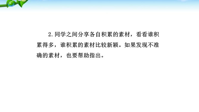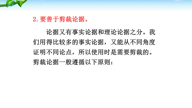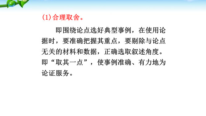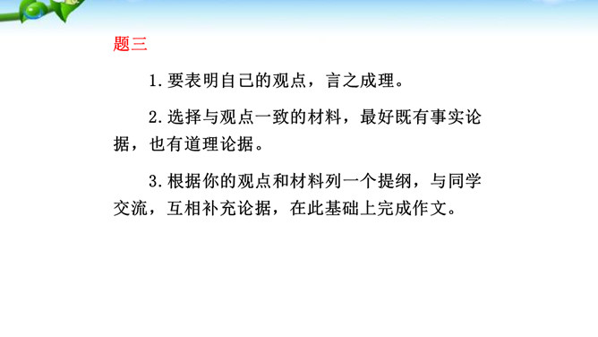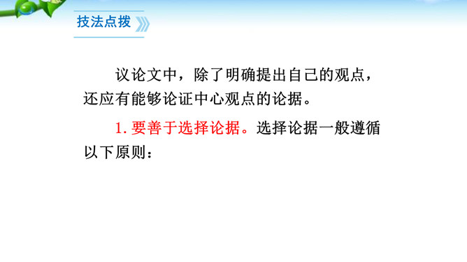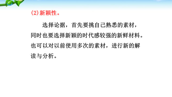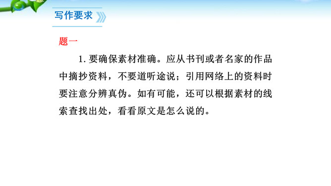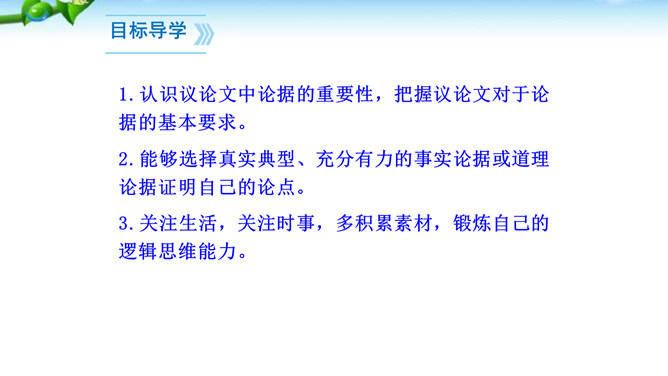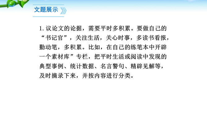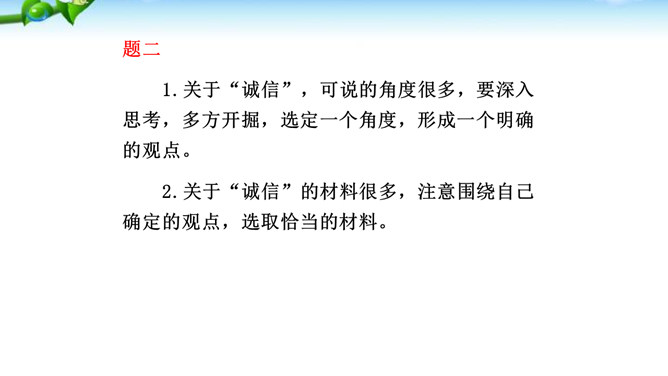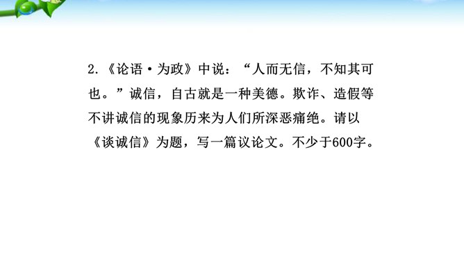 认识议论文中论据的重要性,把握议论文对于论据的基本要求。能够选择真实典型、充分有力的事实论据或道理论据证明自己的论点。关注生活,关注时事,多积累素材,锻炼自己的逻辑思维能力。议论文的论据,需要平时多积累。要做自己的“书记官”,关注生活,关心时事,多读书看报,勤动笔,多积累。比如,在自己的练笔本中开辟一个素材库”专栏,把平时生活或阅读中发现的典型事例、统计数据、名言警句、精辟见解等,及时摘录下来,并按内容进行分类。诚信,自古就是一种美德。欺诈、造假等不讲诚信的现象历来为人们所深恶痛绝。所属专题:议论要言之有据ppt。