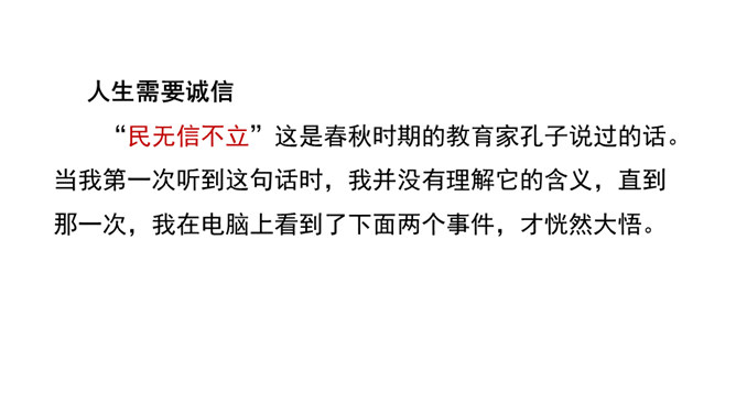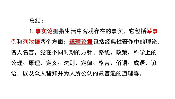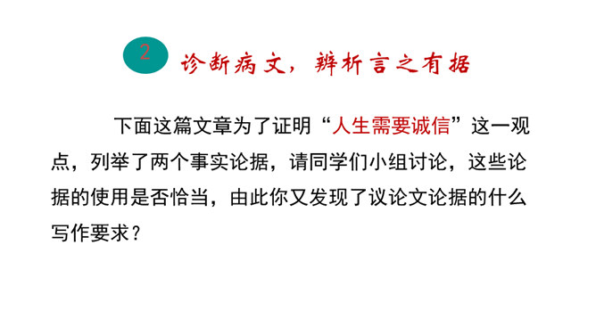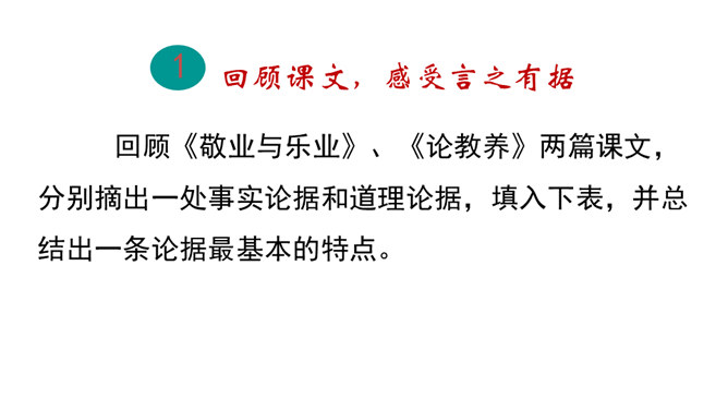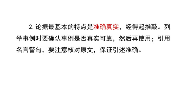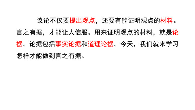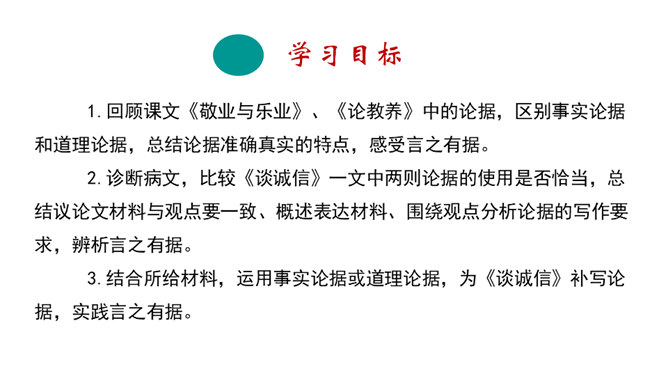 回顾课文《敬业与乐业》、《论教养》中的论据,区别事实论据和道理论据,总结论据准确真实的特点,感受言之有据。诊断病文,比较《谈诚信》一文中两则论据的使用是否恰当,总结议论文材料与观点要一致、概述表达材料、围绕观点分析论据的写作要求,辨析言之有据。结合所给材料,运用事实论据或道理论据,为《谈诚信》补写论据,实践言之有据。议论不仅要提出观点,还要有能证明观点的材料。言之有据,才能让人信服。用来证明观点的材料,就是论据。论据包括事实论据和道理论据。今天,我们就来学习怎样才能做到言之有据。所属专题:议论要言之有据ppt。