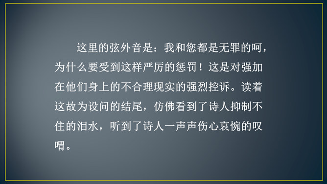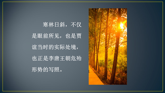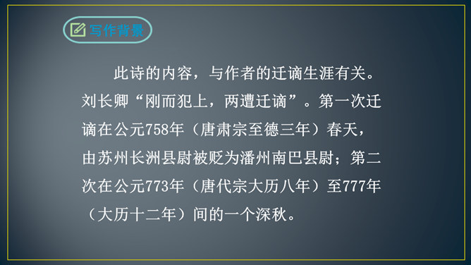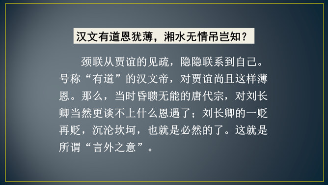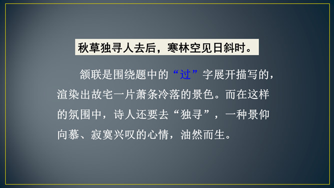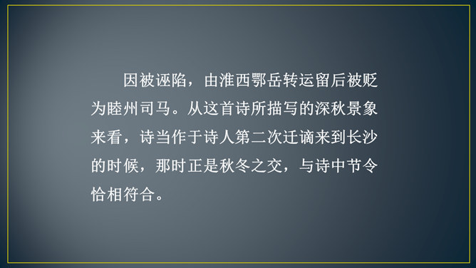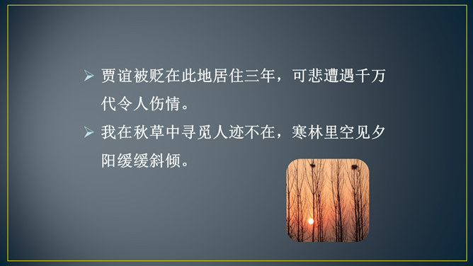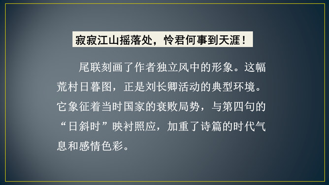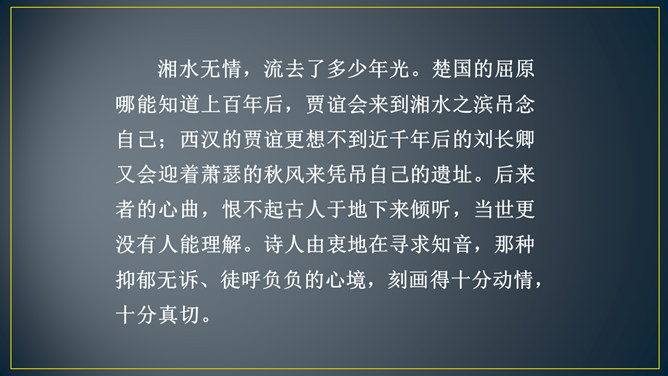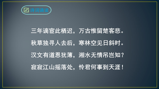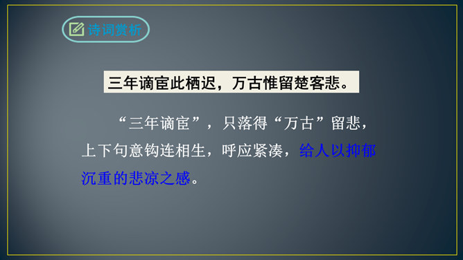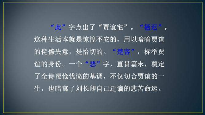 “三年谪宦”,只落得“万古”留悲,上下句意钩连相生,呼应紧凑,给人以抑郁沉重的悲凉之感。“此”字点出了“贾谊宅”。“栖迟”,这种生活本就是惊惶不安的,用以暗喻贾谊的侘傺失意,是恰切的。“楚客”,标举贾谊的身份。一个“悲”字,直贯篇末,奠定了全诗凄怆忧愤的基调,不仅切合贾谊的一生,也暗寓了刘长卿自己迁谪的悲苦命运。颔联是围绕题中的“过”字展开描写的,渲染出故宅一片萧条冷落的景色。而在这样的氛围中,诗人还要去“独寻”,一种景仰向慕、寂寞兴叹的心情,油然而生。所属专题:长沙过贾谊宅ppt。