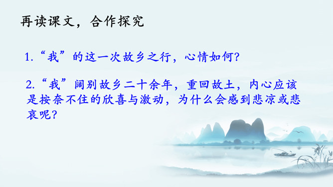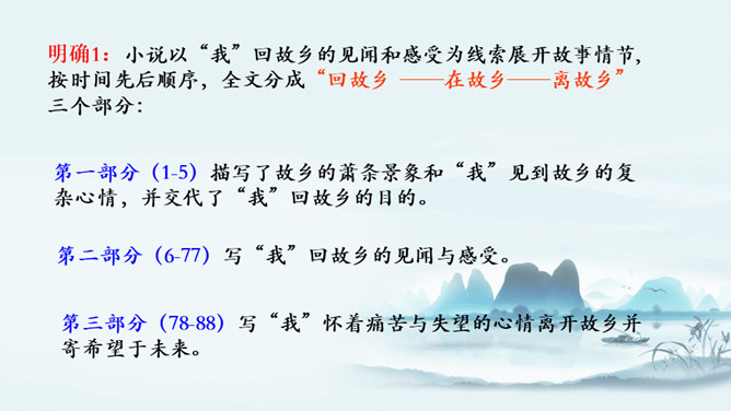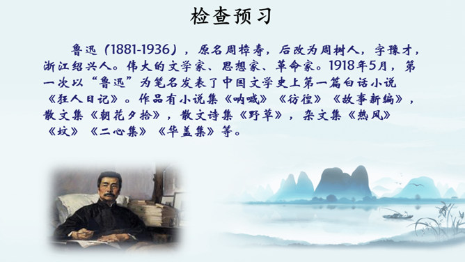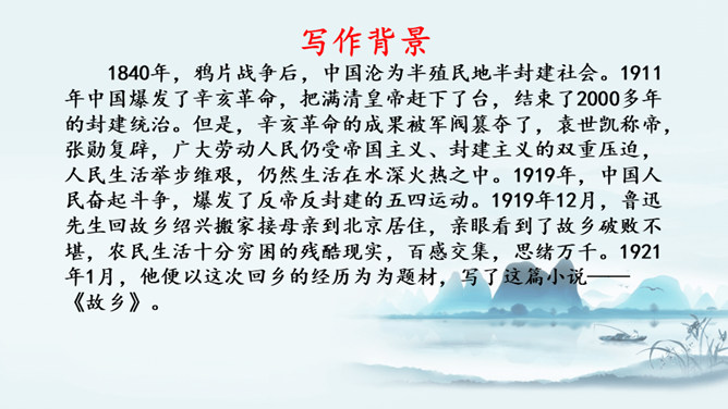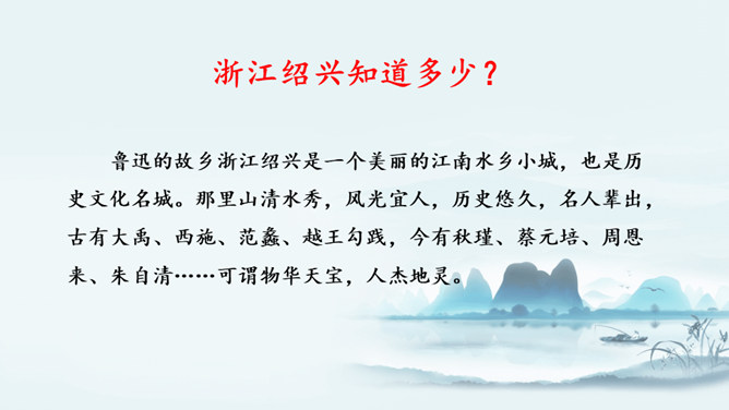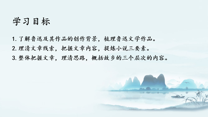 1.了解鲁迅及其作品的创作背景,梳理鲁迅文学作品。2.理清文章线索,把握文章内容,提炼小说三要素。3.整体把握文章,理清思路,概括故乡的三个层次的内容。鲁迅的故乡浙江绍兴是一个美丽的江南水乡小城,也是历史文化名城。那里山清水秀,风光宜人,历史悠久,名人辈出,古有大禹、西施、范蠡、越王勾践,今有秋瑾、蔡元培、周恩来、朱自清……可谓物华天宝,人杰地灵。1.小说的叙事线索是什么?理清小说的结构层次。2.作者在本文中都写了哪些人呢?本篇小说的主人公是谁?所属专题:故乡ppt。