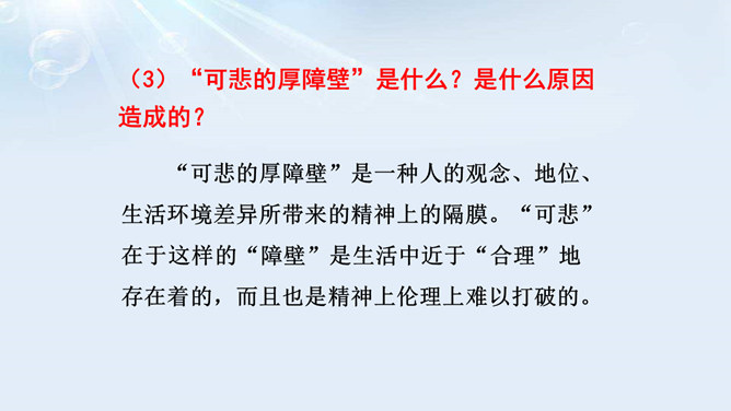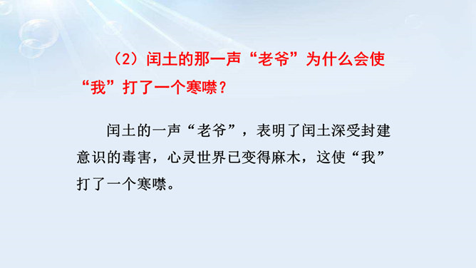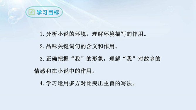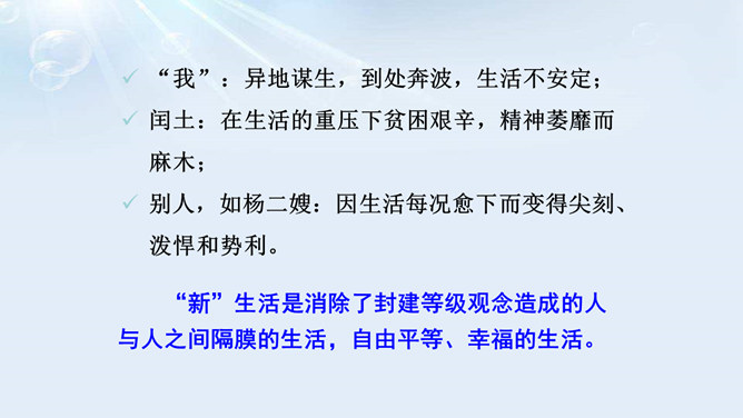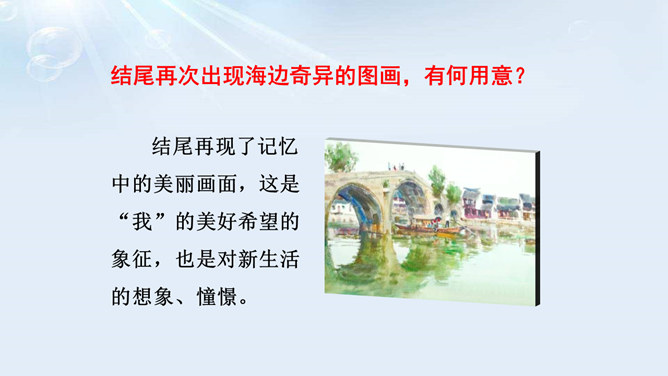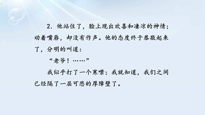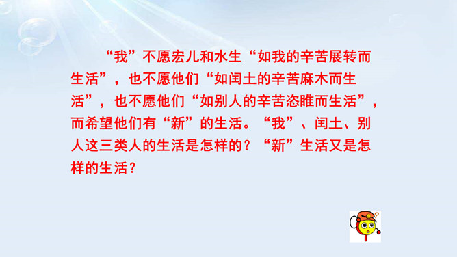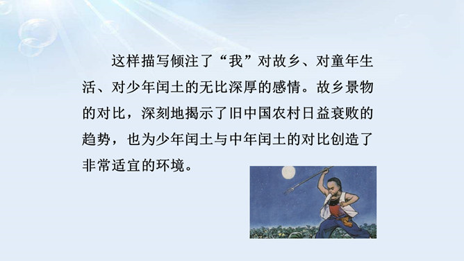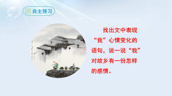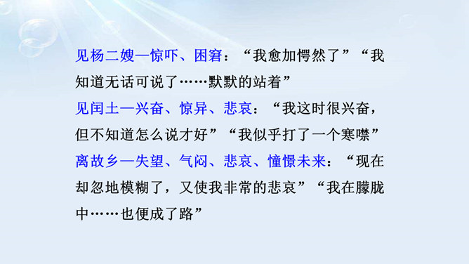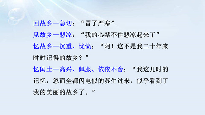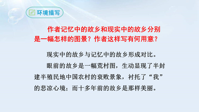 “我”不愿宏儿和水生“如我的辛苦展转而生活”,也不愿他们“如闰土的辛苦麻木而生活”,也不愿他们“如别人的辛苦恣睢而生活”,而希望他们有“新”的生活。“我”、闰土、别人这三类人的生活是怎样的?“新”生活又是怎样的生活? 作者记忆中的故乡和现实中的故乡分别是一幅怎样的图景?作者这样写有何用意? 现实中的故乡与记忆中的故乡形成对比。眼前的故乡是一幅荒村图,生动显现了半封建半殖民地中国农村的衰败景象,衬托了“我”的悲凉心境;而十多年前的故乡是那样美丽。所属专题:故乡ppt。