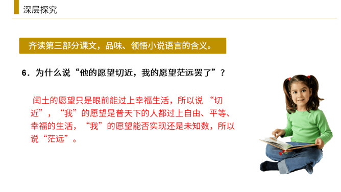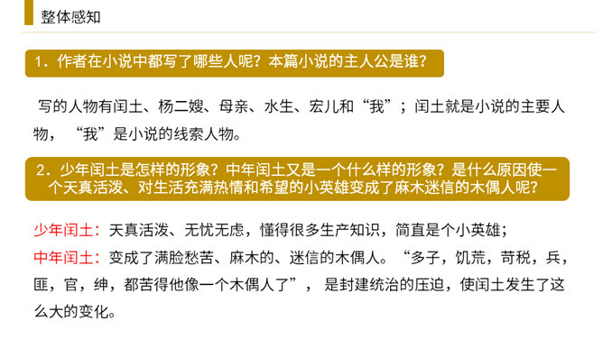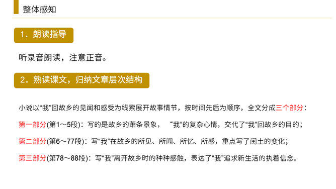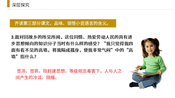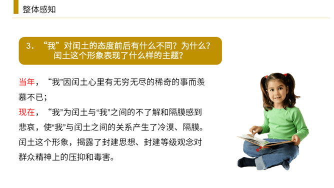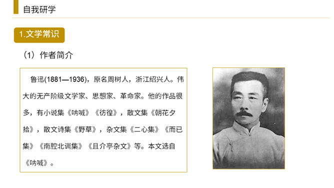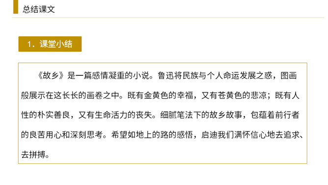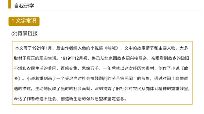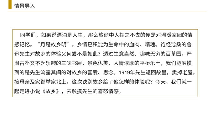 同学们,如果说漂泊是人生,那么旅途中人挥之不去的便是对温暖家园的情感记忆。“月是故乡明”,乡情已积淀为生命中的血肉、精魂。饱经沧桑的鲁迅先生对故乡的体验又何尝不是如此?透过生意盎然、趣味无穷的百草园,严肃古朴又不乏乐趣的三味书屋,景色优美、人情淳厚的平桥乐土,我们能触摸到的是先生流露其间的对故乡的喜爱、思念。1919年先生返回故里,卖掉老屋,接母亲及家眷举家北上。这次诀别故乡给了他怎样的体验呢?今天,我们就一起走进小说《故乡》,去触摸先生的喜怒情感。所属专题:故乡ppt。